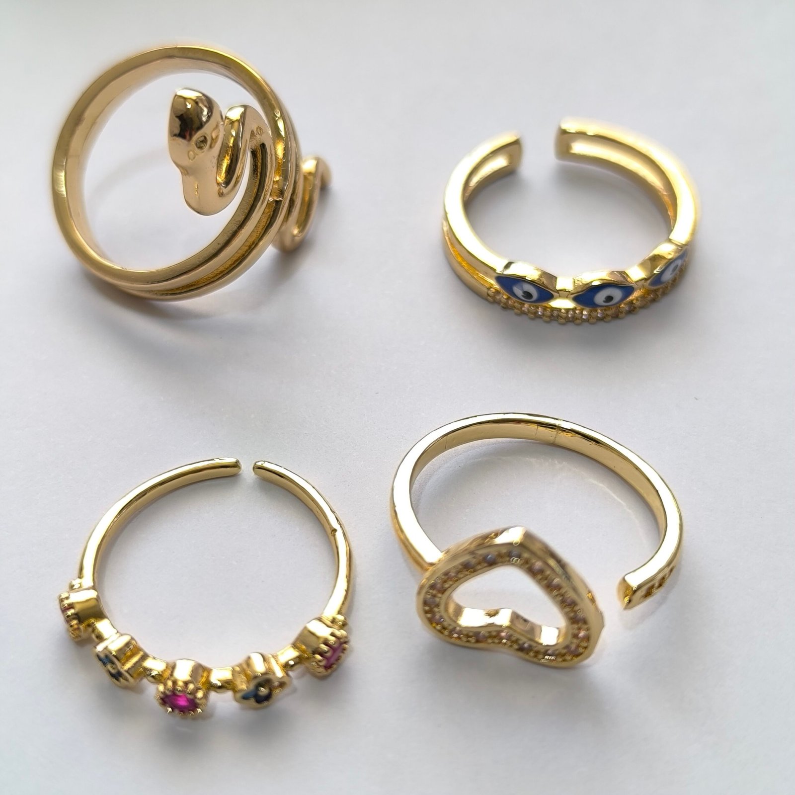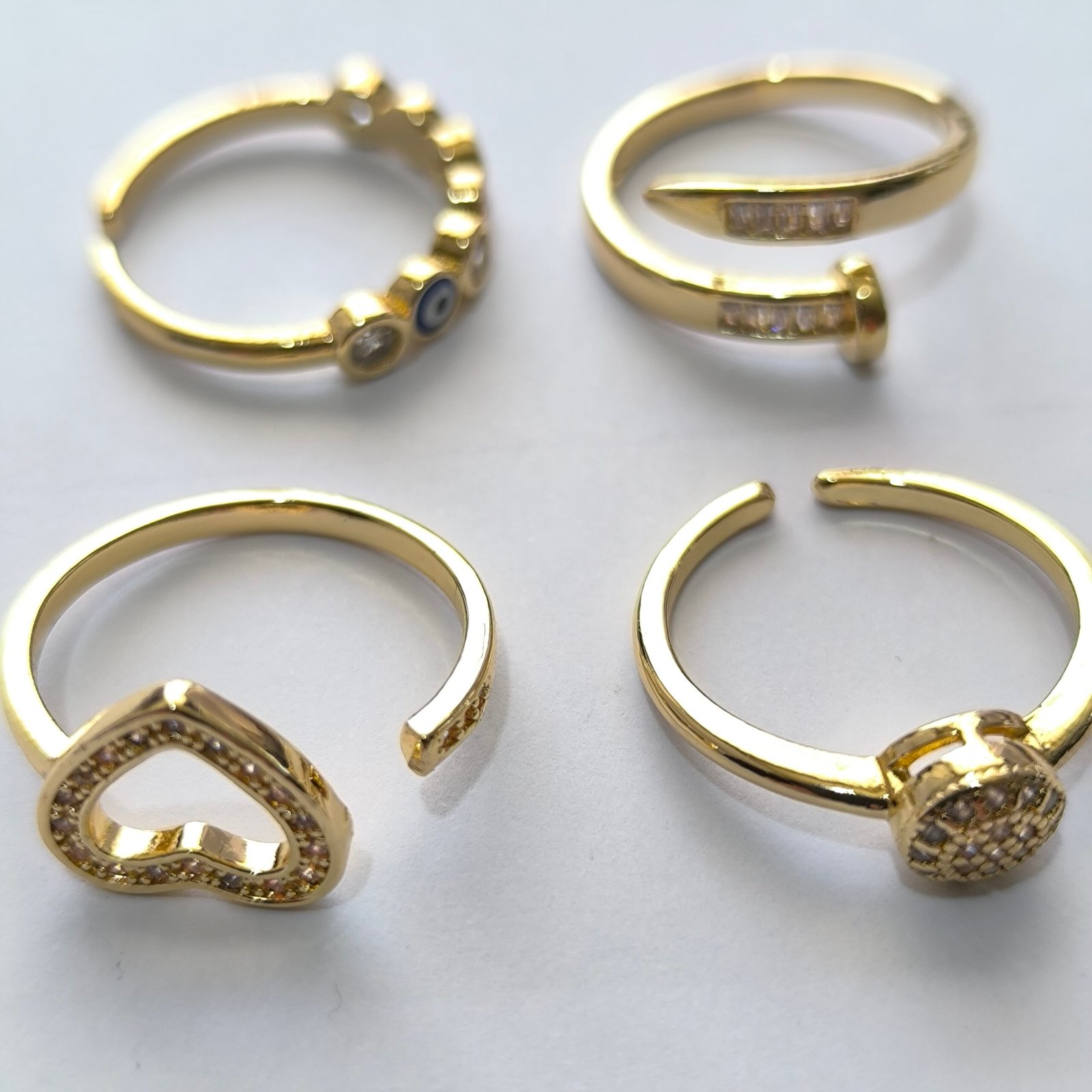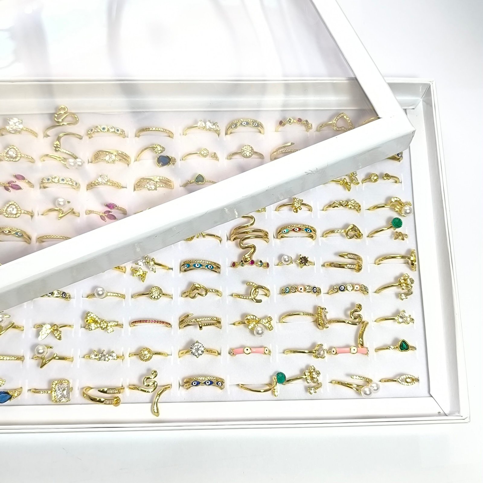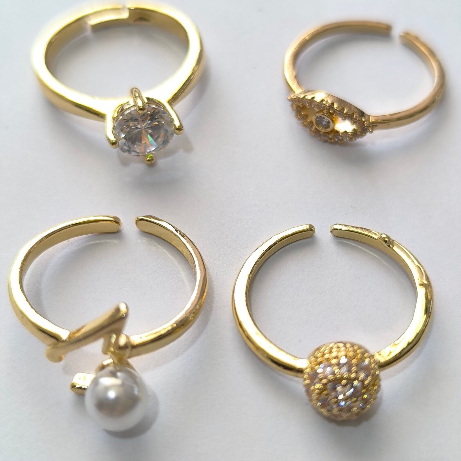 Coleccion completa de 100 anillos dorados ajustables en una gran variedad de modelos y estilos. Cada anillo cuenta con bano dorado brillante y detalles decorativos en cristal, esmalte, perla o micro pavimento de zirconia. Perfectos para reventa, regalos o para lucir un look diferente cada dia.