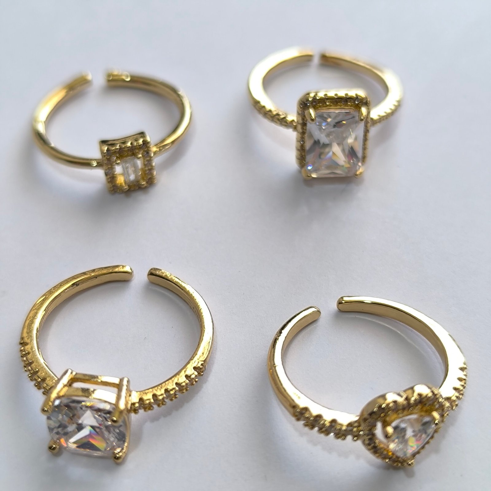 - Cuadrado con cristal princess: piedra cuadrada facetada en base dorada, clasico y llamativo