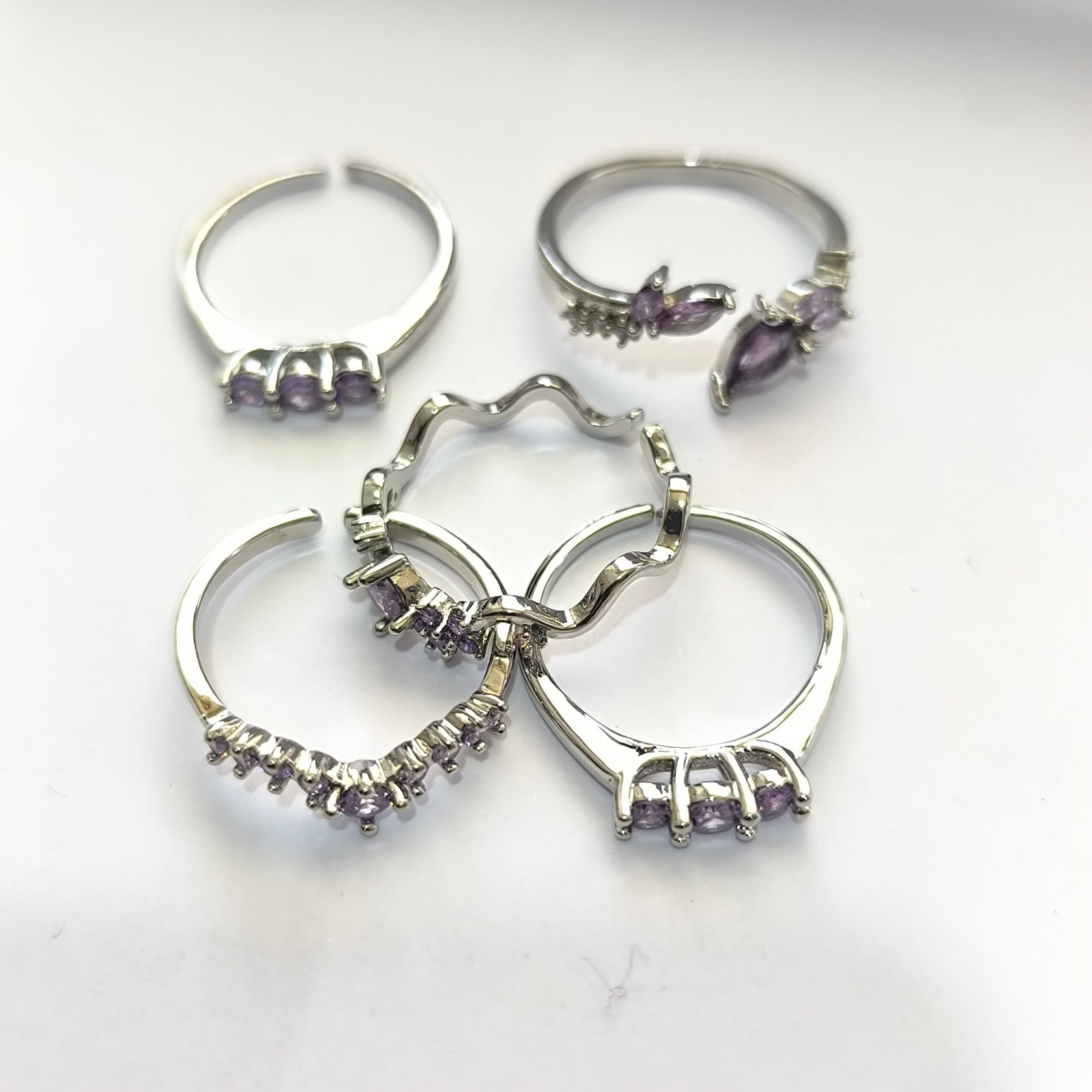 - Solitario navette morado doble: dos piedras navette en tono lila sobre argolla lisa plateada, delicado y romántico