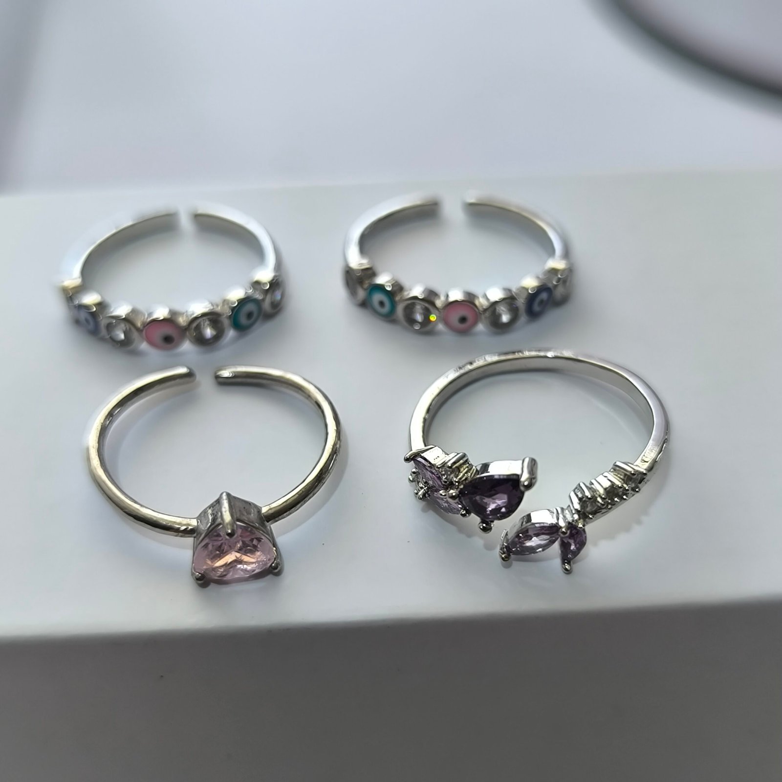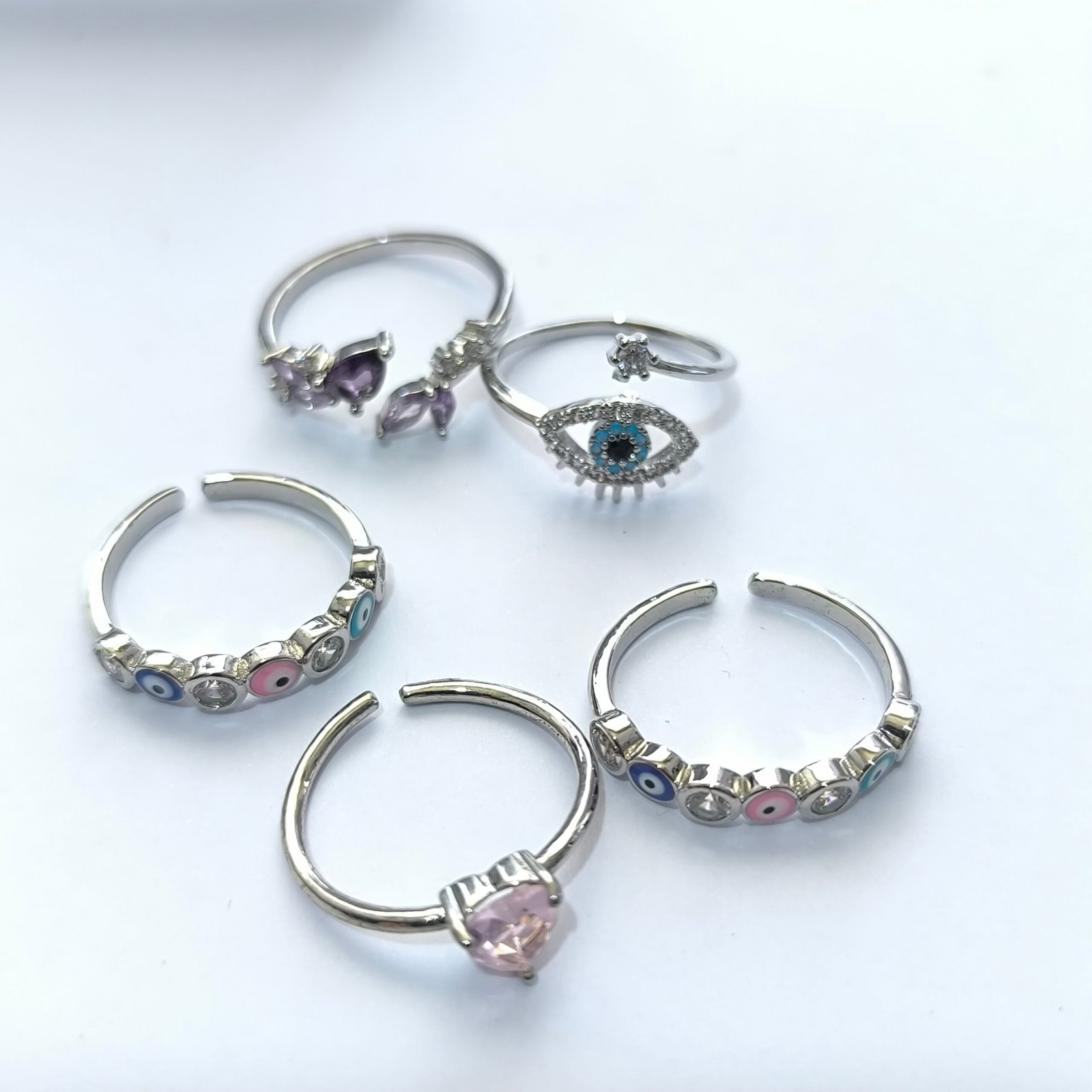 Esta colección de anillos plateados se distingue por sus disenos finos, delicados y llenos de simbolismo. Cada pieza cuenta con bano plateado brillante y detalles en cristal zirconia, piedras en tonos lavanda, rosa y rubi, esmalte de ojo turco, cruz colgante y micro pavimento. Una colección con mucha personalidad, perfecta para quien busca accesorios elegantes, románticos o con significado especial.