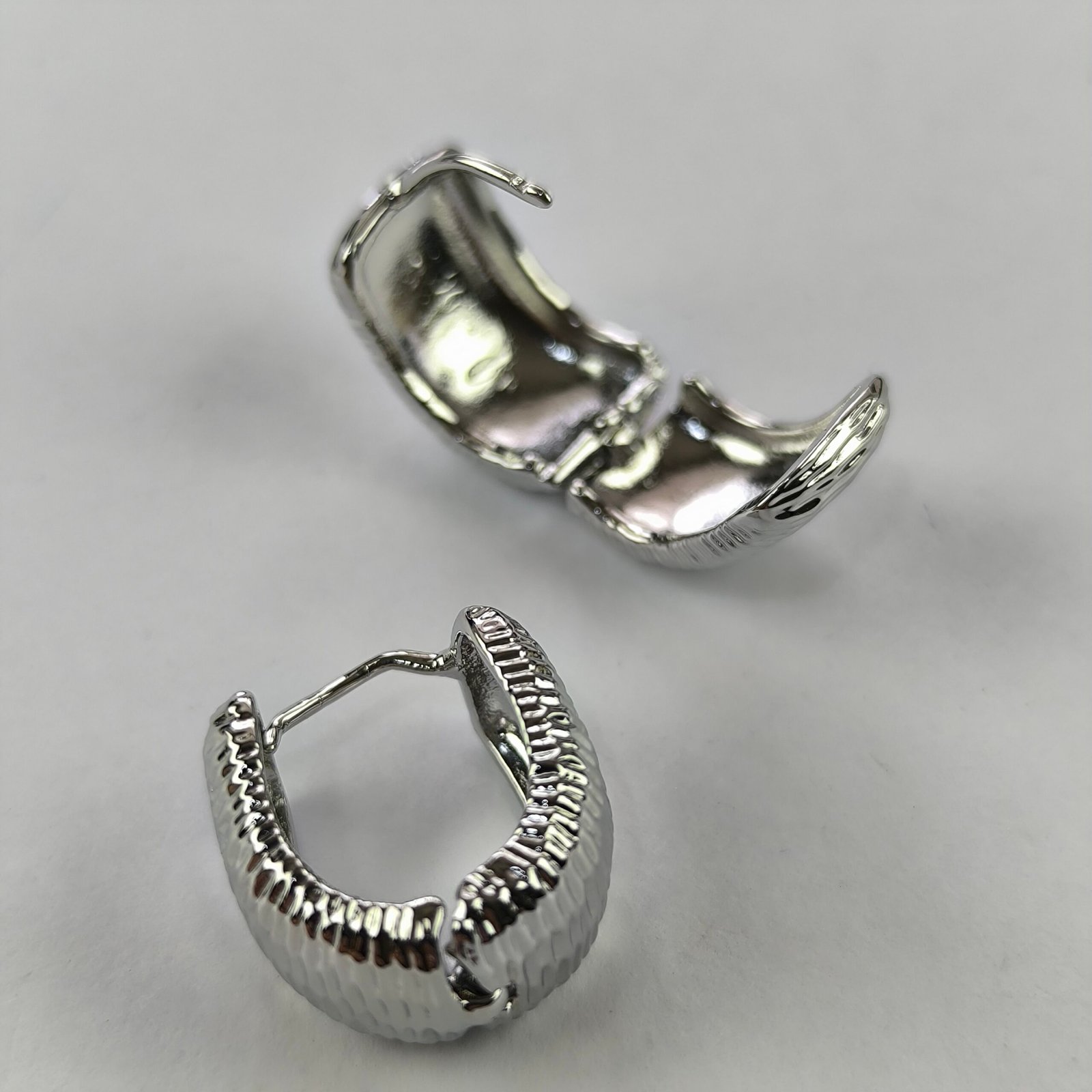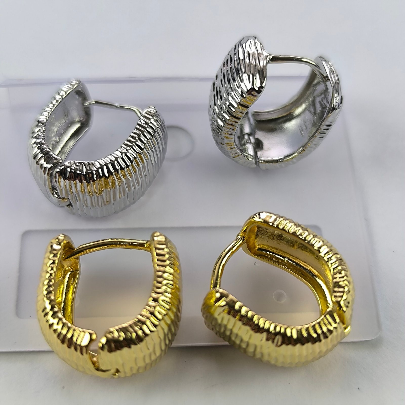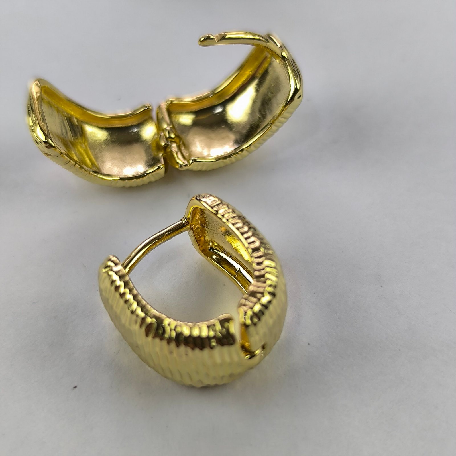 Este modelo de aretes destaca por su diseño tipo aro con textura acanalada estilo acordeón, creando un efecto visual dinámico que refleja la luz desde distintos ángulos.