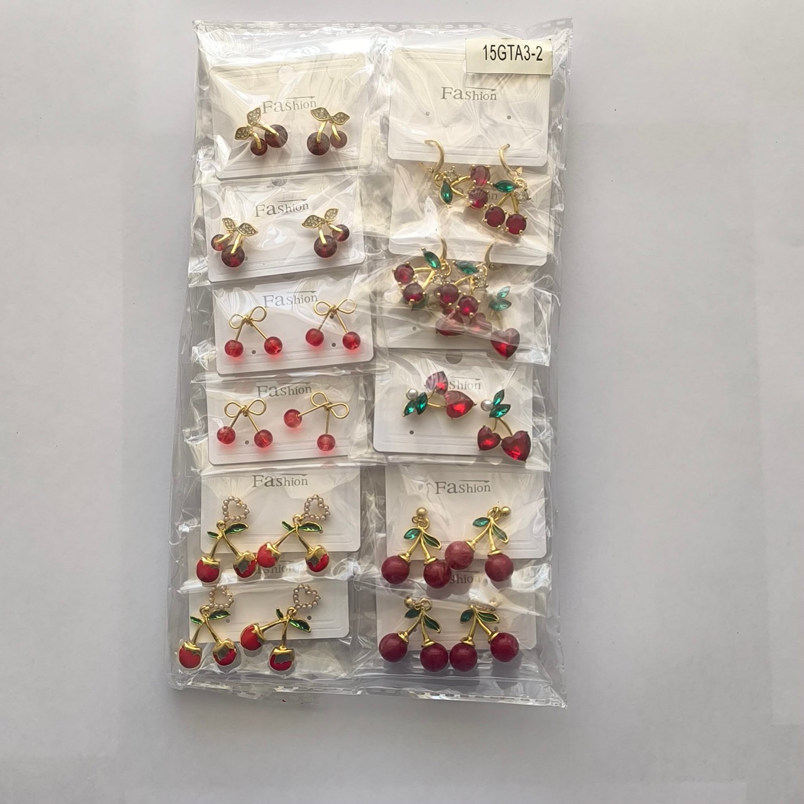 El paquete incluye diferentes diseños de aretes inspirados en cerezas y frutas decorativas, combinando metal dorado con cristales rojos, hojas verdes y detalles brillantes.