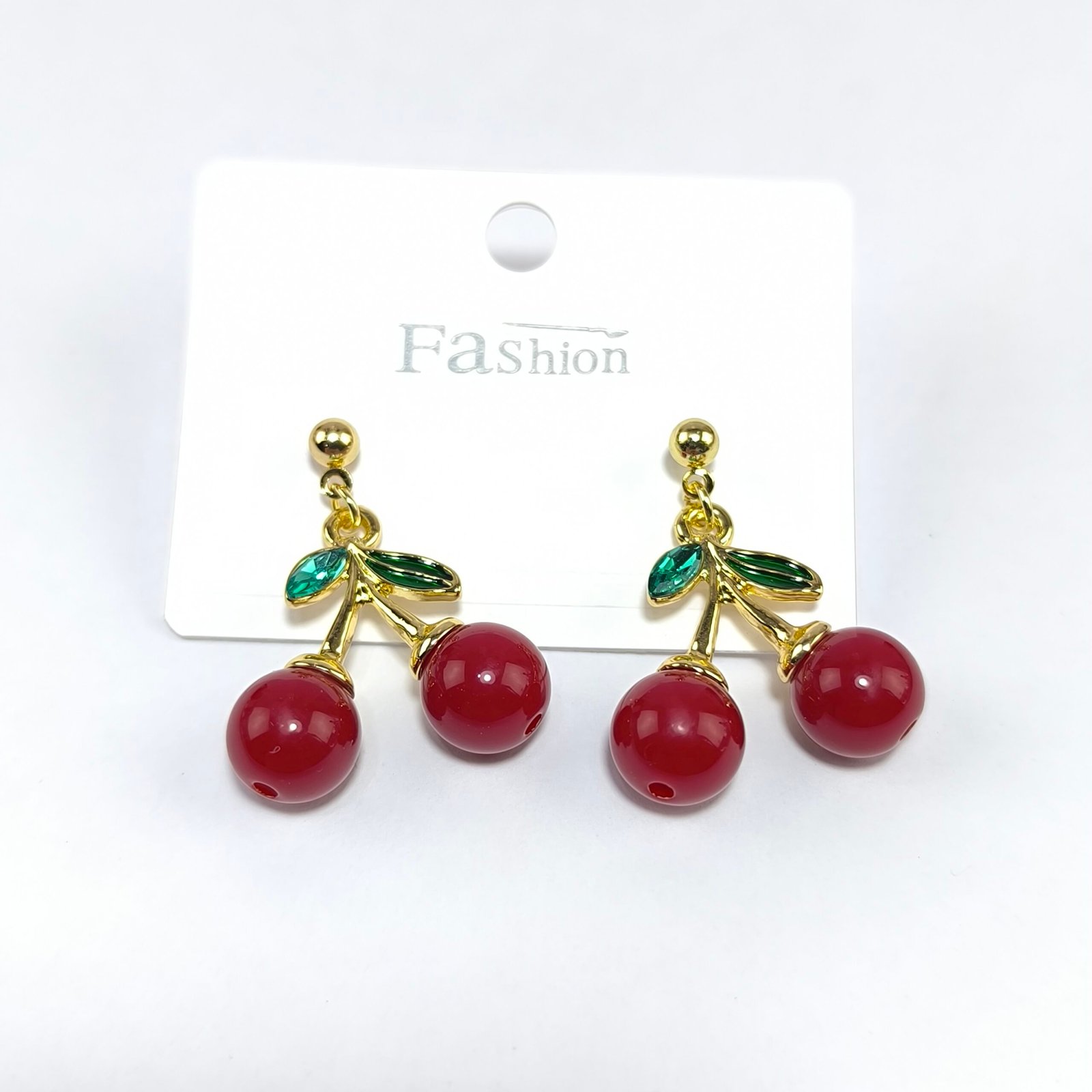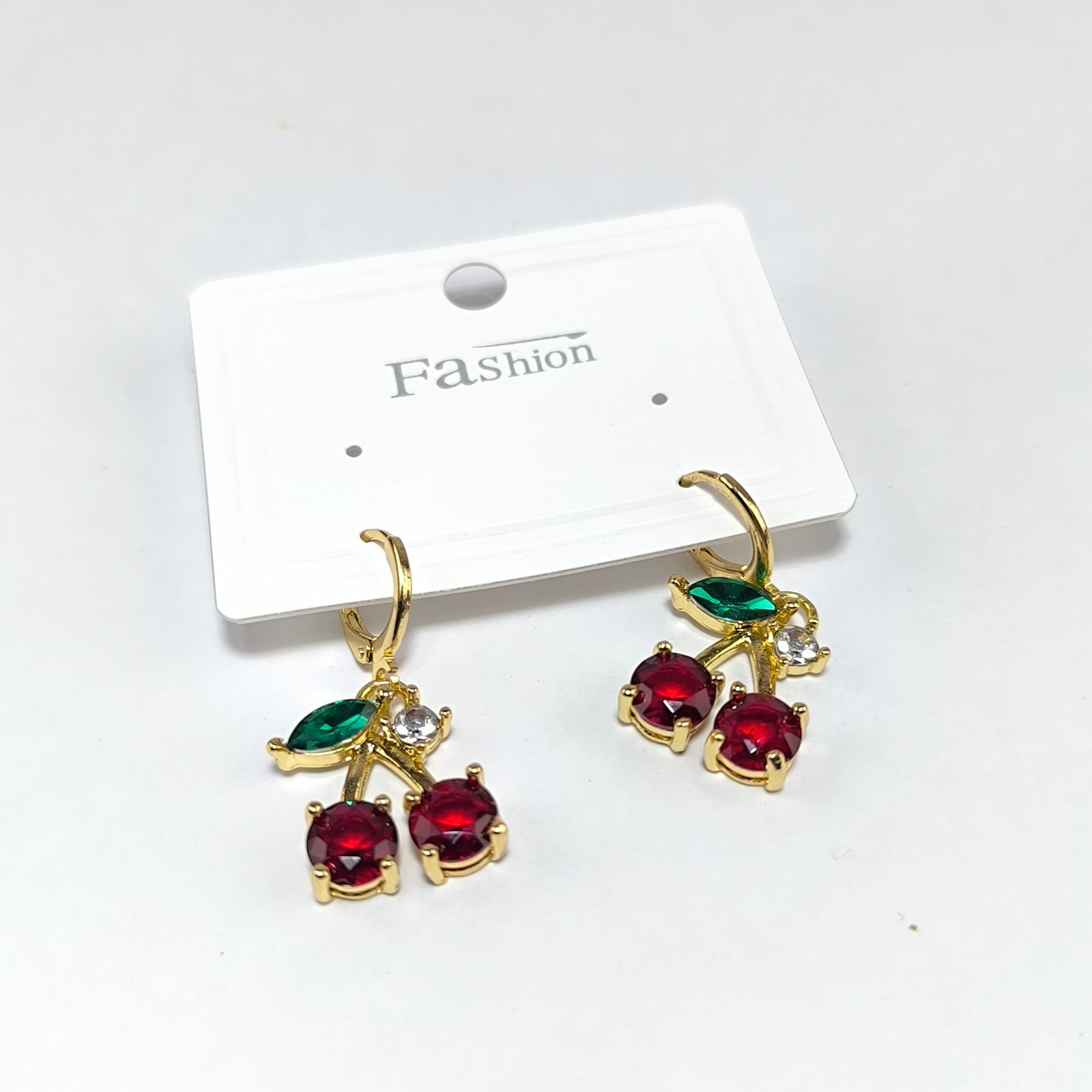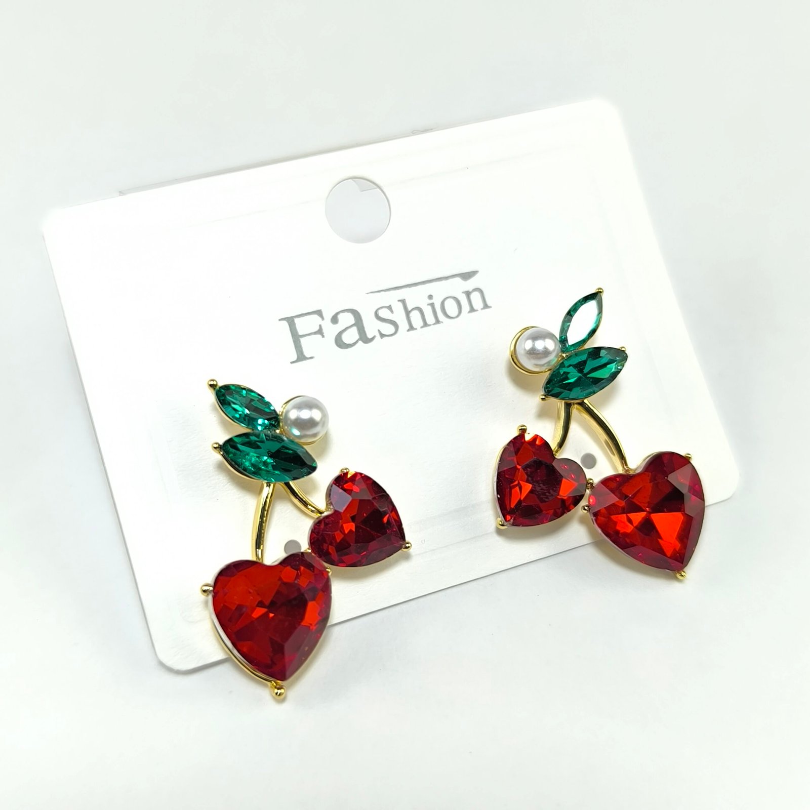 - Pieza 2: aretes de cereza con piedras rojas facetadas y hoja verde decorativa.