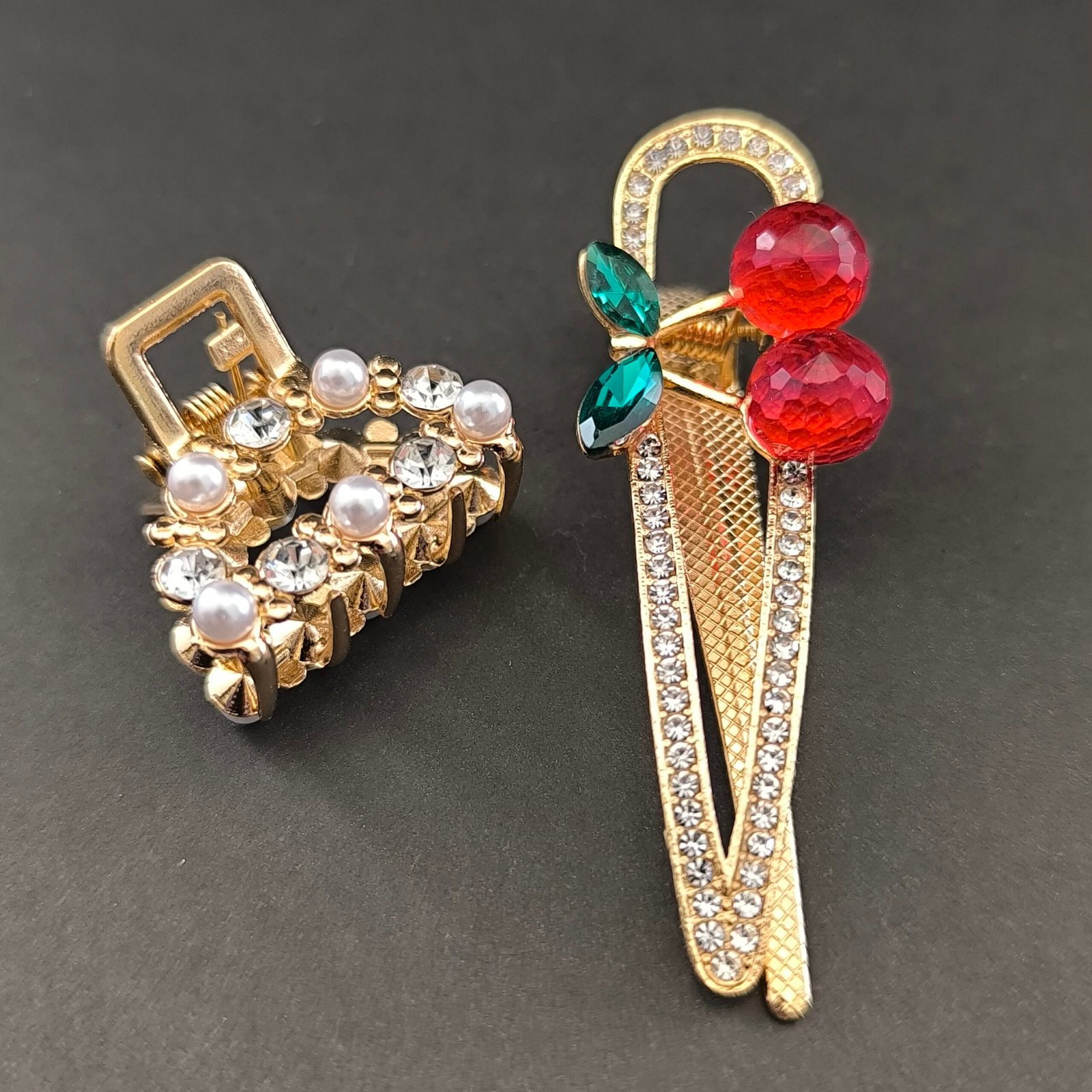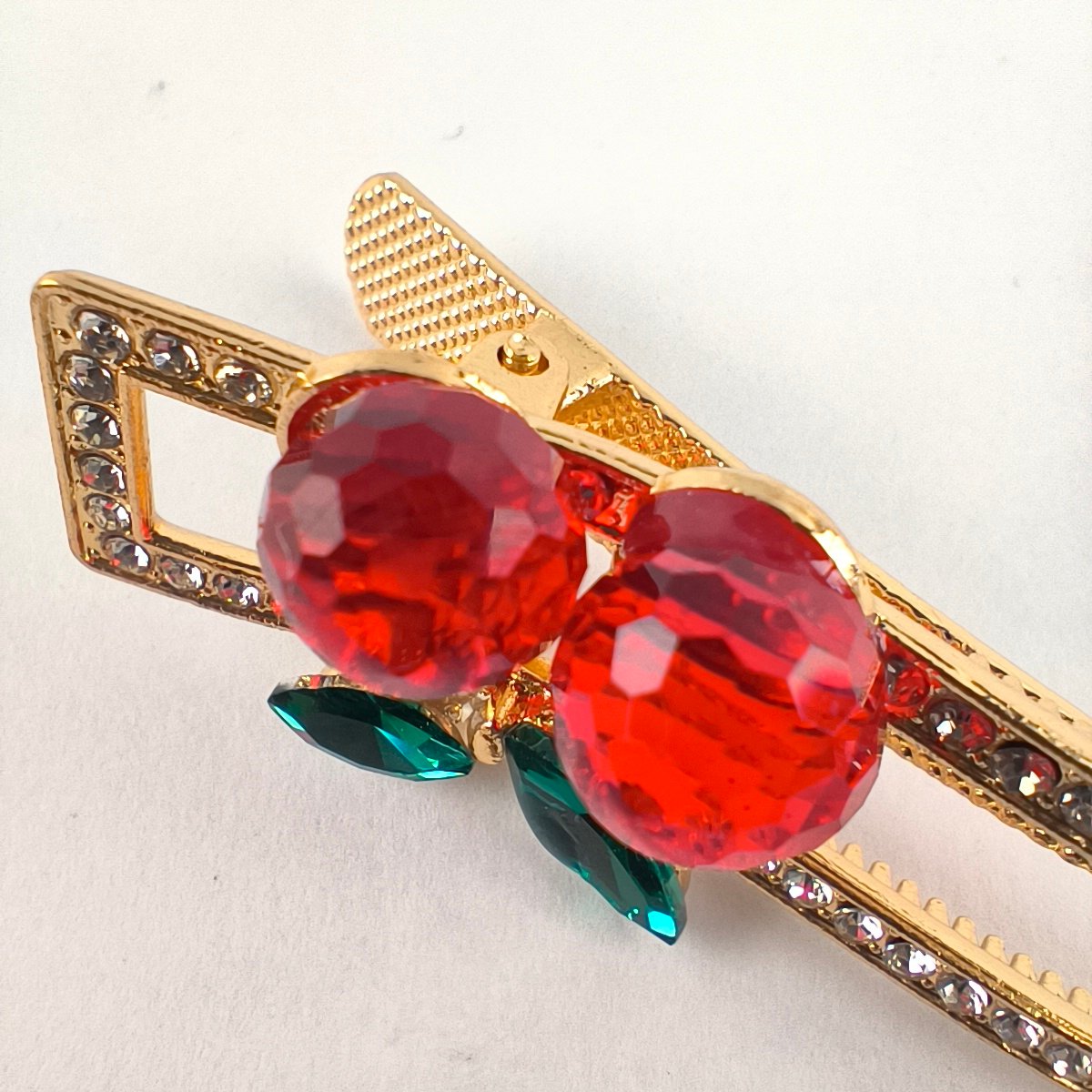 La pinza alargada presenta un diseño decorativo con piedras rojas y hojas verdes que evocan una figura tipo cereza, acompañadas de pequeños cristales brillantes que reflejan la luz y aportan un toque llamativo al peinado. Su estructura metálica permite sujetar mechones de cabello de forma segura mientras añade un detalle decorativo al estilo.
