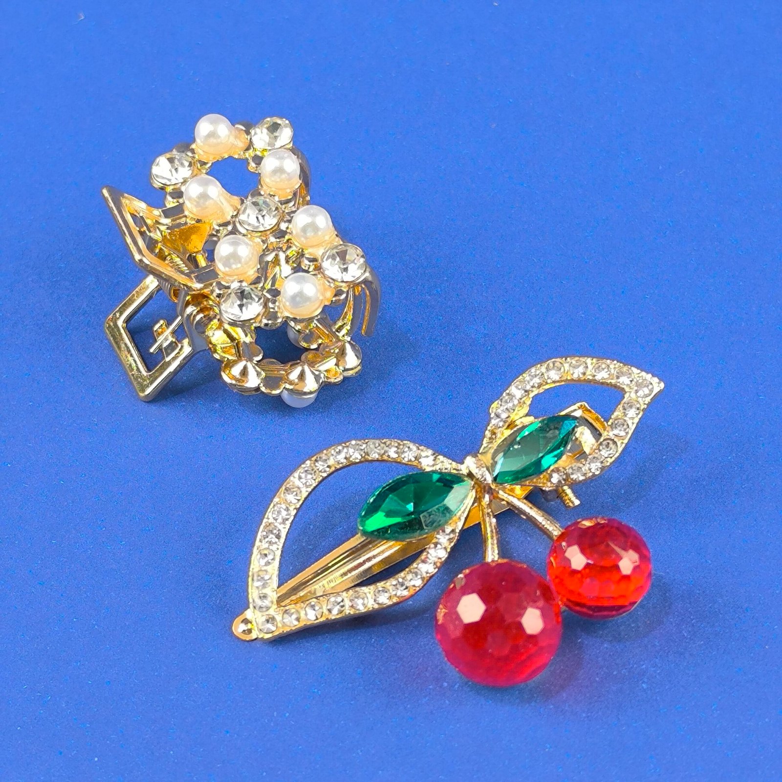 Set de pinza y pirañita metálica decorativa para cabello con cristales, perlas y diseño elegante. Ideal para peinados, recogidos y estilos modernos.
