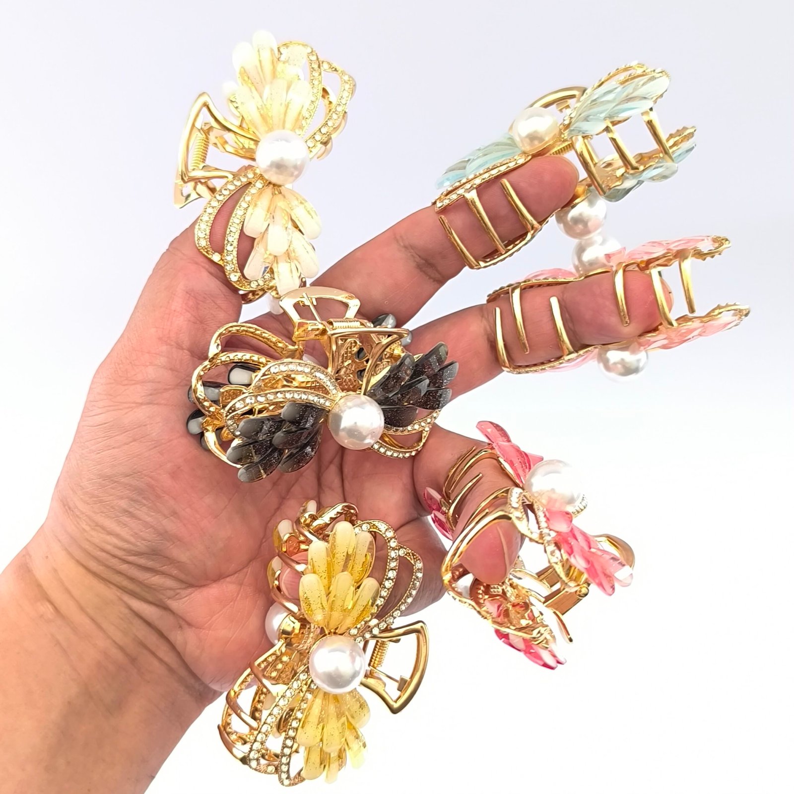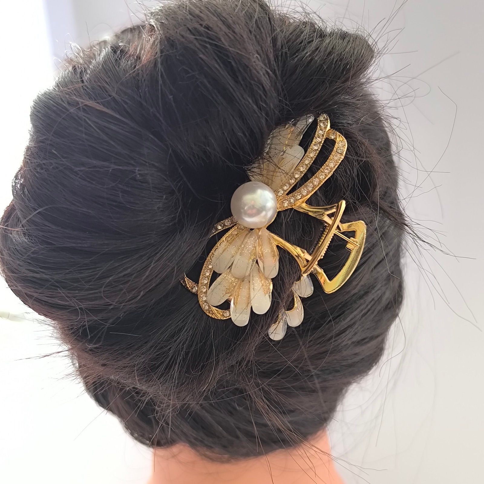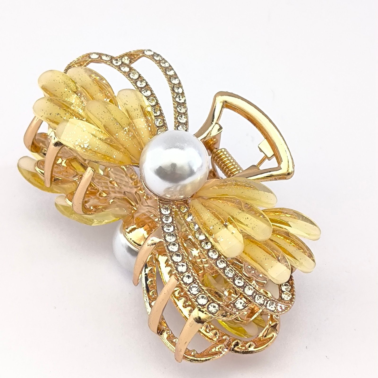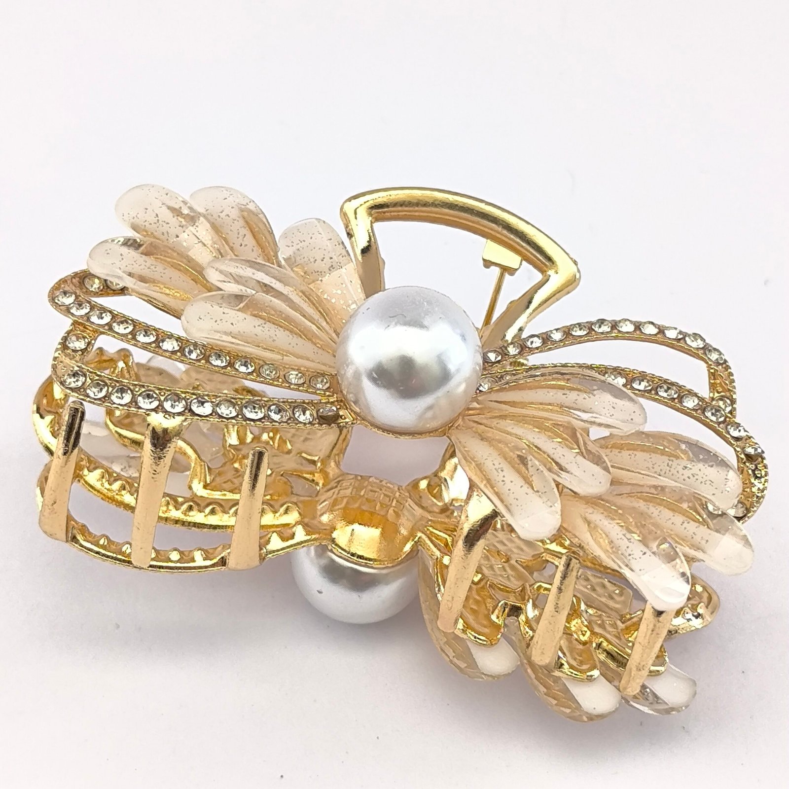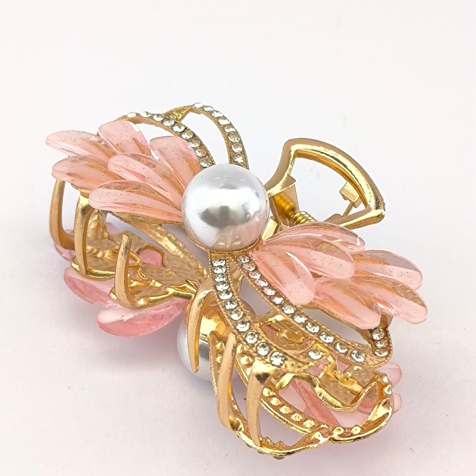 Pinza tipo piraña para cabello con diseño decorativo de perla central, cristales y pétalos translúcidos. Accesorio elegante para sujetar el cabello con estilo en peinados diarios o eventos especiales.