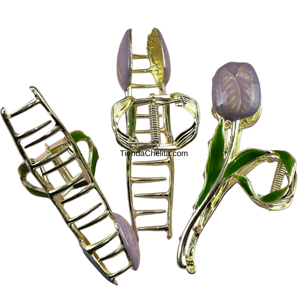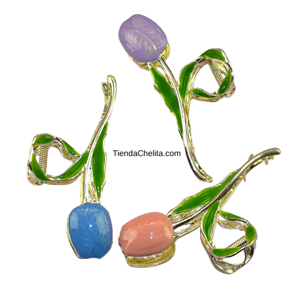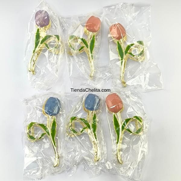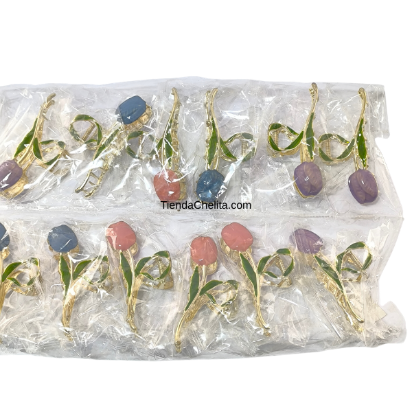 Piraña de metal resistente con diseño floral tipo tulipán y acabado brillante. Ideal para sujetar cabello largo con estilo elegante y femenino. Medida 11 cm de alto. Presentación por docena.