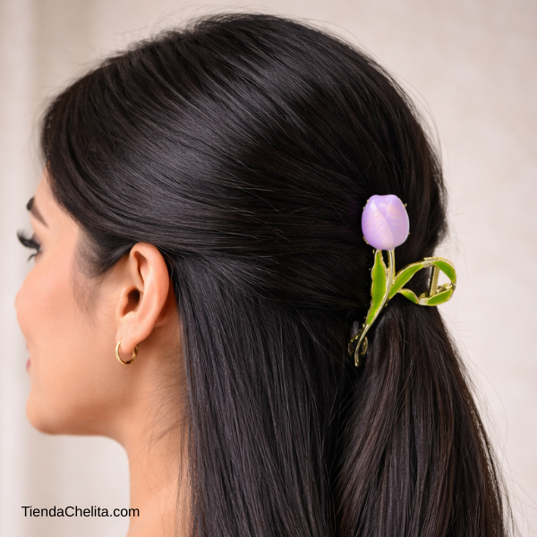 Esta piraña metálica destaca por su diseño delicado en forma de flor tipo tulipán, un estilo elegante y moderno que resalta cualquier peinado sin perder funcionalidad.