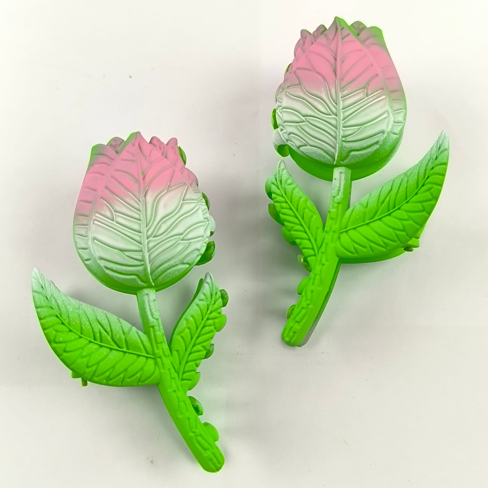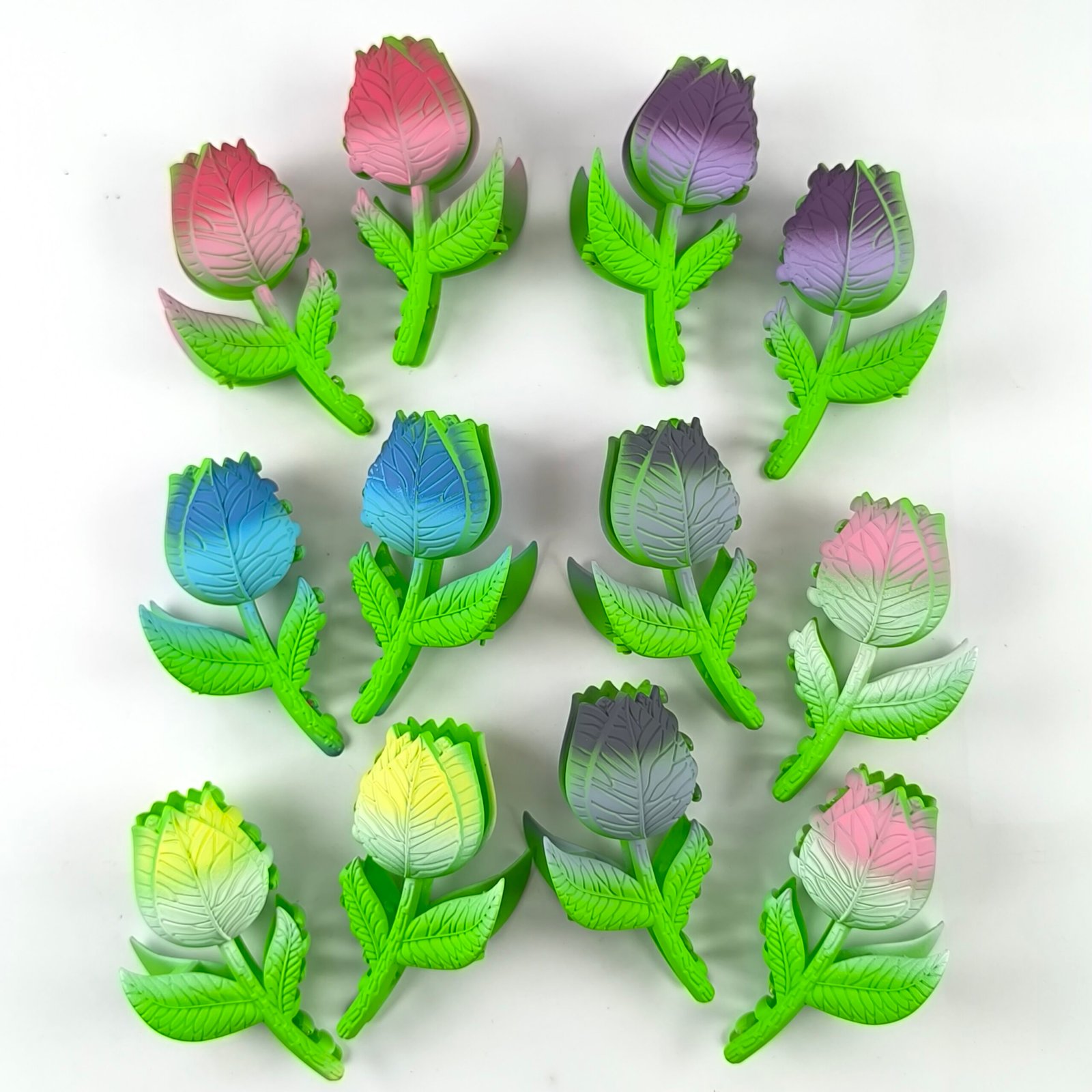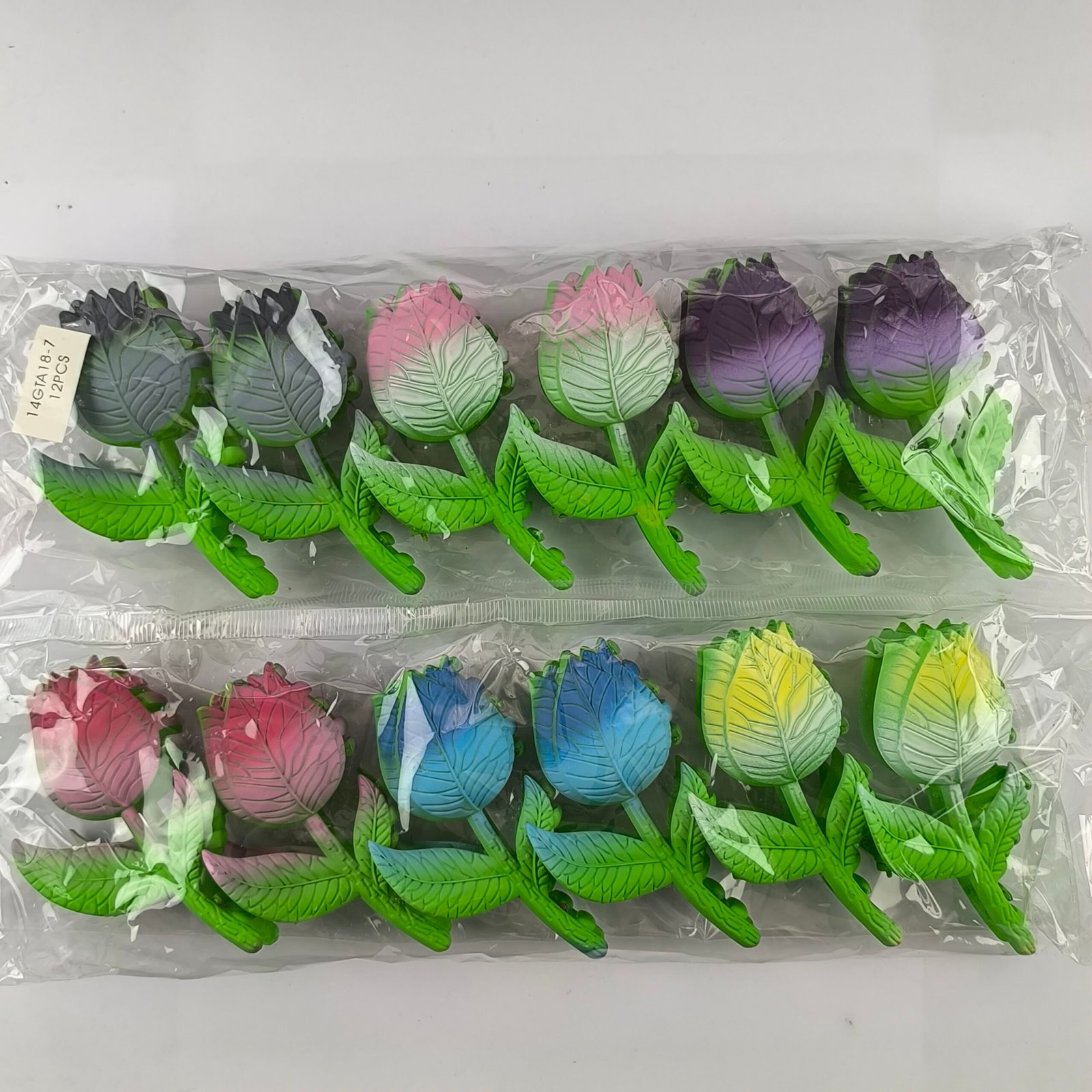 Incluye 12 unidades en diferentes tonos degradados como rosa, azul, amarillo, morado y gris, combinados con hojas verdes que simulan una flor real.