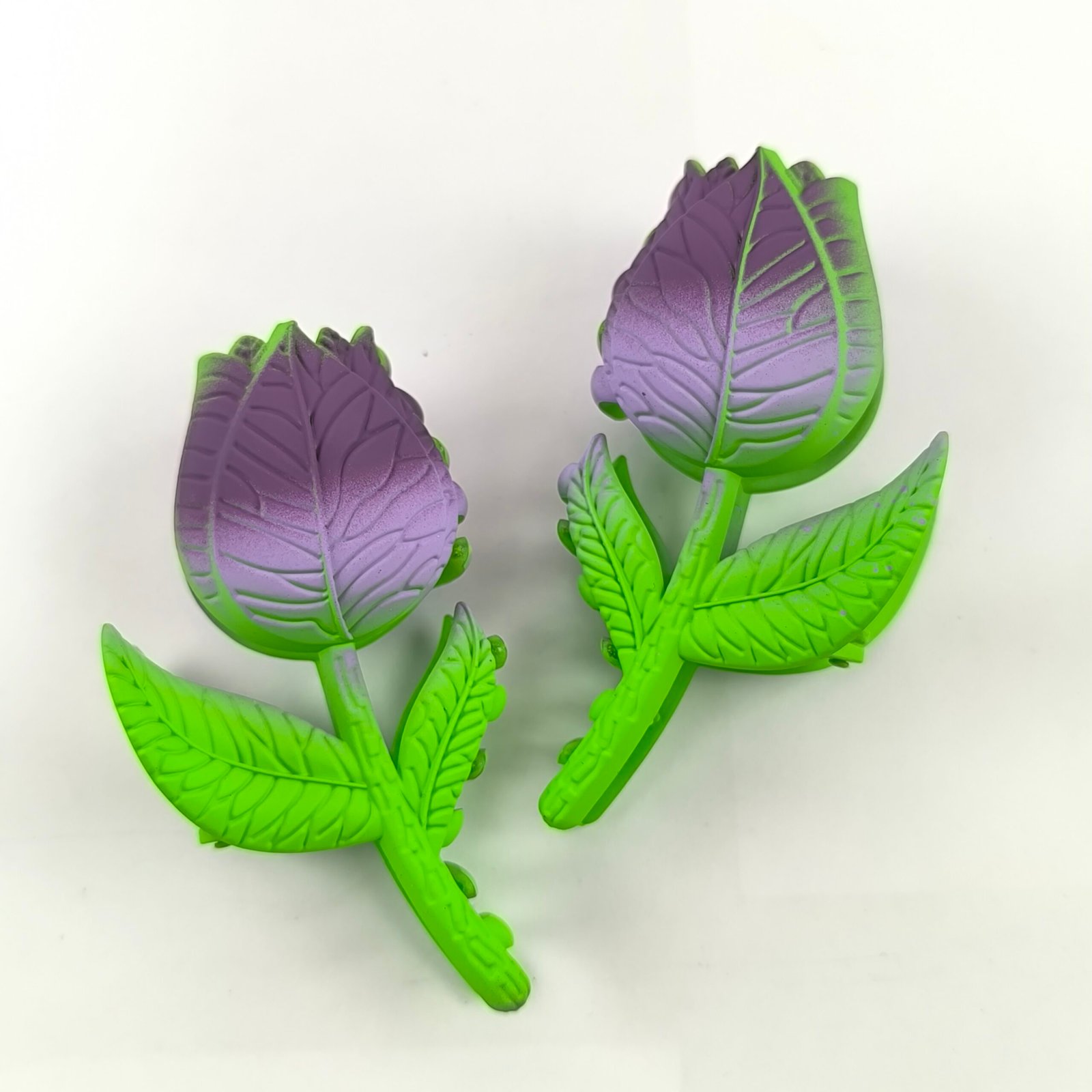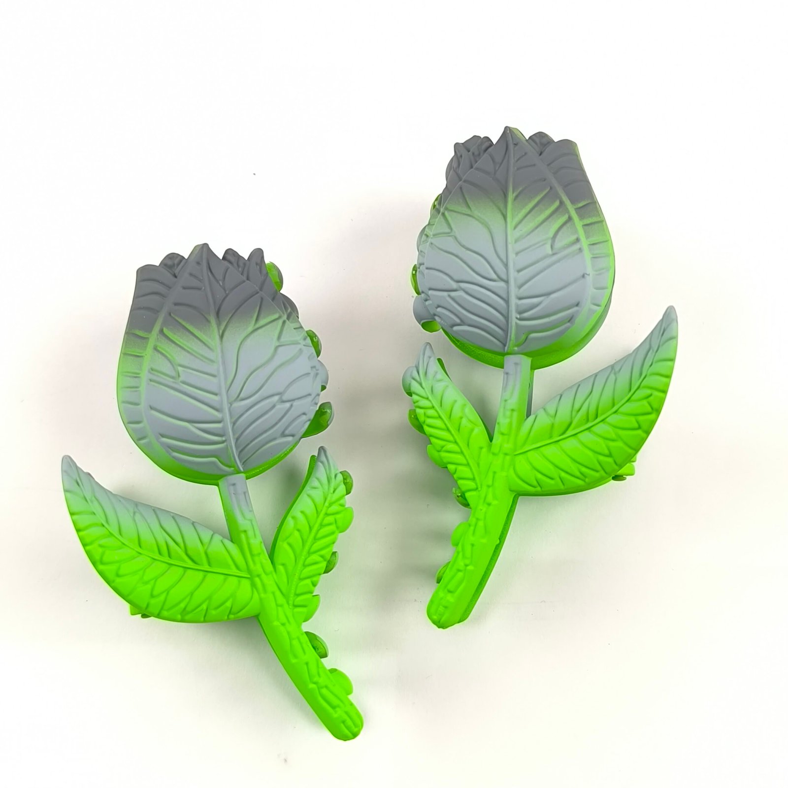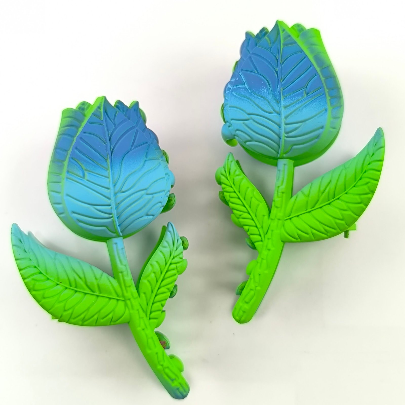 Incluye 12 unidades en diferentes tonos degradados como rosa, azul, amarillo, morado y gris, combinados con hojas verdes que simulan una flor real.