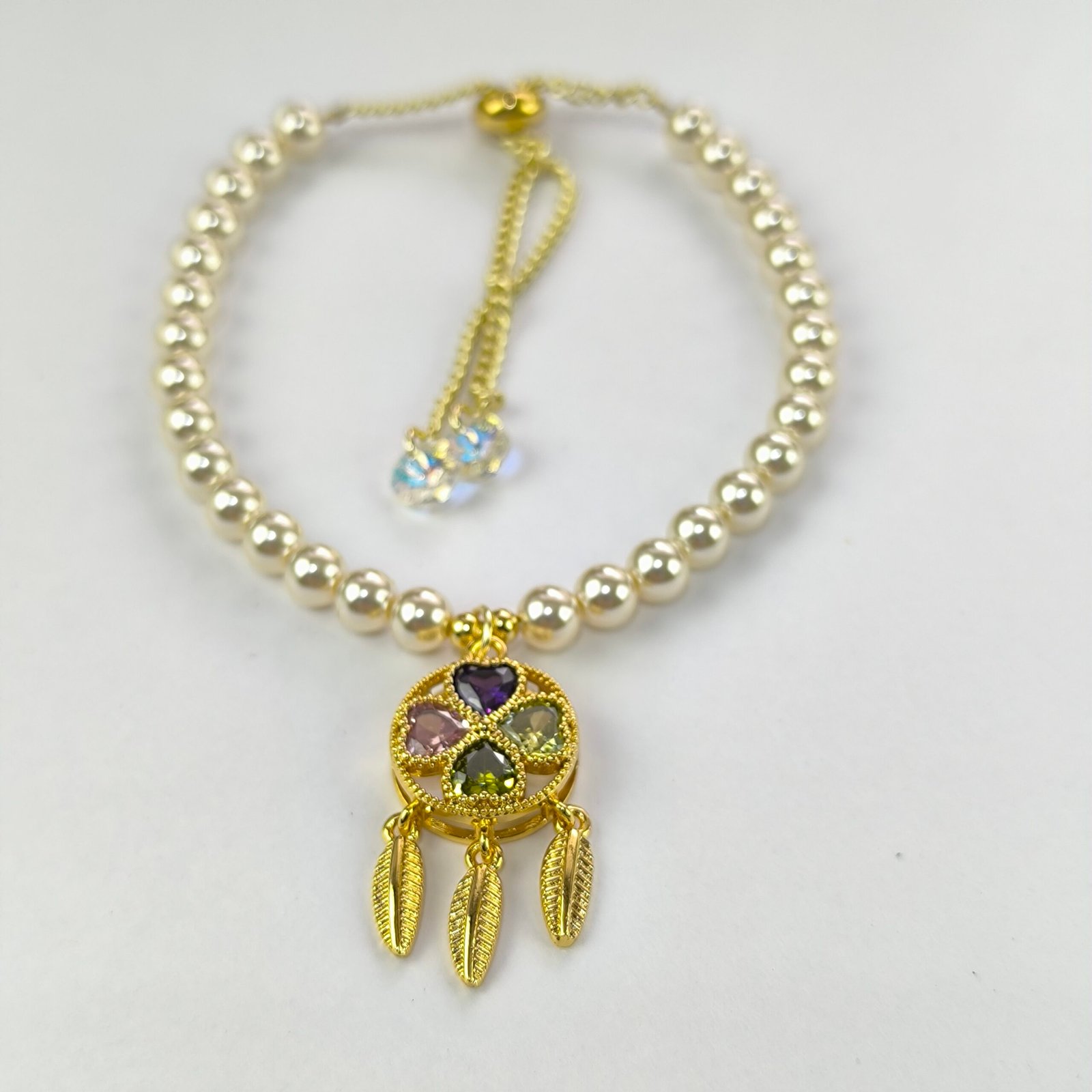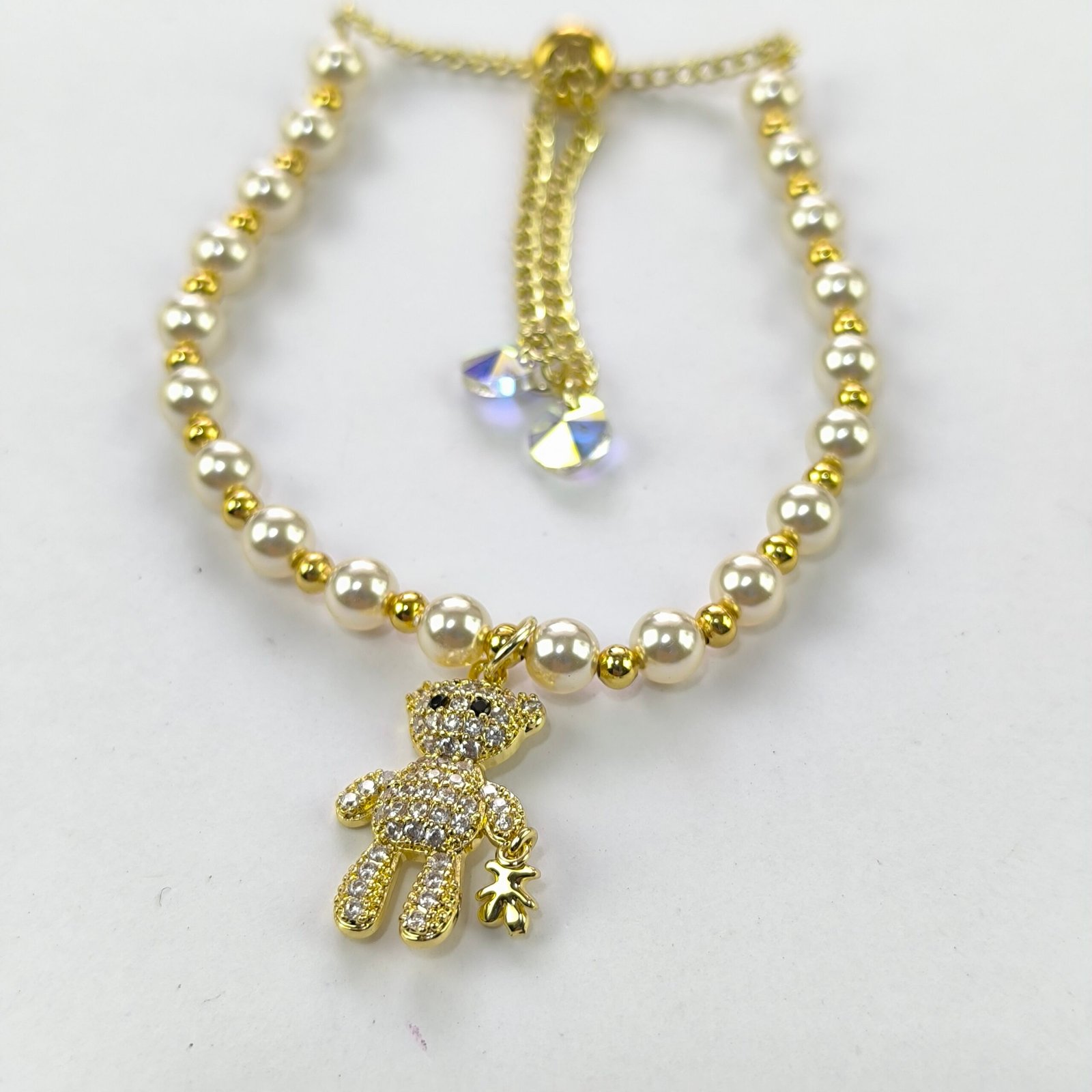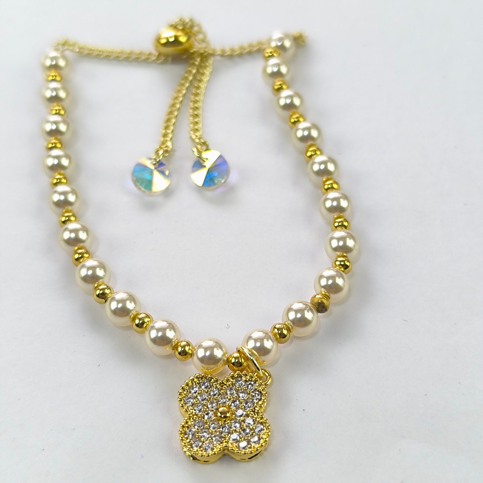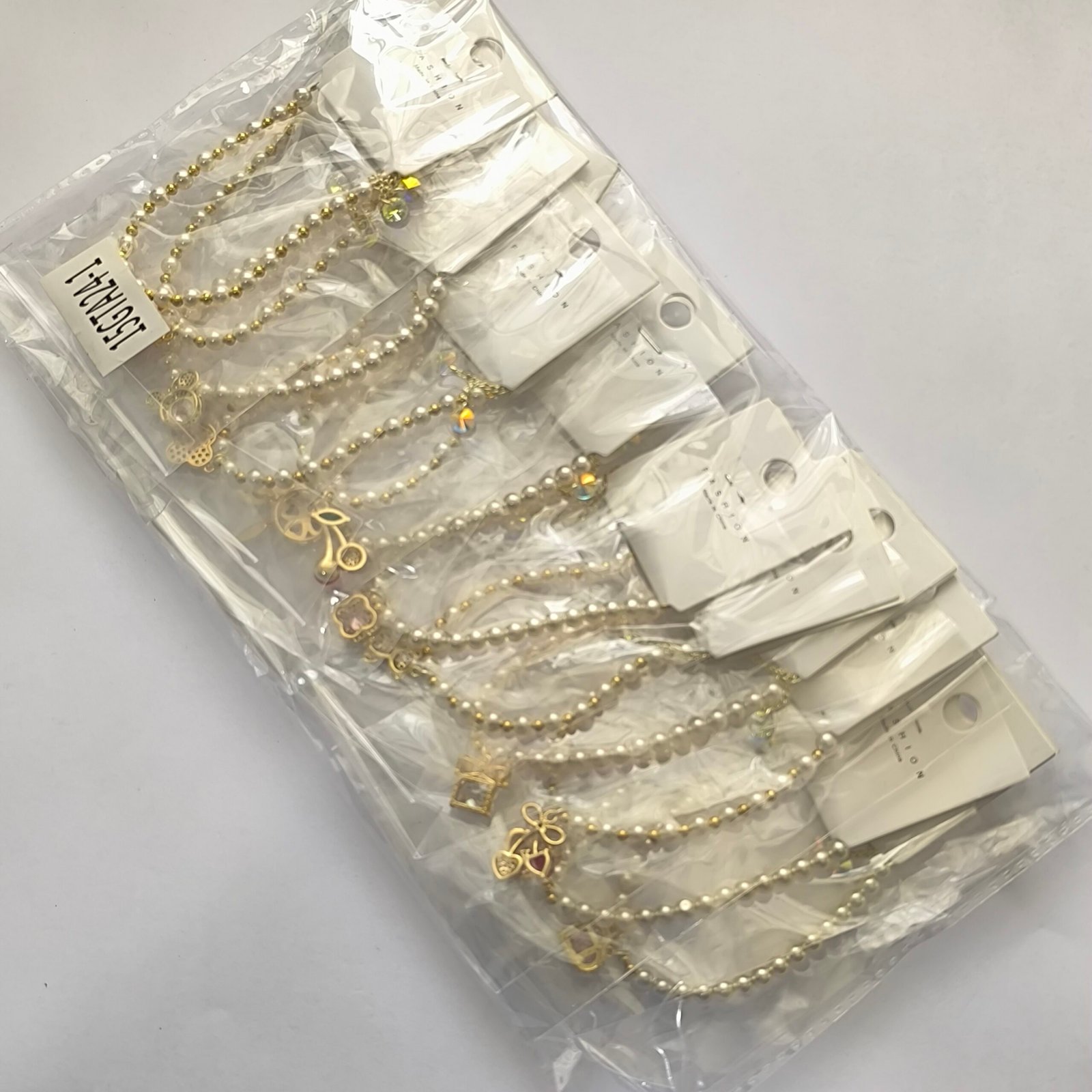 Pack de 12 pulseras tipo perlas con dijes surtidos en acabado dorado, diseñadas para ofrecer una combinación perfecta entre elegancia, variedad y facilidad de venta.