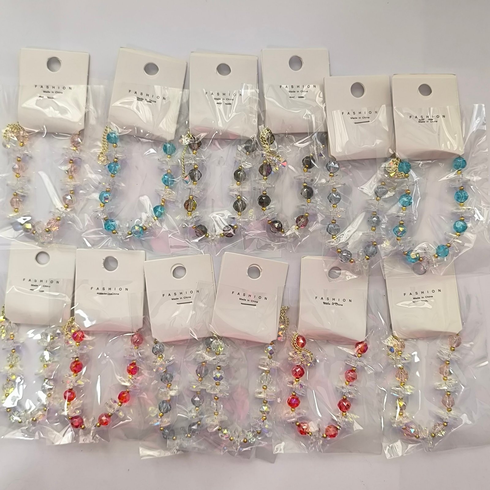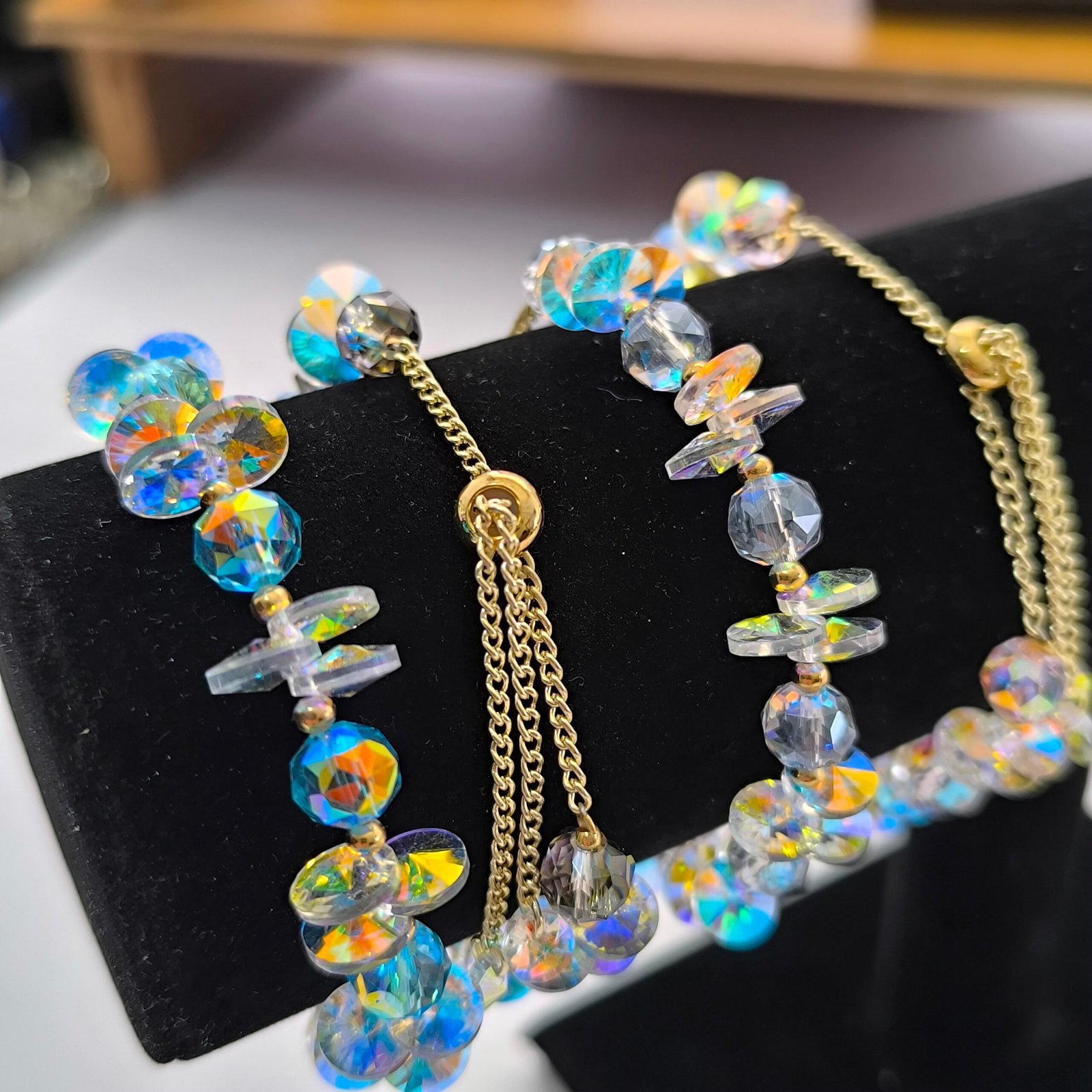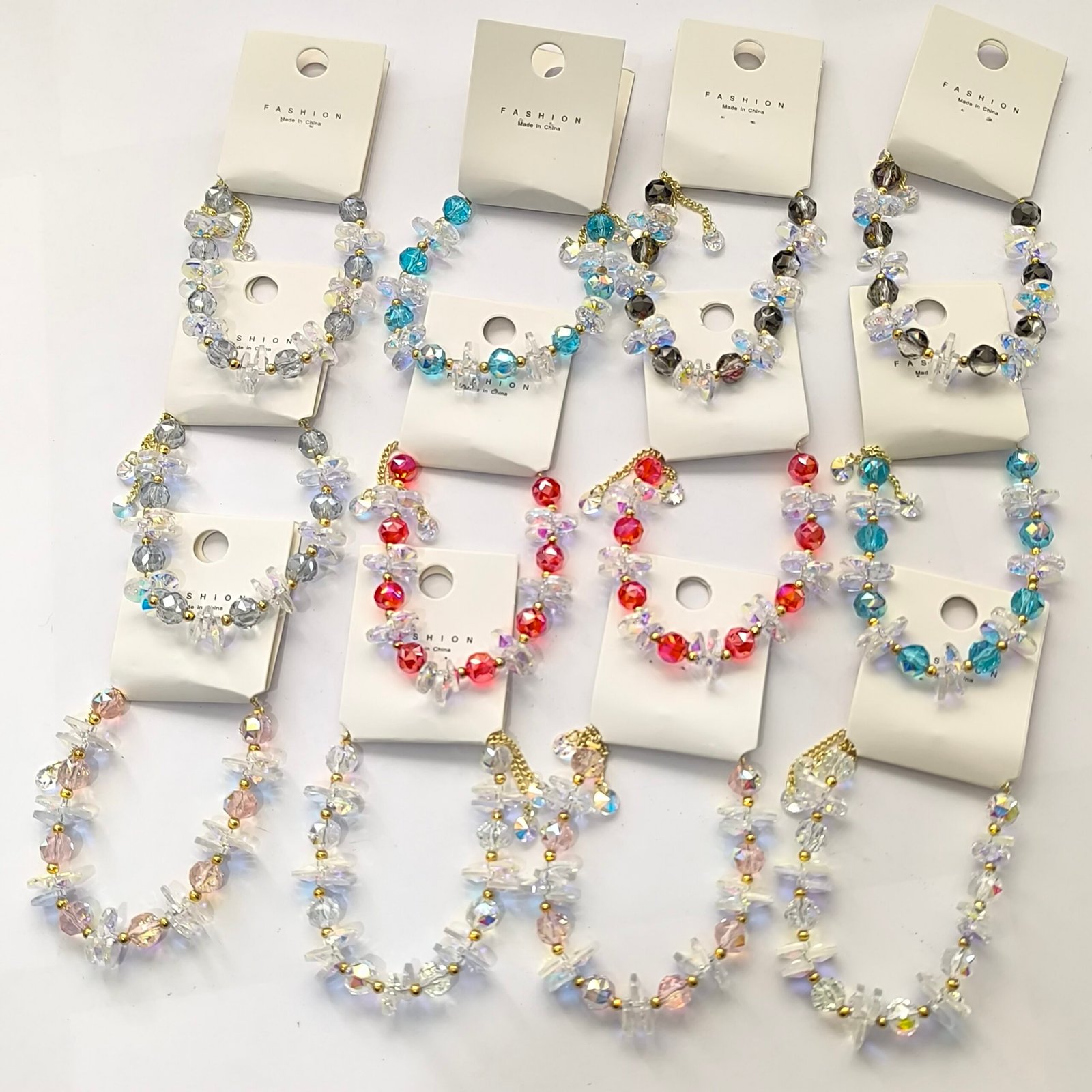Todos los modelos combinan cuentas de color con chips AB transparentes intercalados, separadores dorados y cierre deslizante dorado con terminales de cristal facetado.