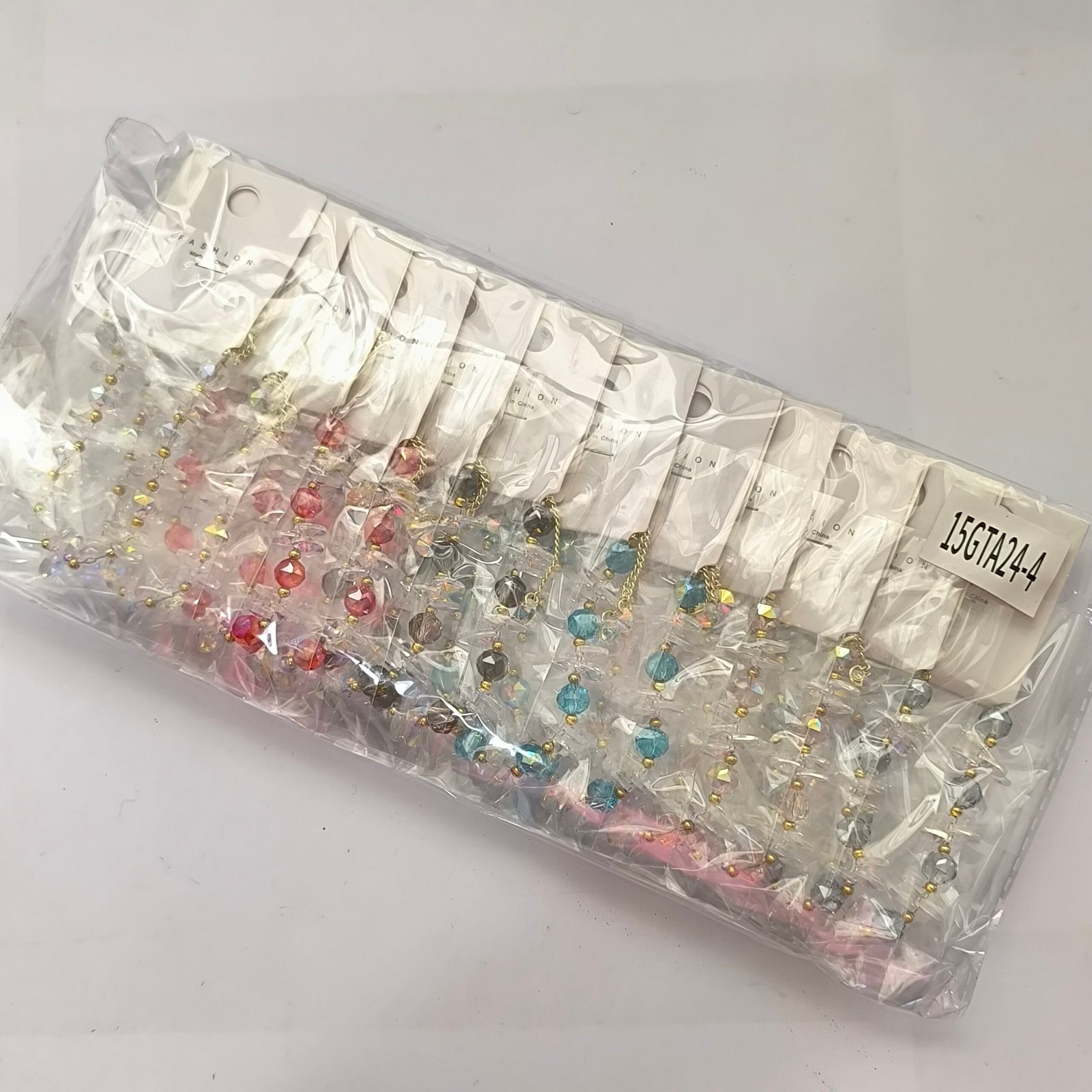 Pulsera ajustable de cristal facetado iridiscente (varosky) con diseno de cuentas y chips intercalados en toda su longitud. Colores disponibles: rosa, gris, rojo, azul turquesa, transparente y antracita. Cierre deslizante dorado con terminales de cristal. Paquete de 12 unidades surtidas.