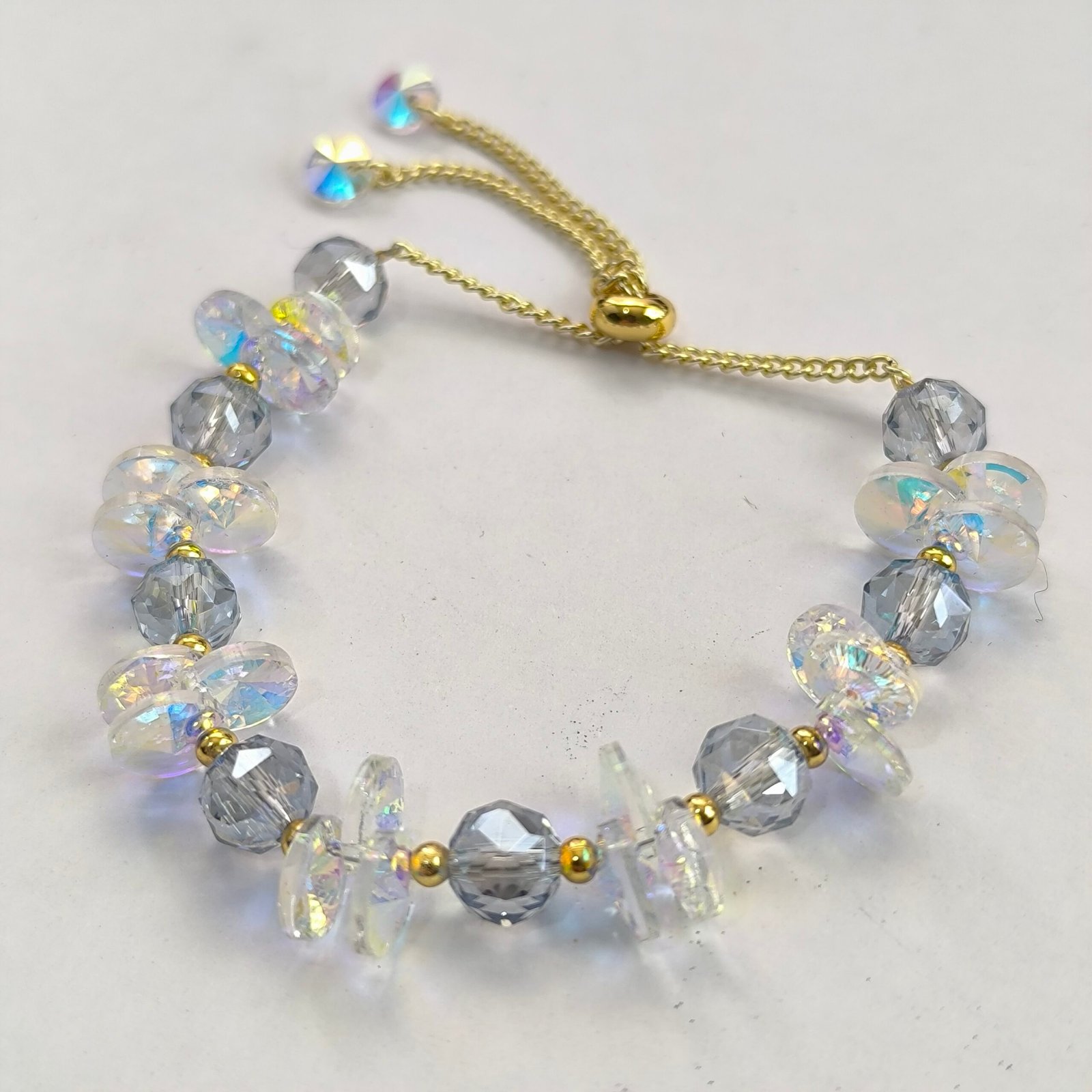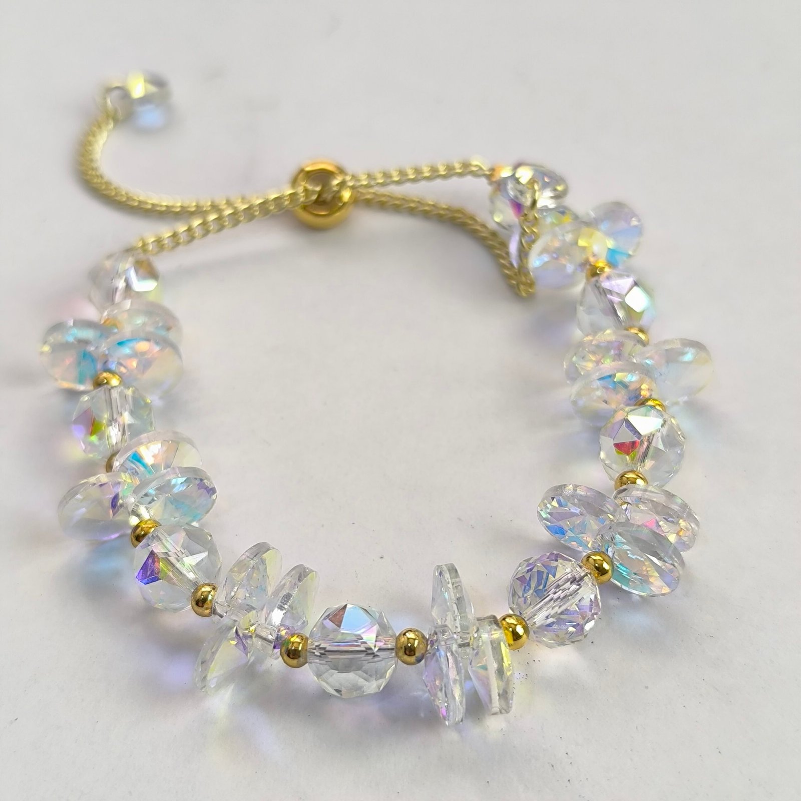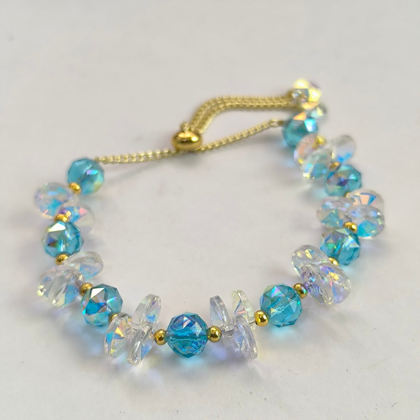 Nombre del producto Pulsera de cristal facetado iridiscente con chips intercalados ajustable (varosky) — Coleccion 2