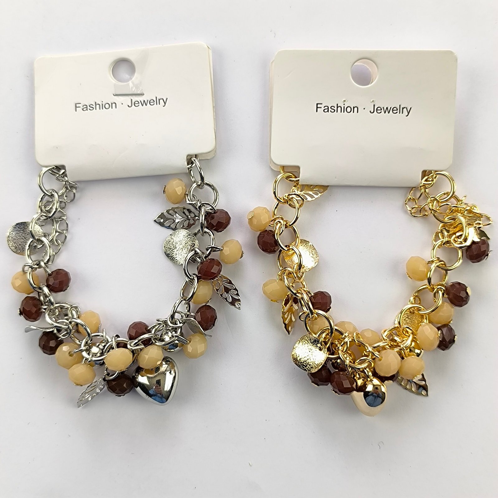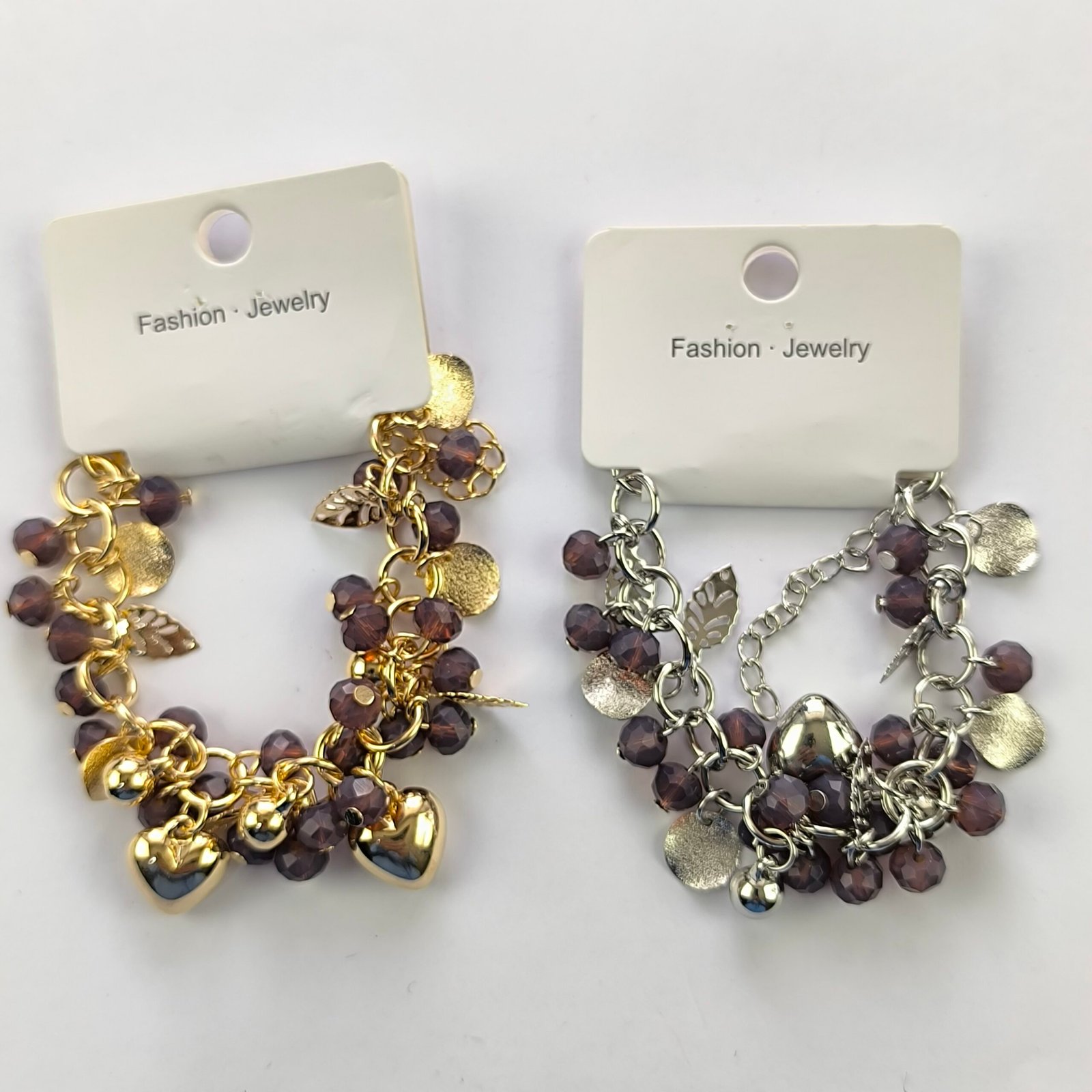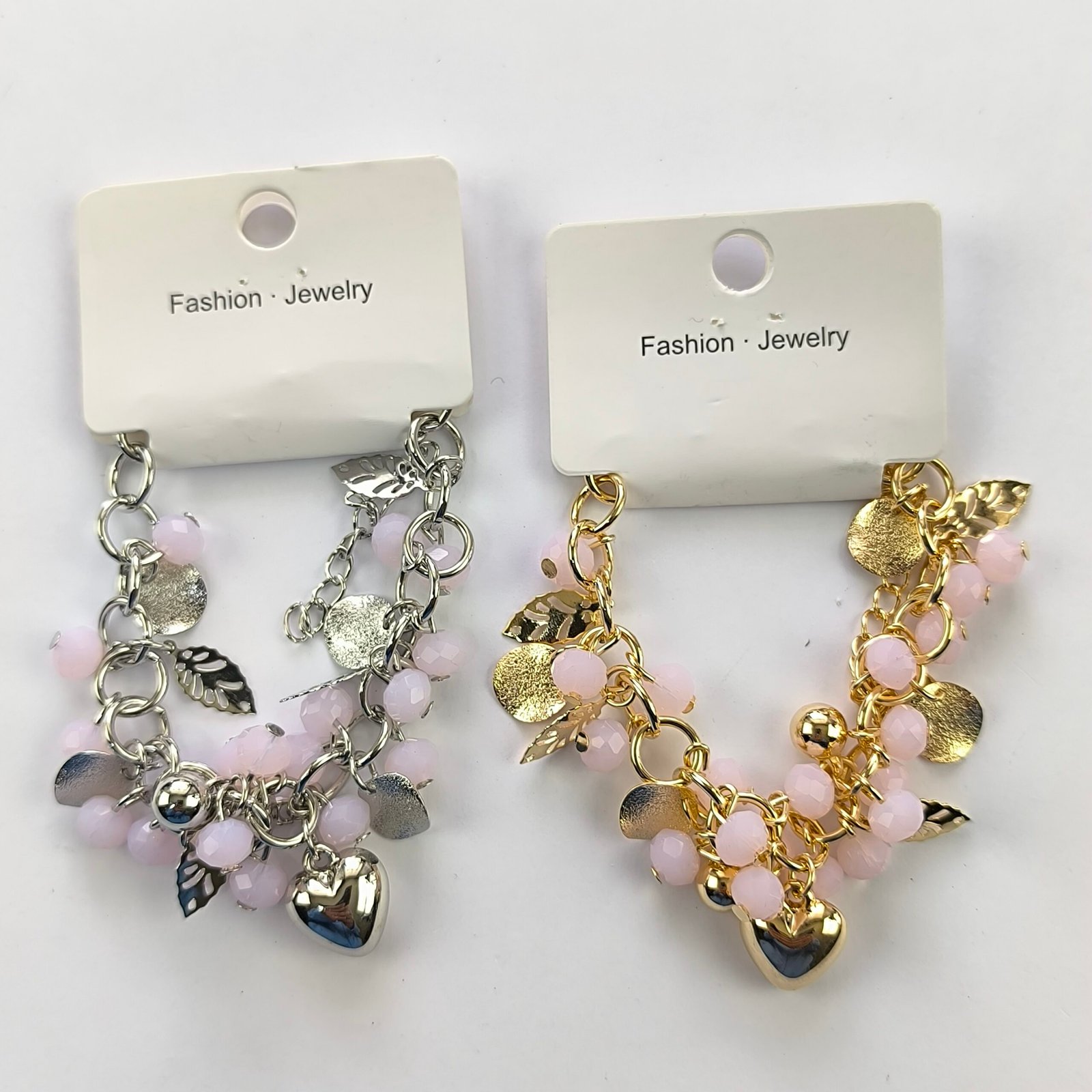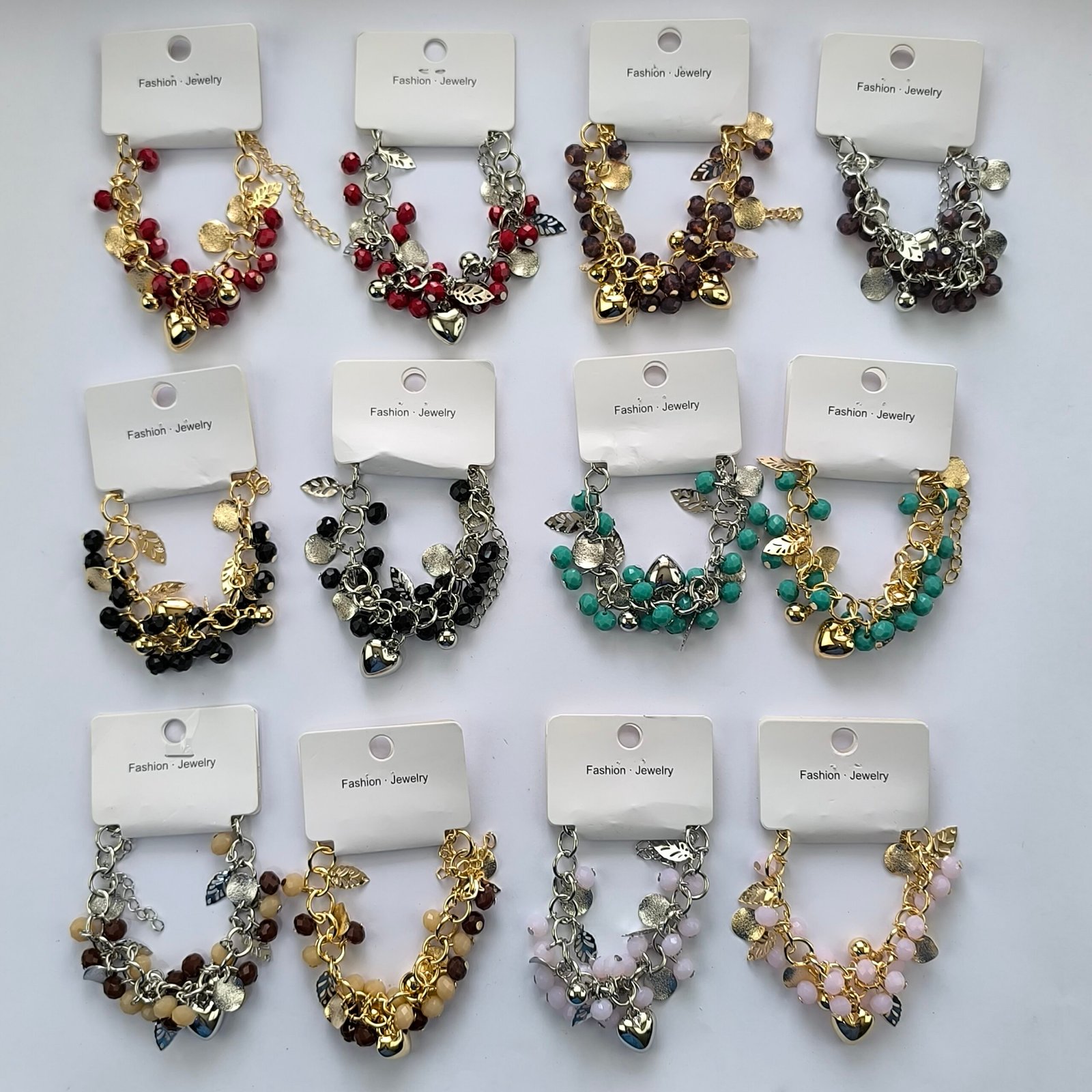Docena de 12 pulseras tipo charm surtidas con diseño elegante y llamativo. Cada par comparte el mismo modelo, variando en cadena dorada y plateada. Incluyen cuentas facetadas, dijes metálicos, hojas decorativas, corazones y detalles brillantes, ideales para venta por mayor, regalo o reventa.