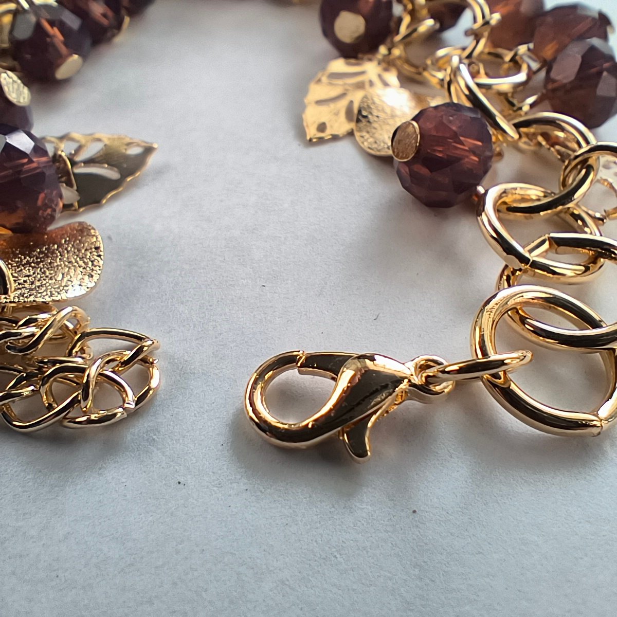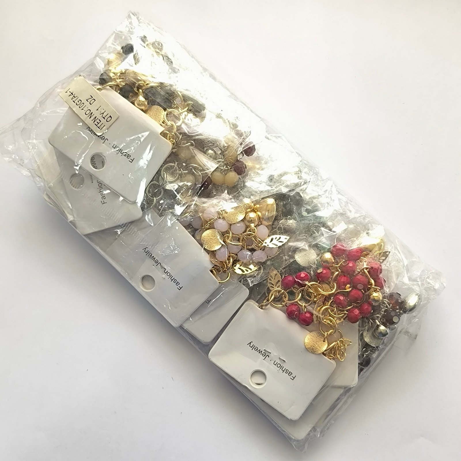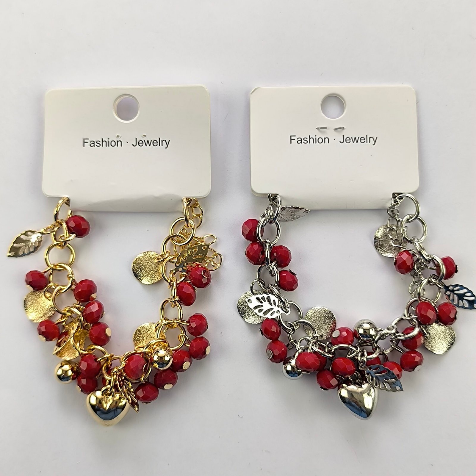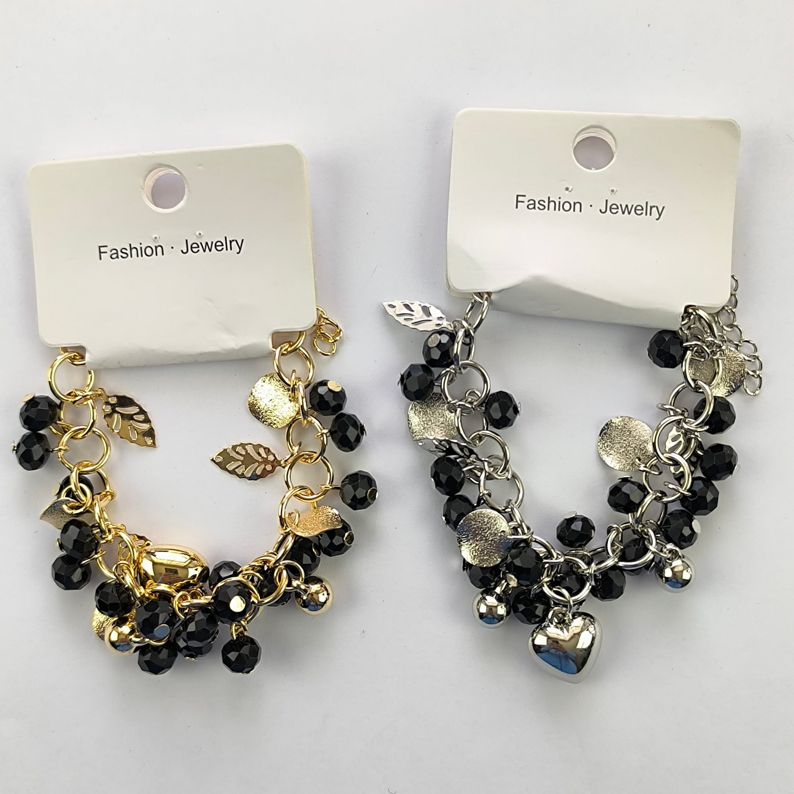 Docena de 12 pulseras tipo charm surtidas con diseño elegante y llamativo. Cada par comparte el mismo modelo, variando en cadena dorada y plateada. Incluyen cuentas facetadas, dijes metálicos, hojas decorativas, corazones y detalles brillantes, ideales para venta por mayor, regalo o reventa.