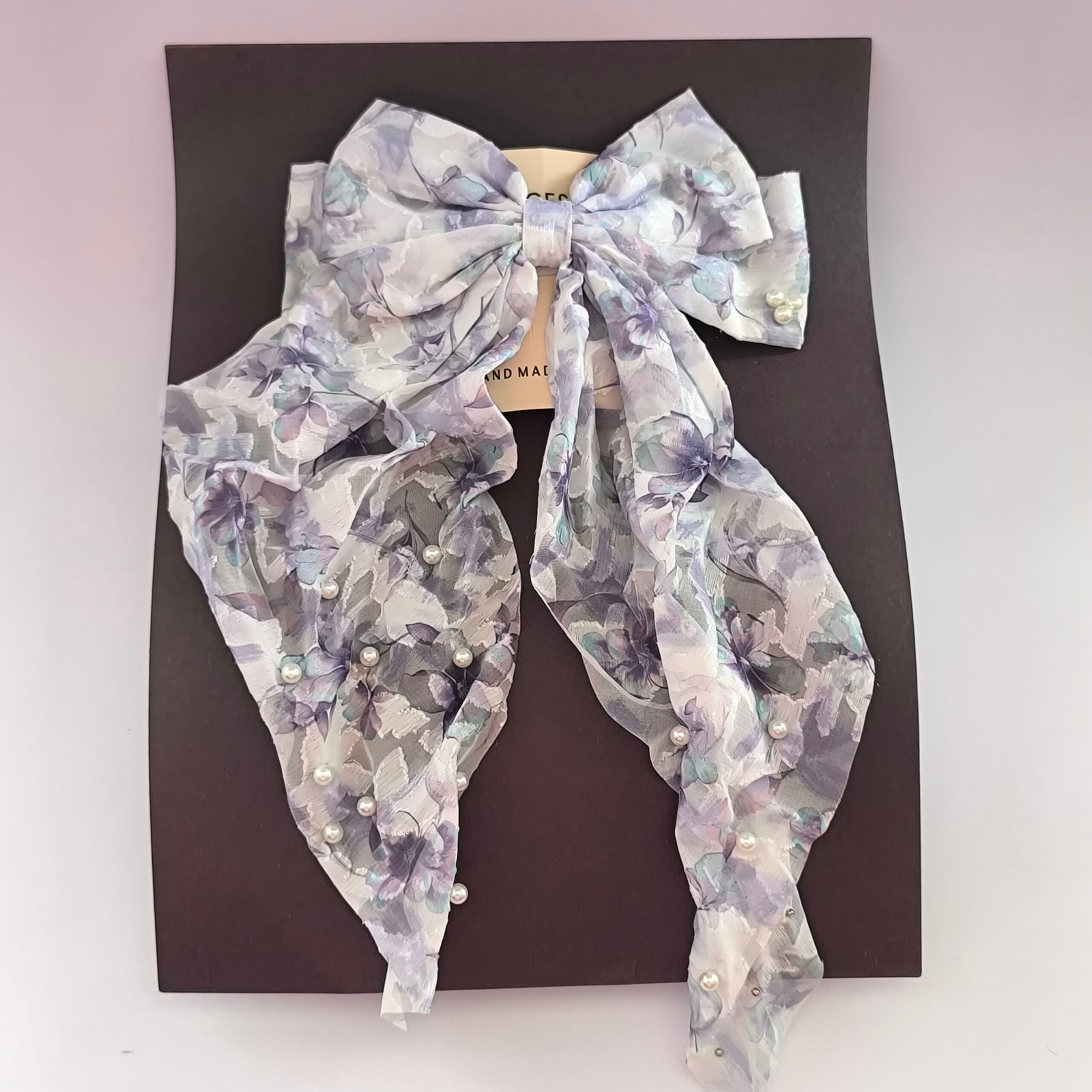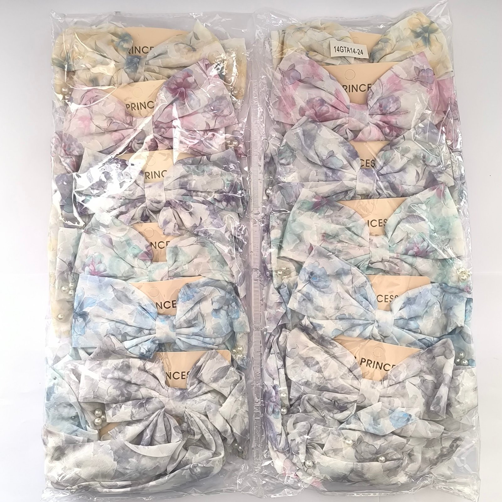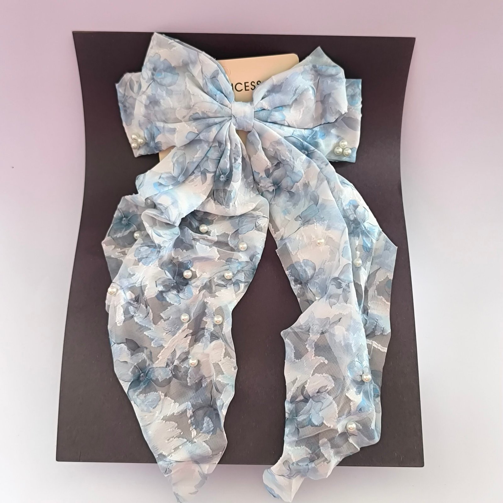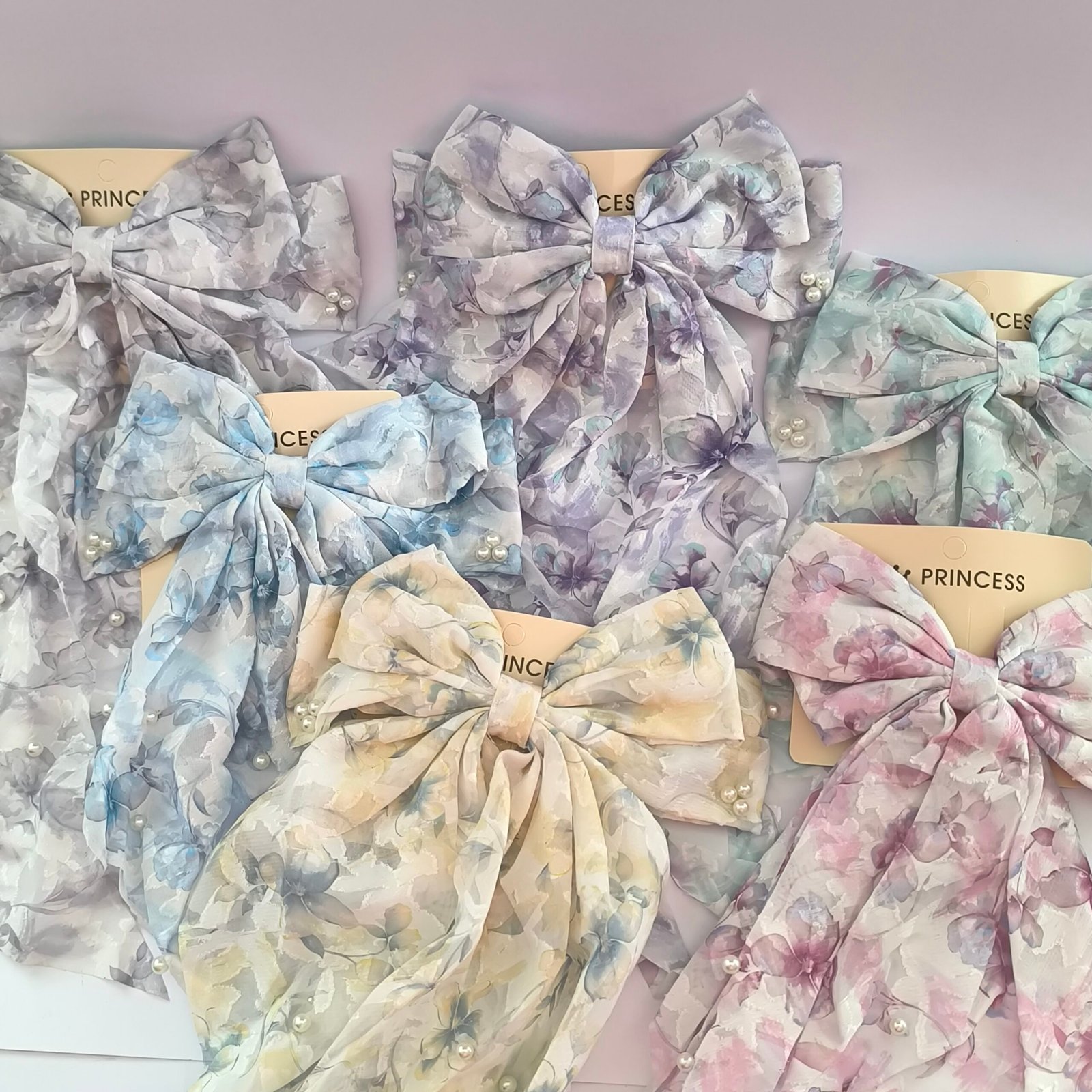 Este set incluye 12 moños para cabello con diseño floral elegante, elaborados con tela ligera estampada que crea un estilo delicado y moderno. Cada moño presenta detalles de pequeñas perlitas decorativas que aportan un toque sofisticado al accesorio.