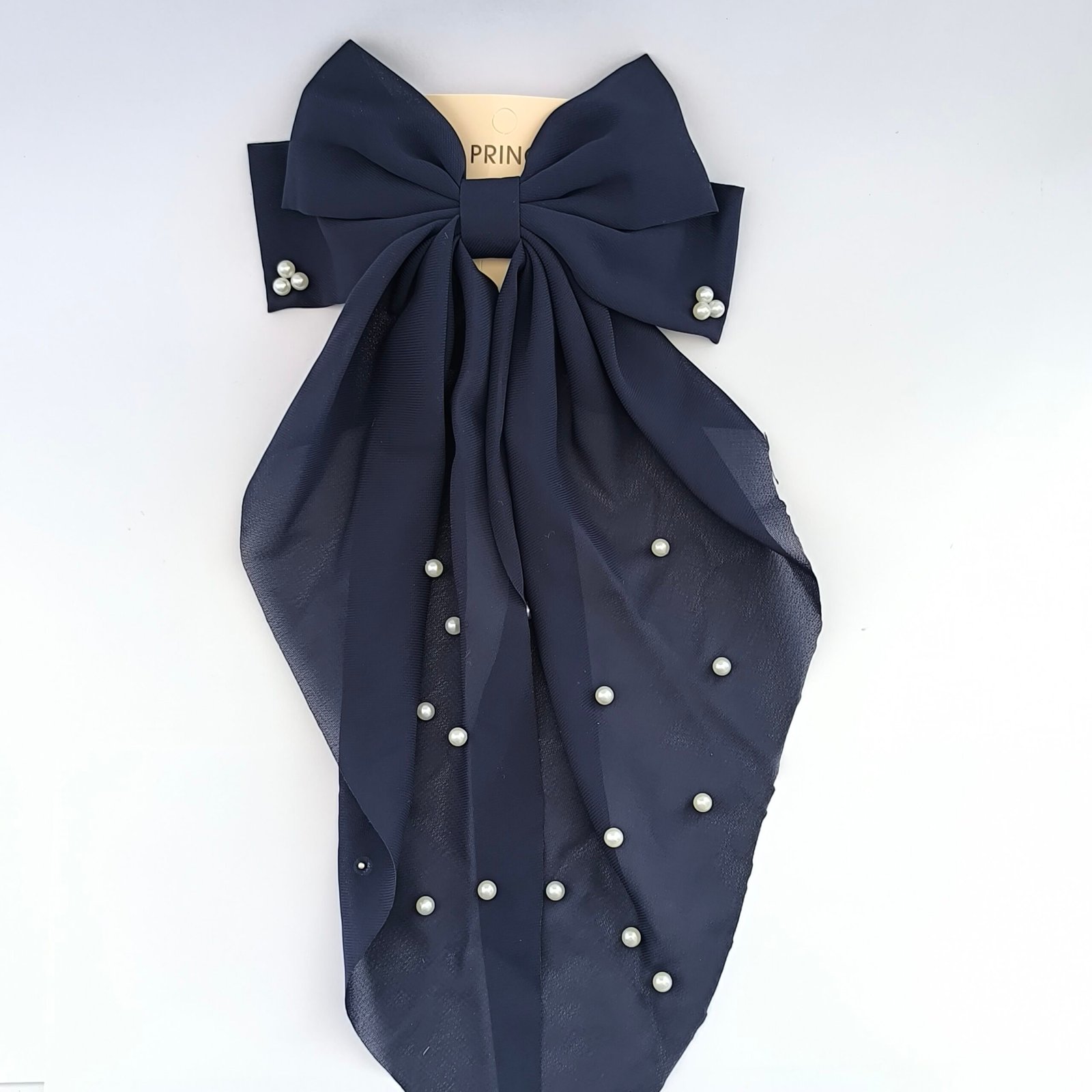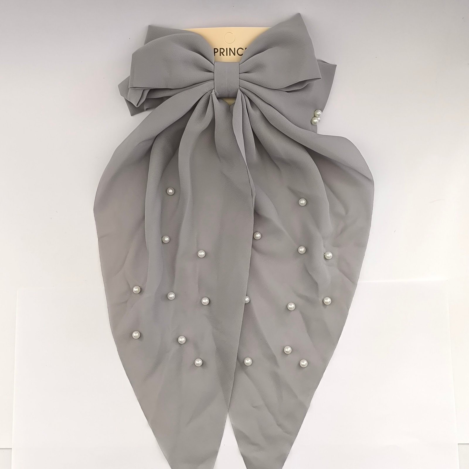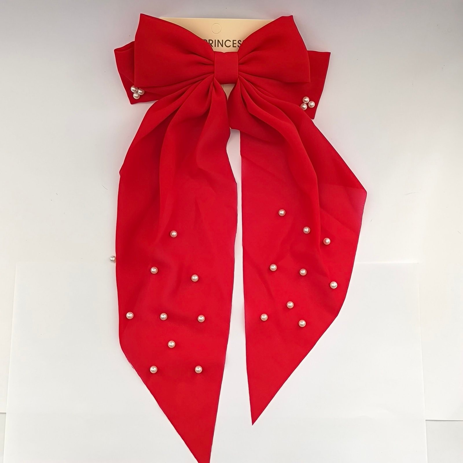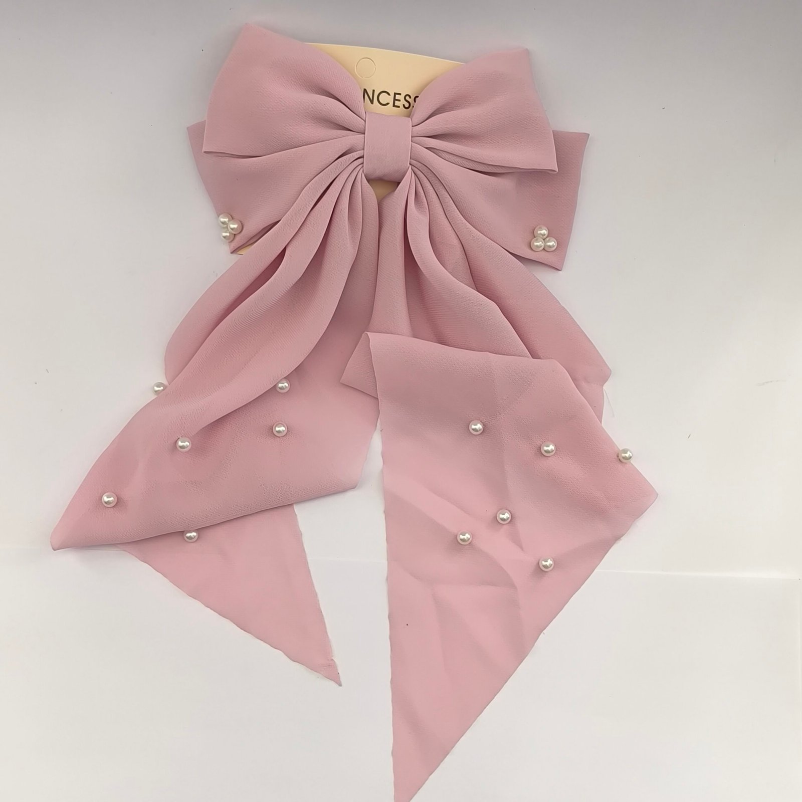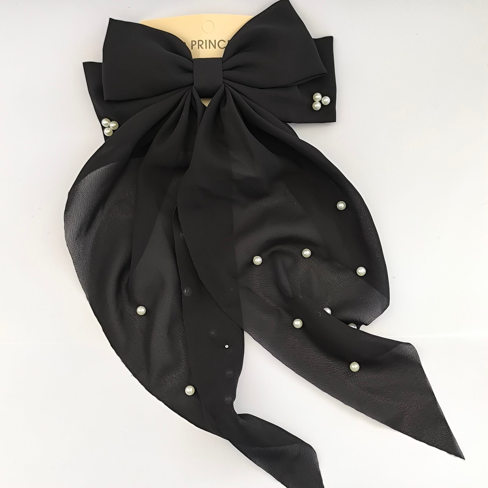 Set de 12 moños grandes para cabello con elegante diseño de lazo largo y decoración de perlitas. Cada moño cuenta con clip metálico tipo barrette que brinda buena sujeción y comodidad al usarlo.