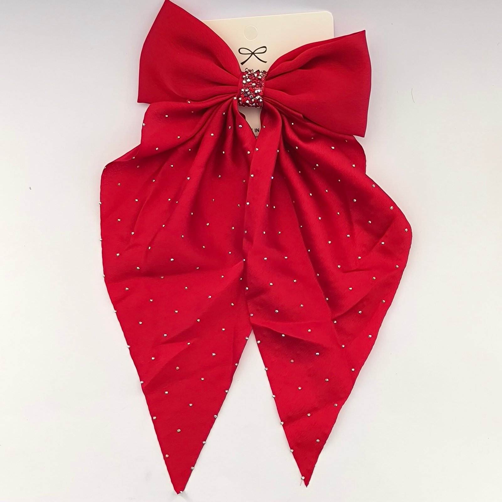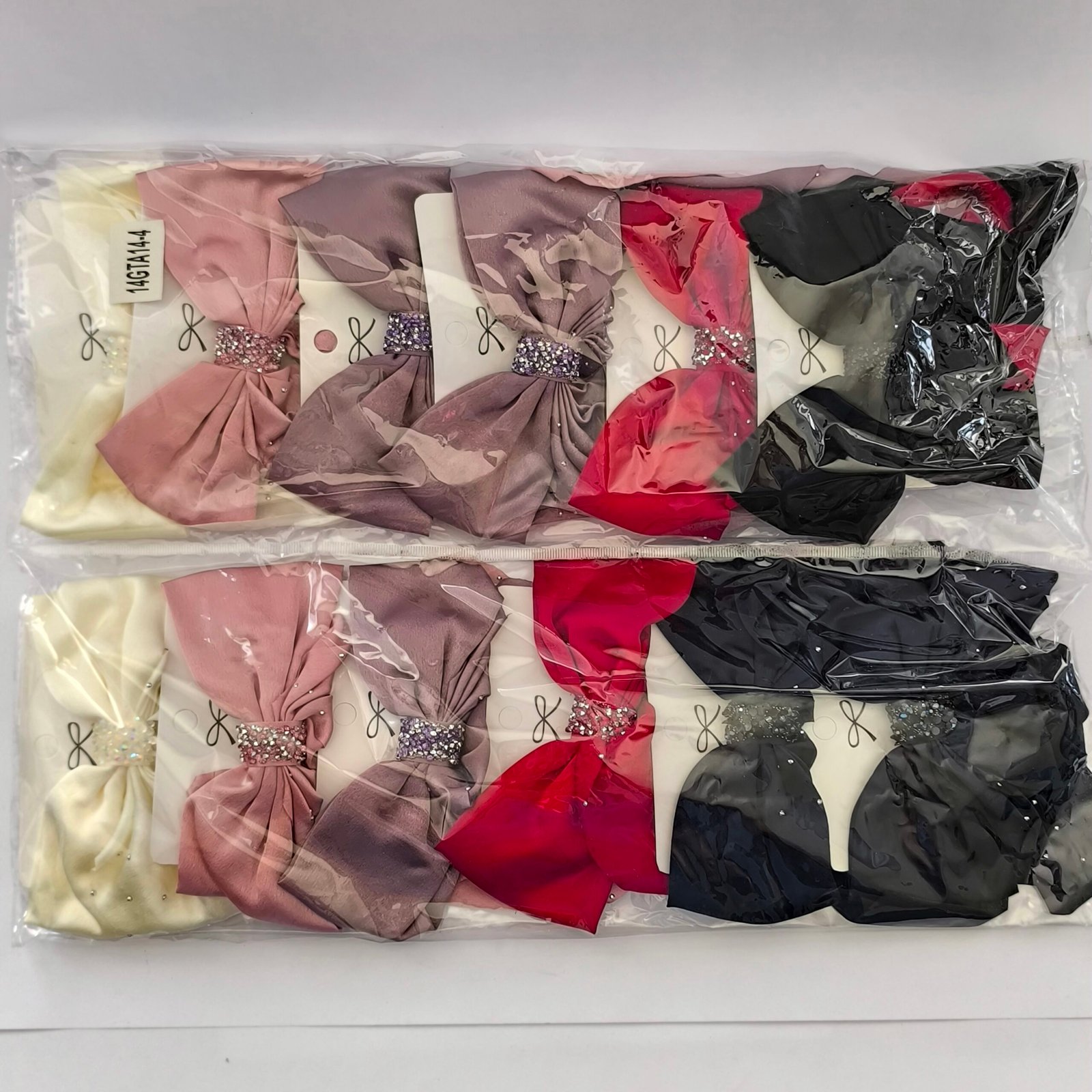 Este set incluye 12 moños grandes para cabello organizados en pares del mismo color. Cada moño presenta diseño de lazo con cola larga estilo corbata, pedrería decorativa central y pequeños puntos brillantes en la tela.