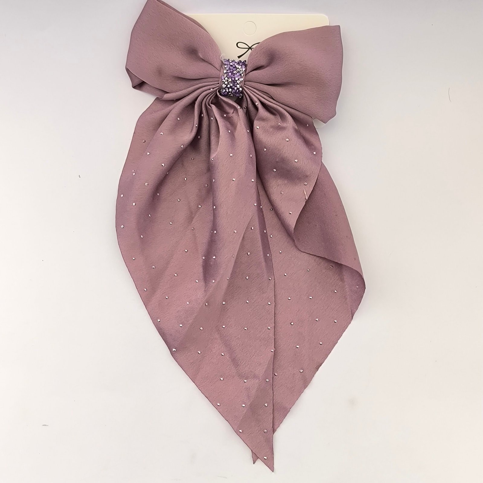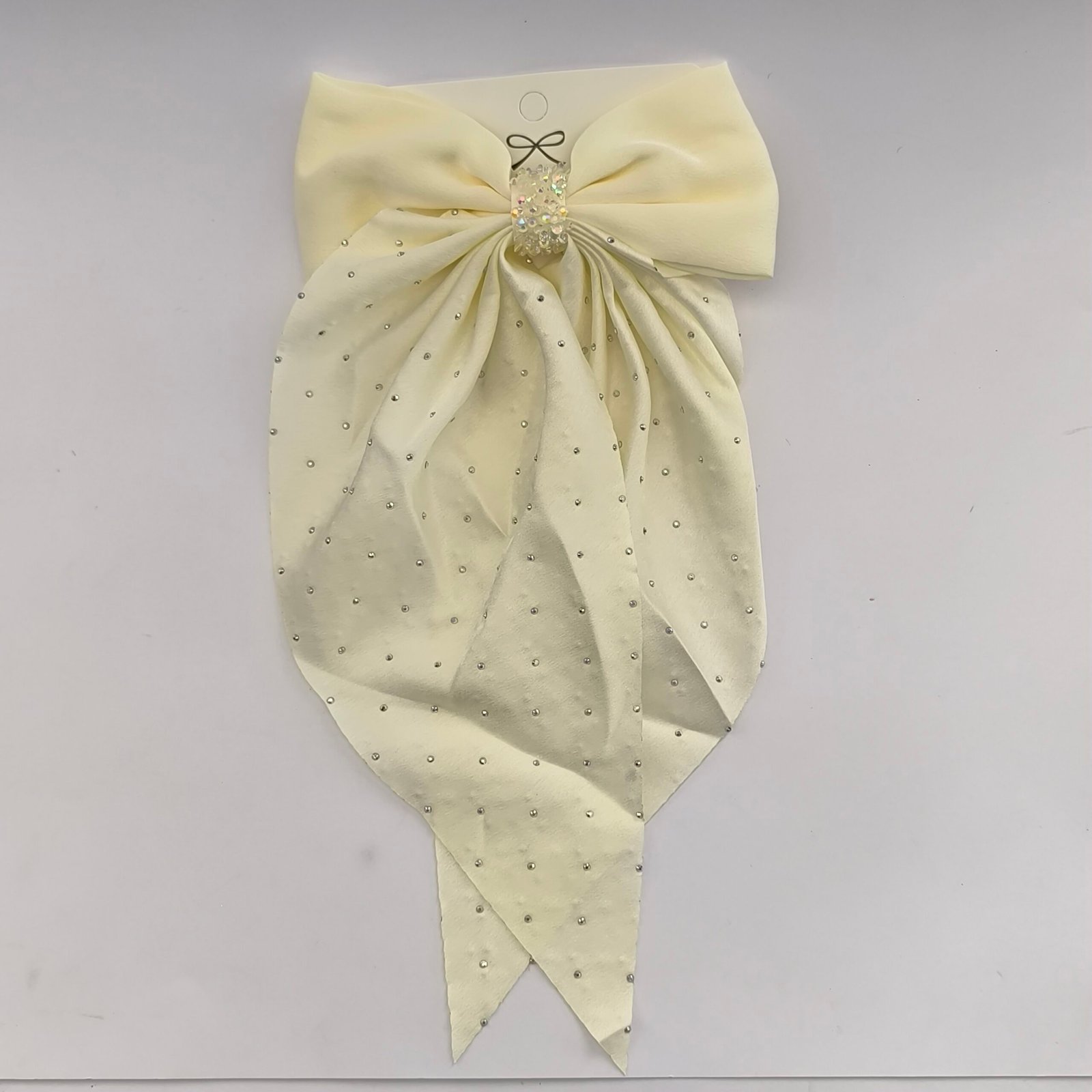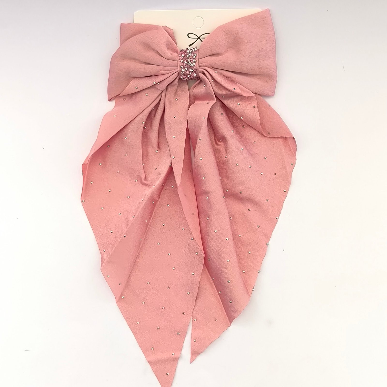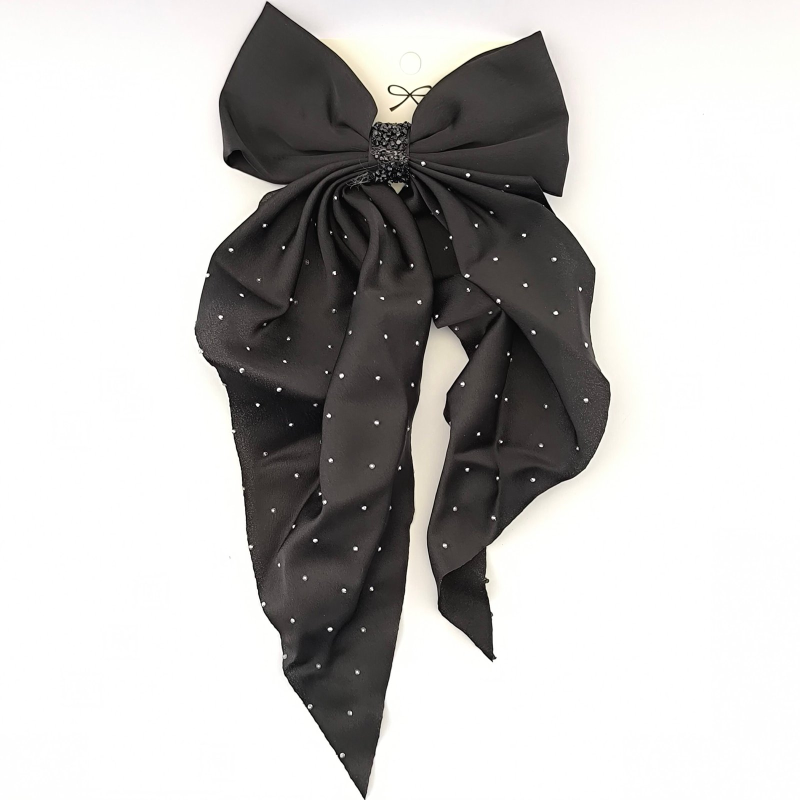 Los moños están confeccionados en tela ligera tipo gasa con caída suave, decorada con pequeños puntos brillantes distribuidos en la tela. En el centro del lazo se incorpora una banda decorativa con pedrería que aporta un detalle elegante al diseño.