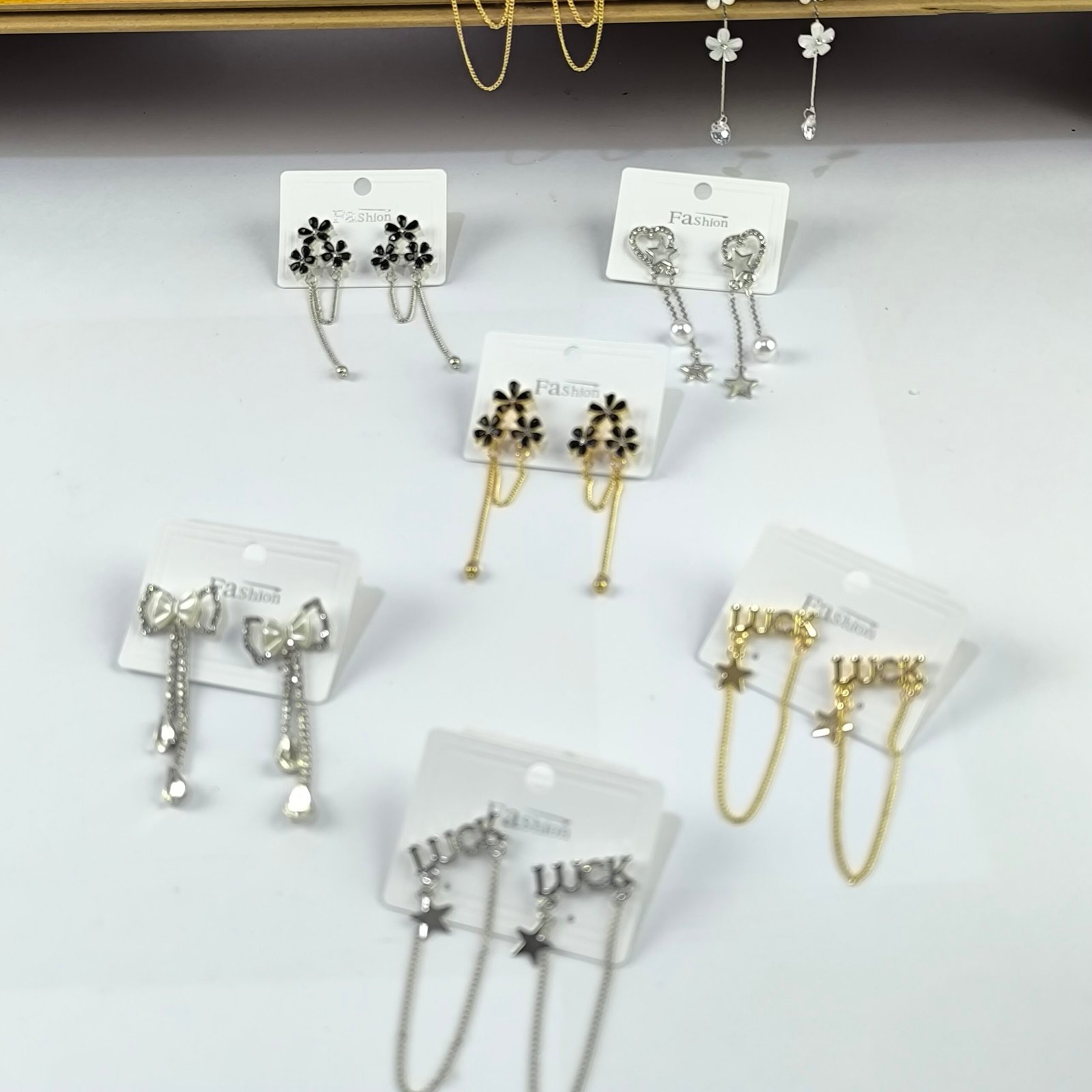 Incluye modelos con cadenas finas, caídas largas y detalles decorativos como figuras de estrellas, corazones, flores, lazos y elementos modernos. Algunos diseños incorporan cristales o perlas que aportan brillo y estilo.