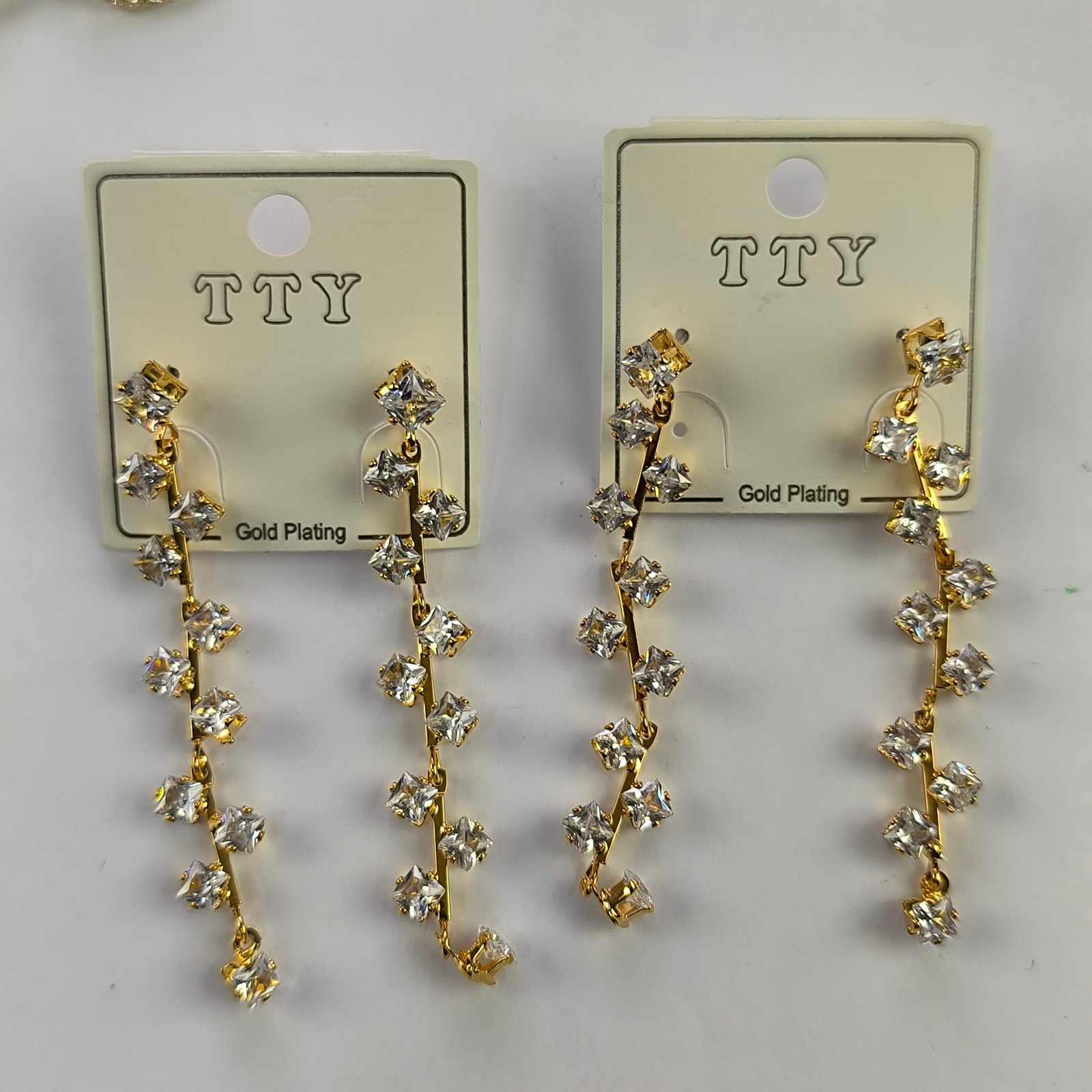 - Aretes largos tipo cascada con múltiples piedras brillantes
