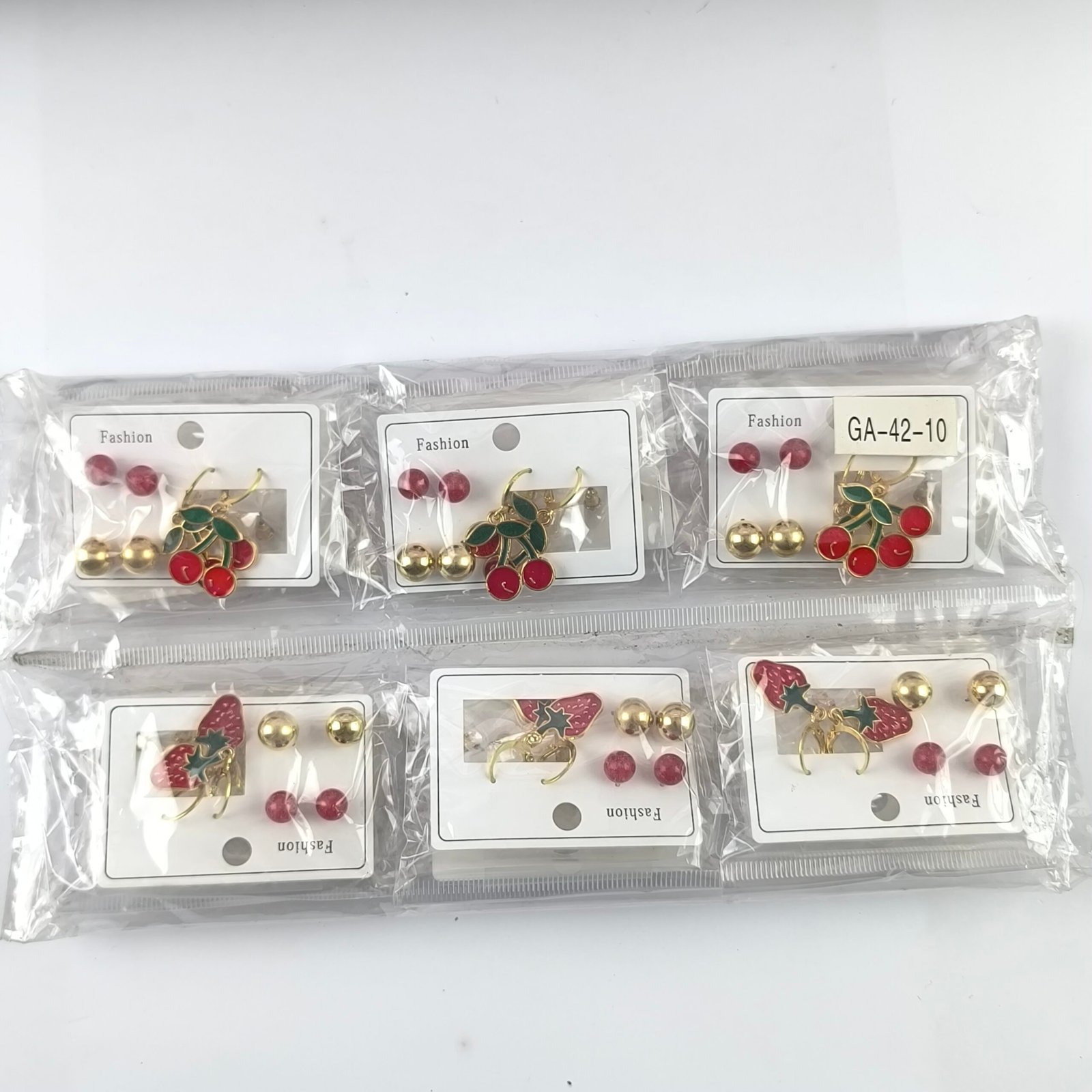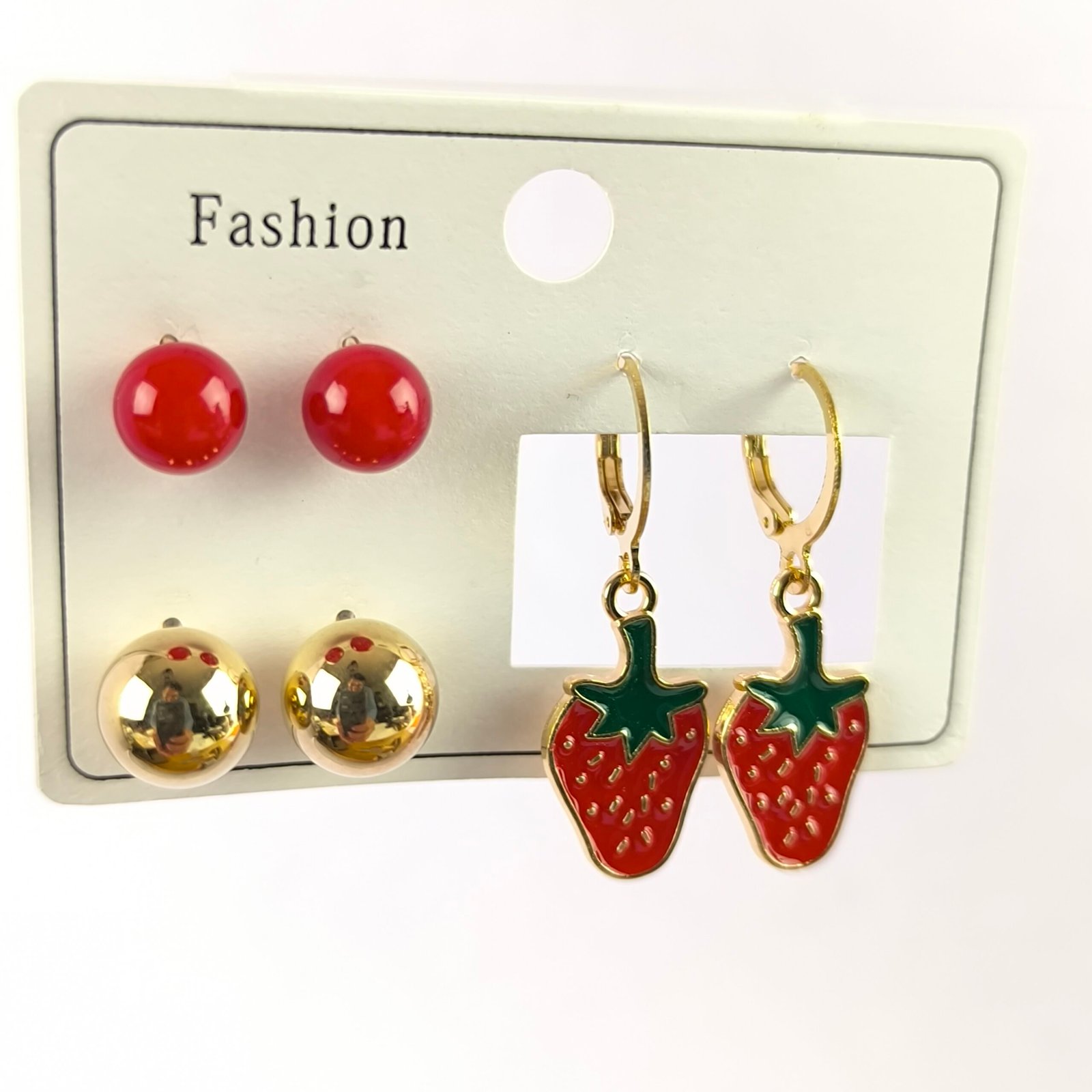 Set de aretes de 3 pares que combina estilo clásico y moderno en un solo paquete. Incluye un par de aretes colgantes con diseño frutal (cereza o fresa), un par tipo bola y un par de aros dorados.