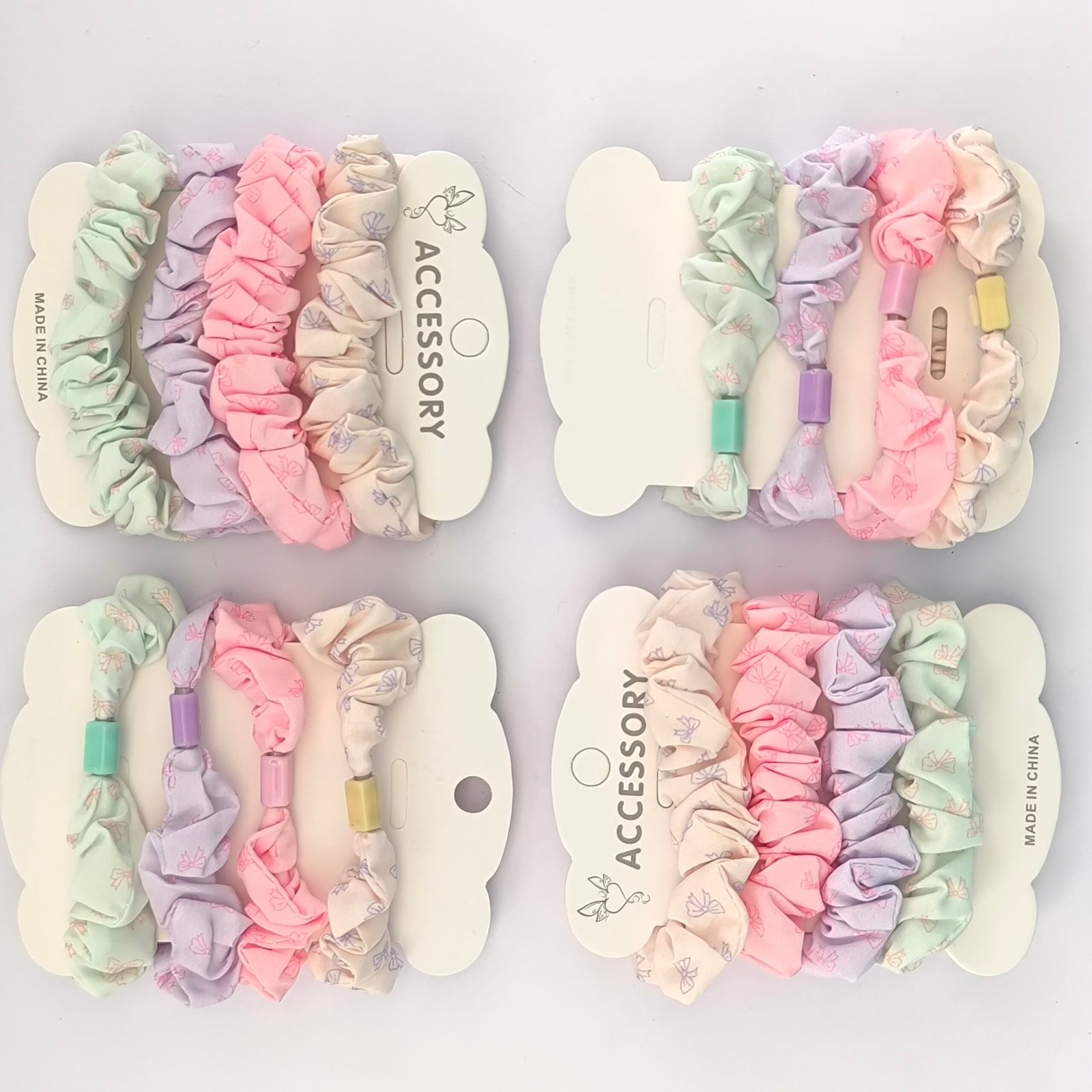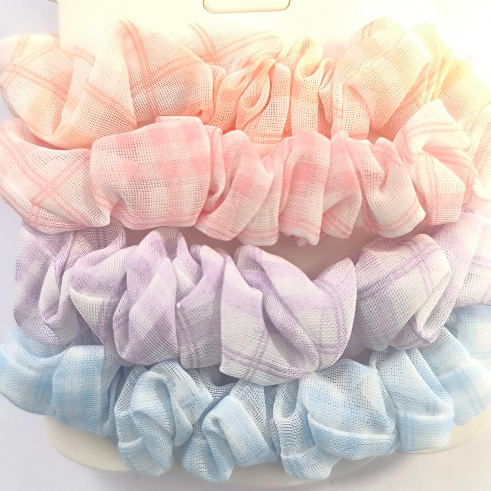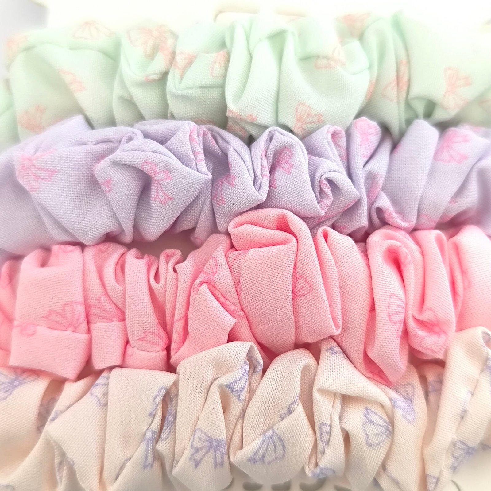 Set de coleteros scrunchie en colores pastel suaves. Ligas de tela cómodas y elásticas ideales para peinados diarios y accesorios de cabello femeninos.