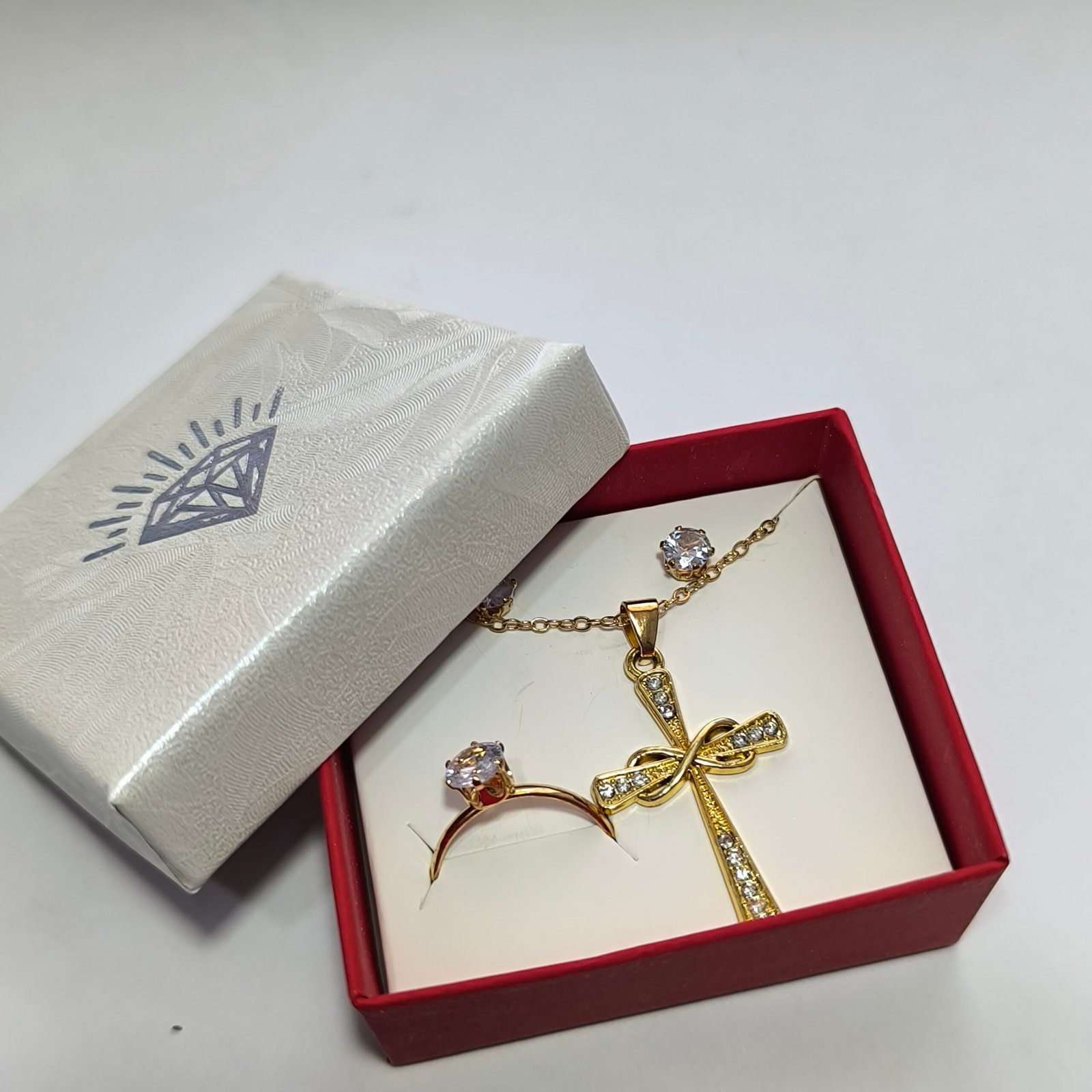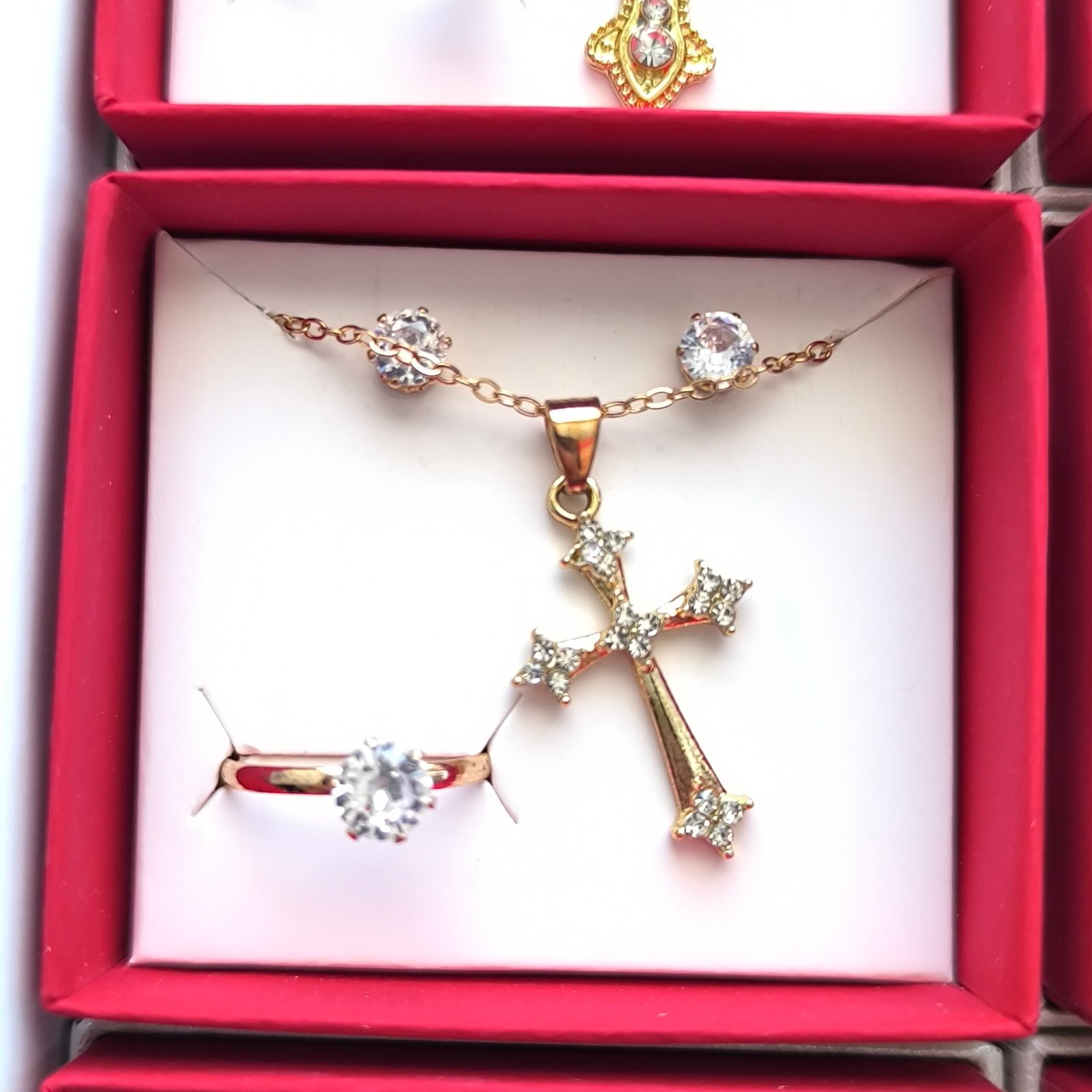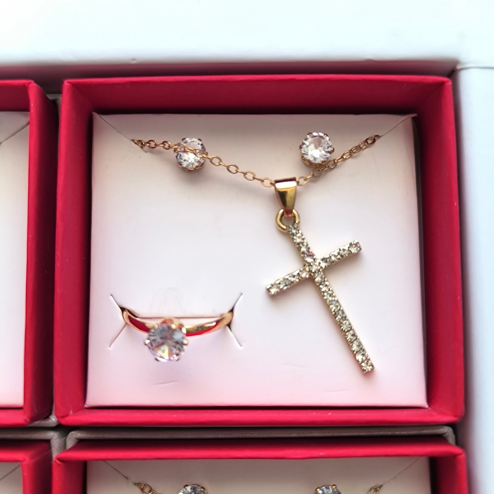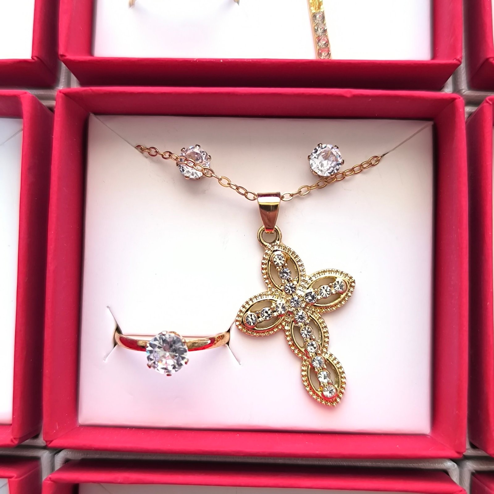 Set de joyeria elegante para mujer con collar de cruz, un par de aretes y anillo con piedra brillante, presentado en cajita individual lista para regalo. Ventas por mayor.