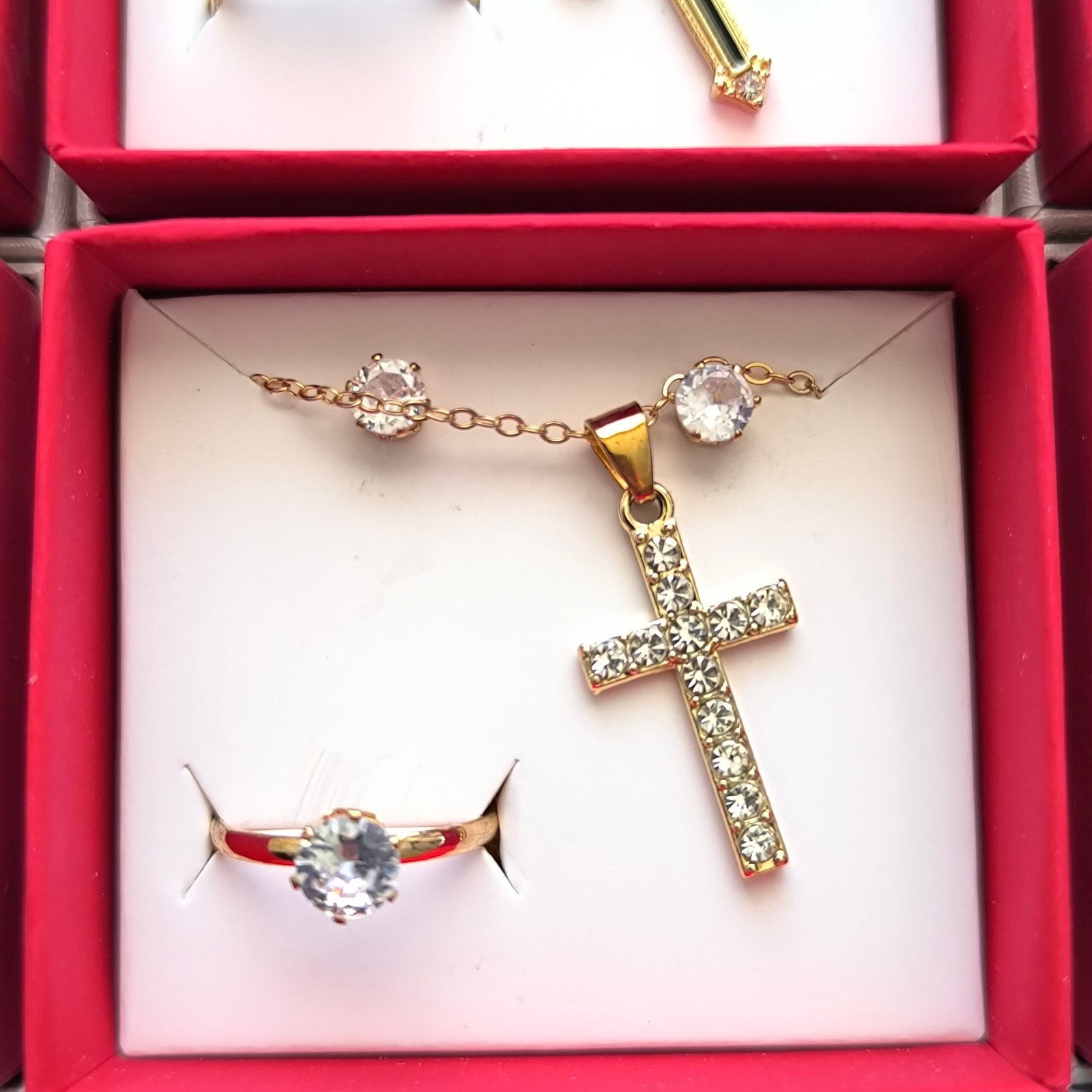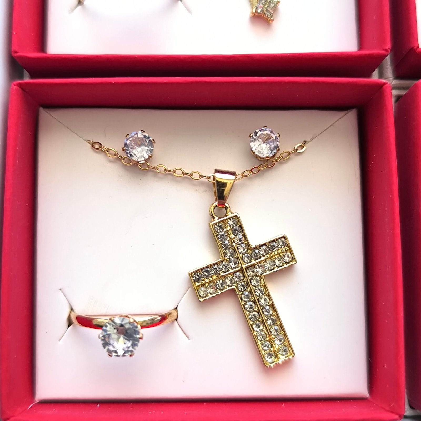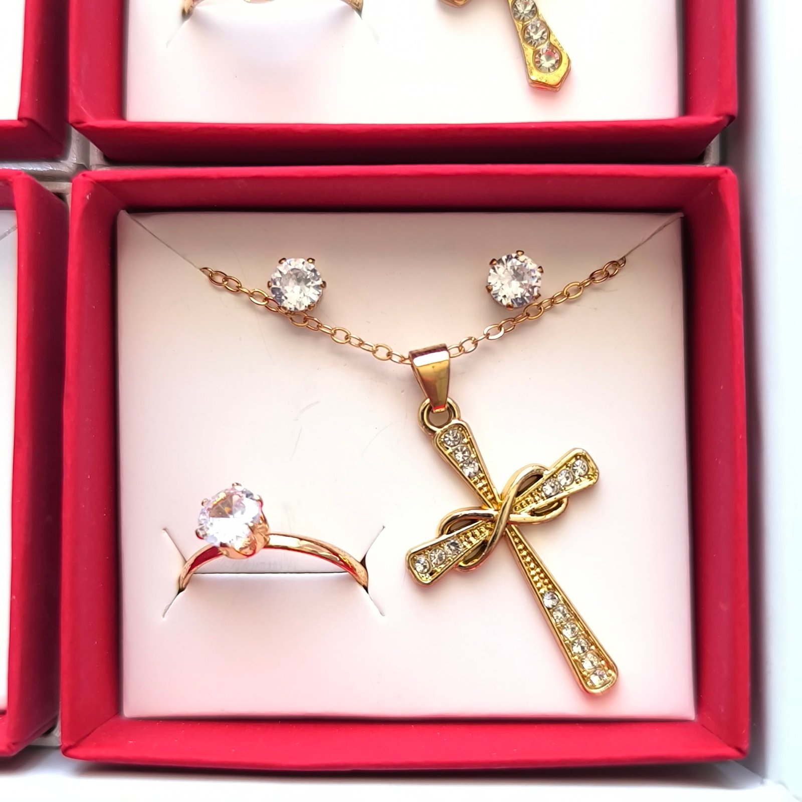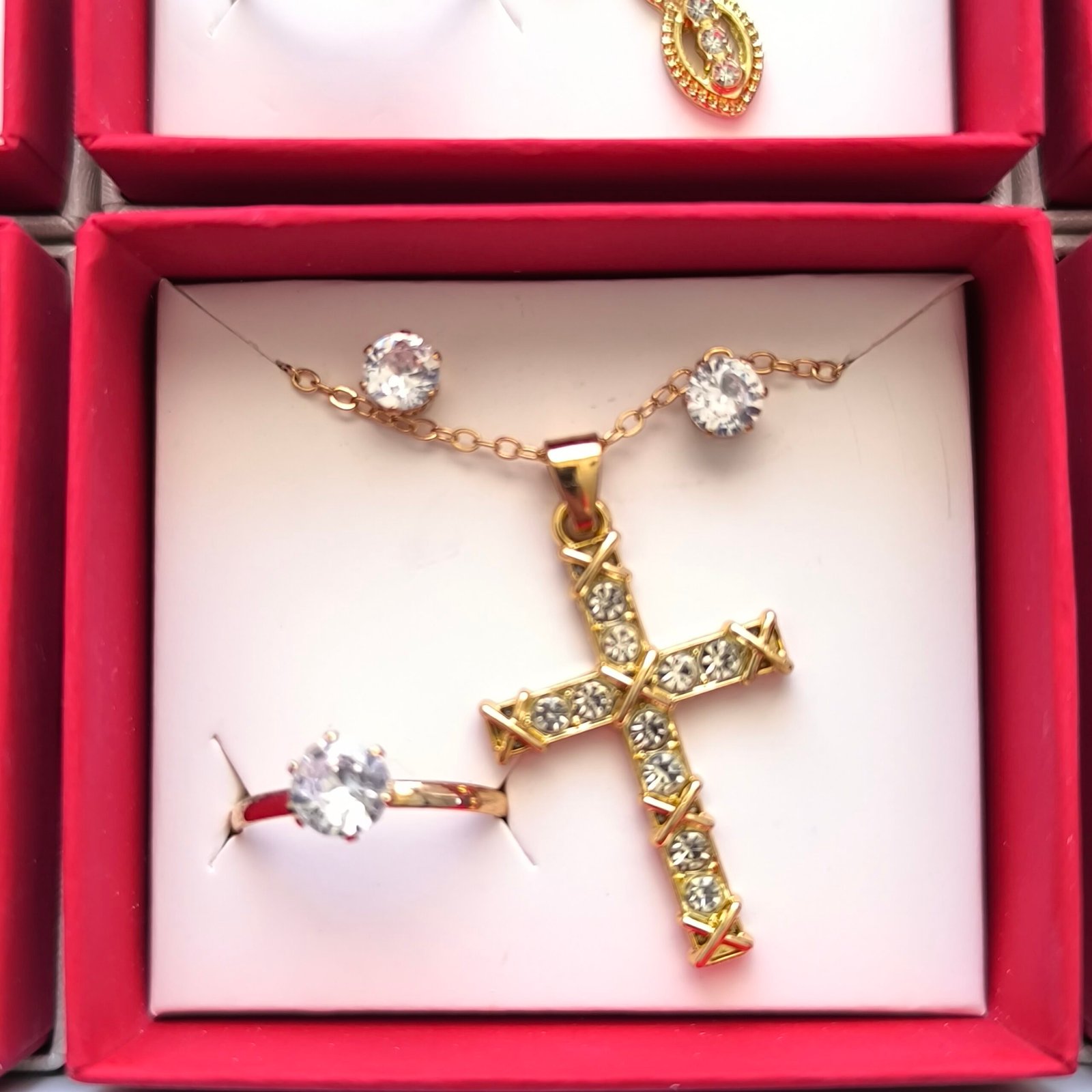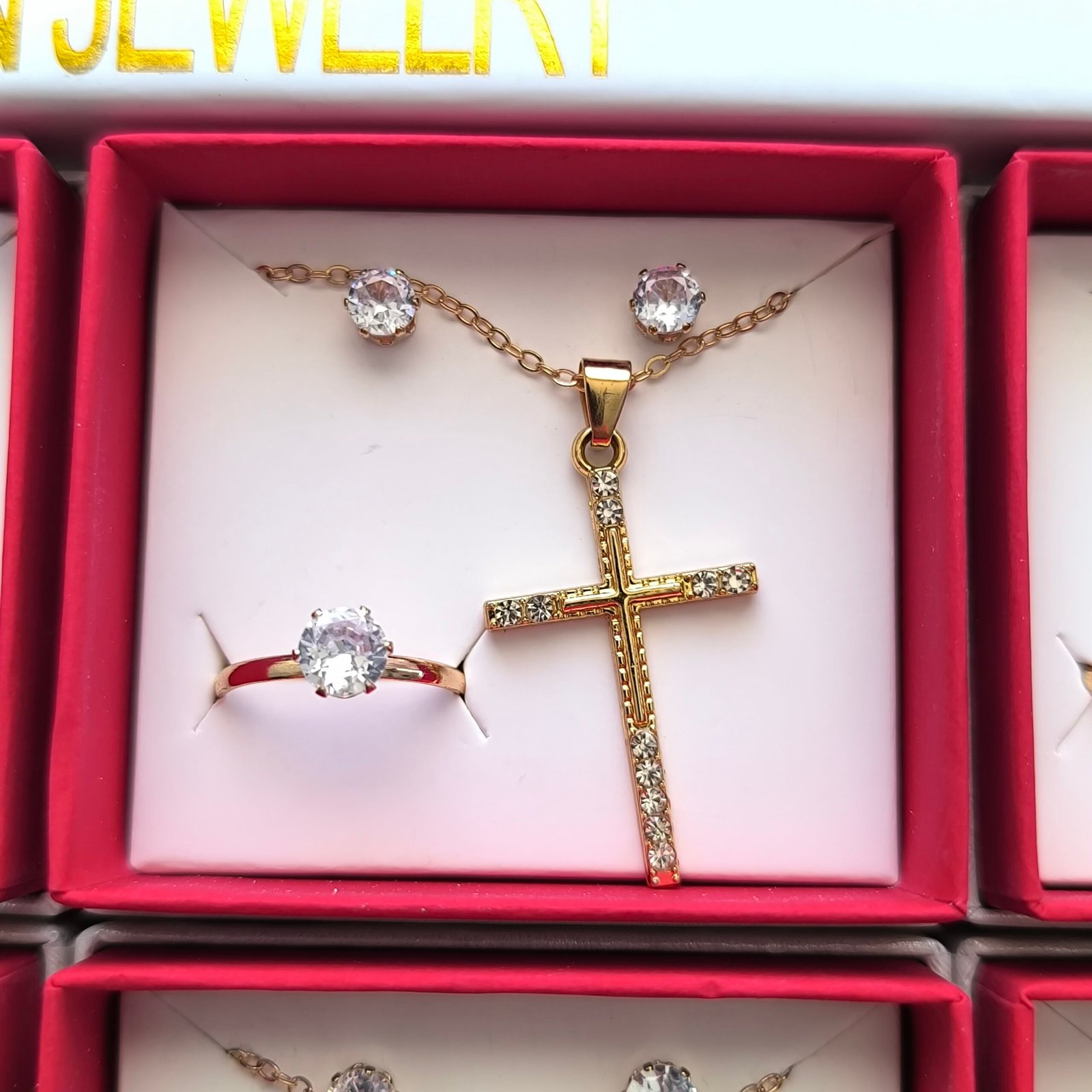 Set de joyeria elegante para mujer con collar de cruz, un par de aretes y anillo con piedra brillante, presentado en cajita individual lista para regalo. Ventas por mayor.
