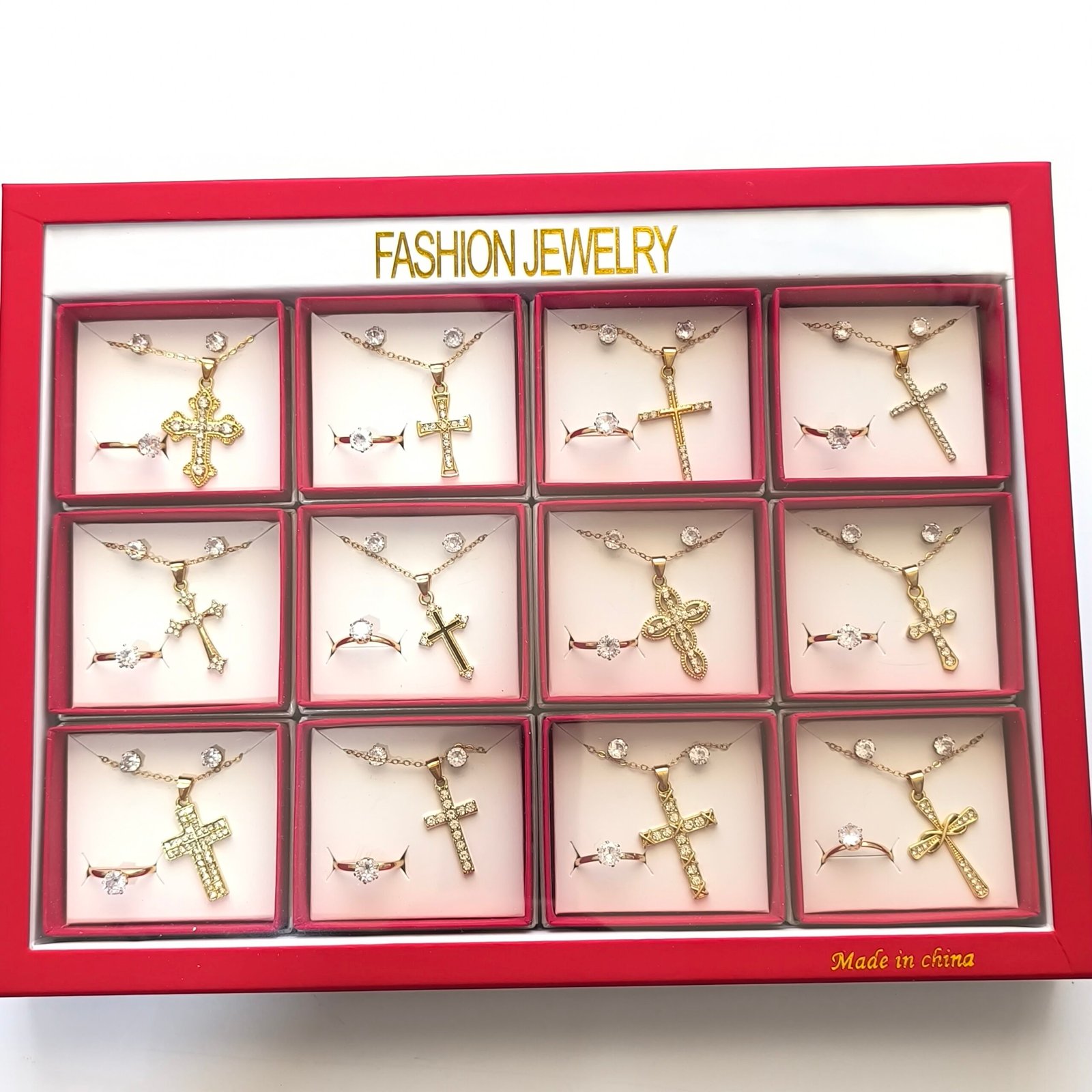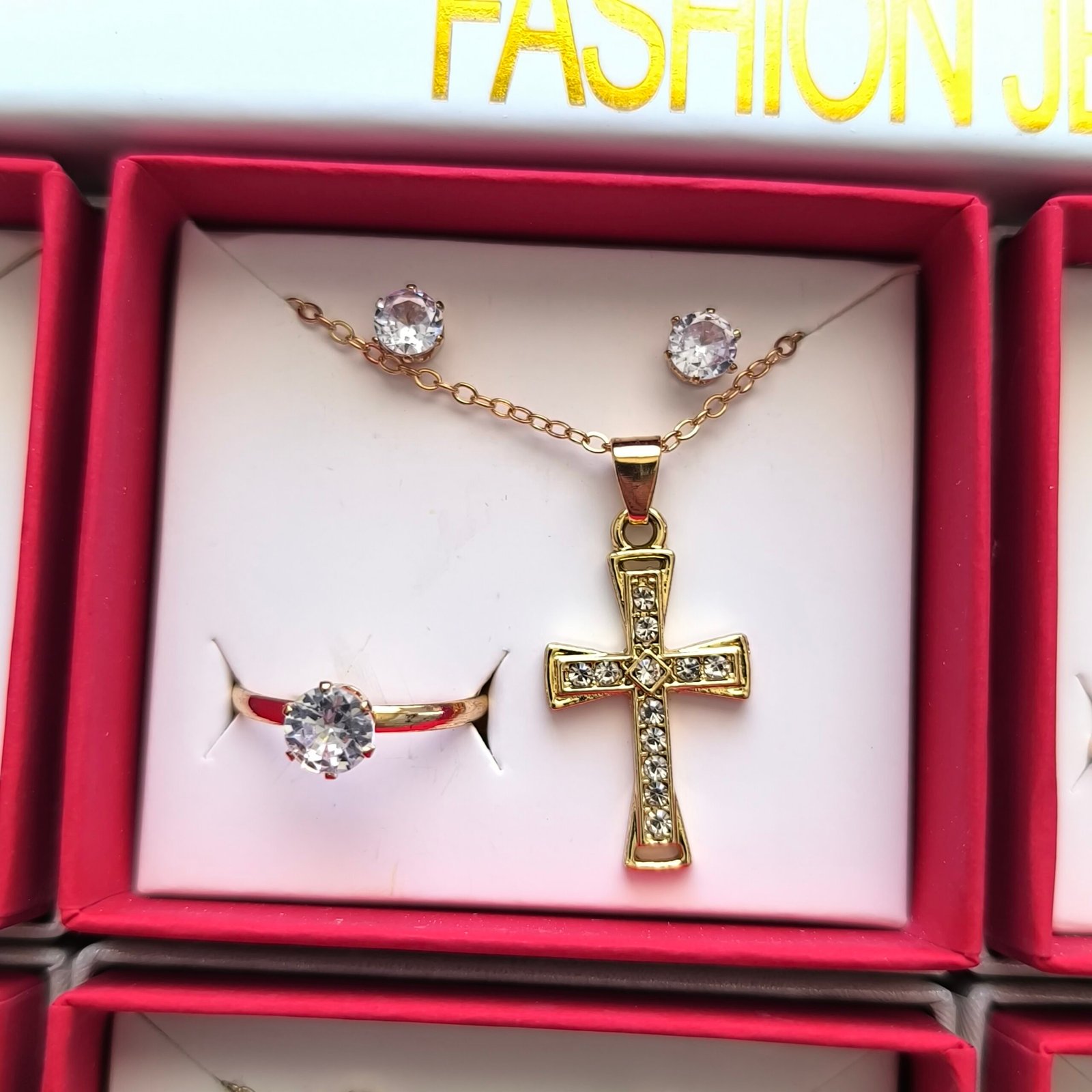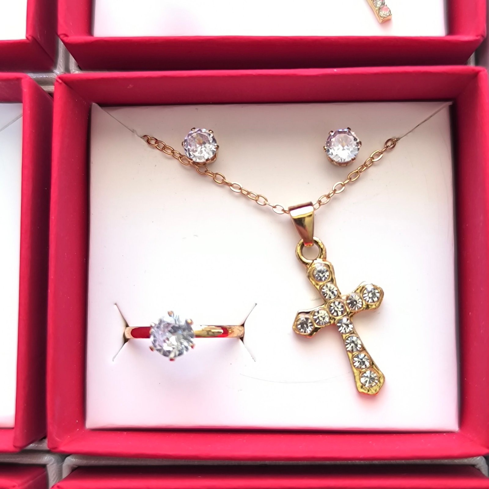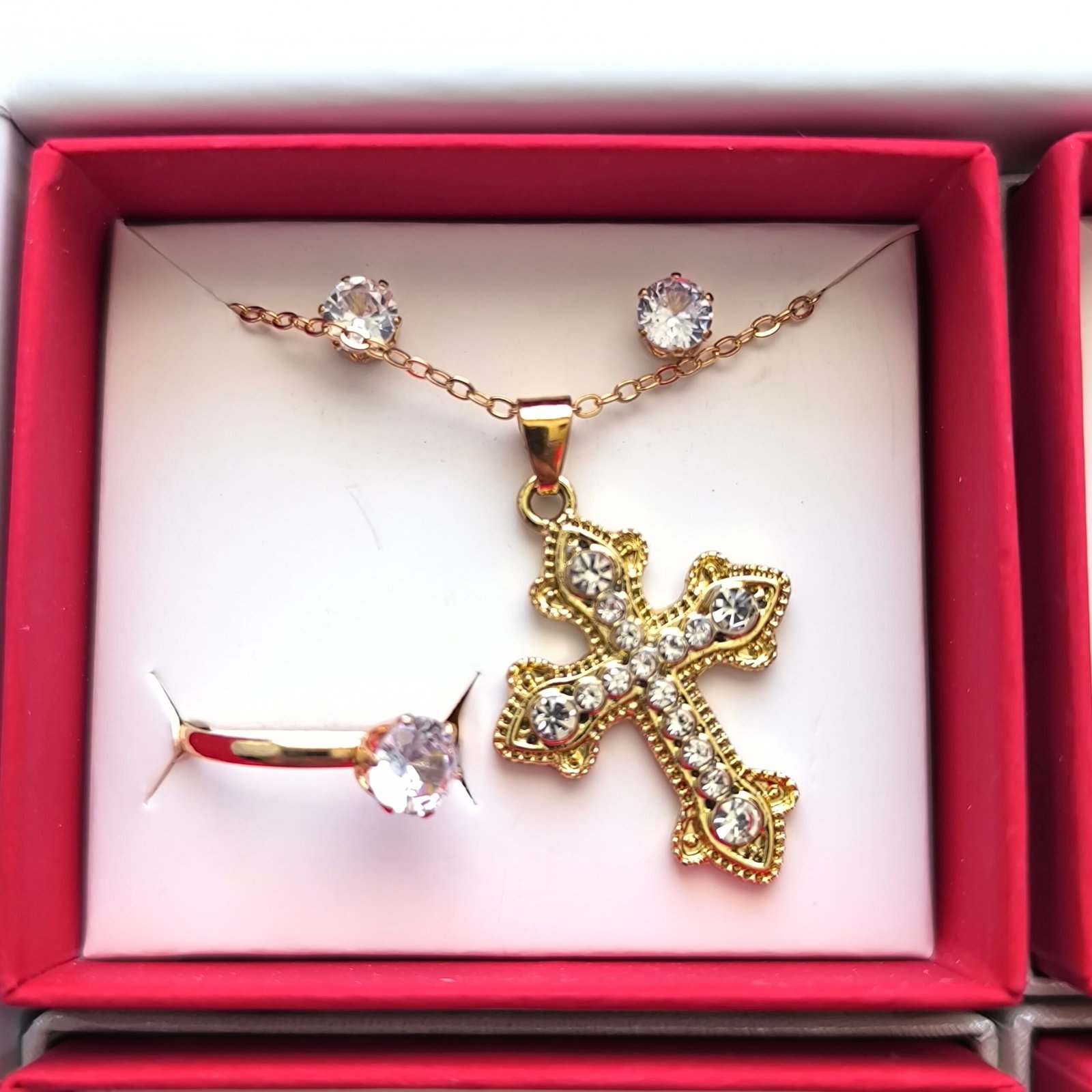 Set de joyeria elegante para mujer con collar de cruz, un par de aretes y anillo con piedra brillante, presentado en cajita individual lista para regalo. Ventas por mayor.