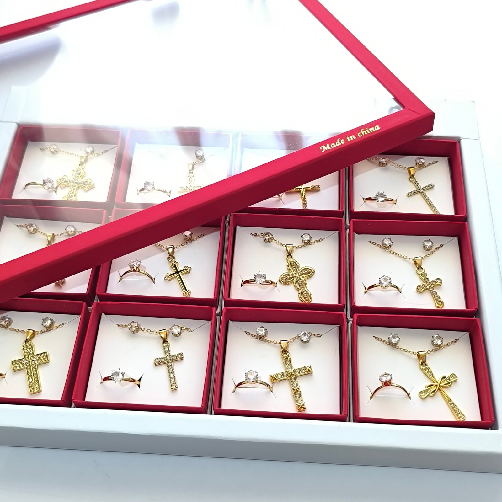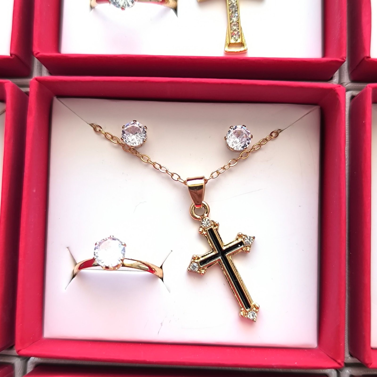 Este set de joyeria destaca por su presentacion elegante y por la variedad de modelos que incluye en cada paquete. Cada cajita contiene un conjunto completo con collar de cruz, un par de aretes tipo topo y un anillo con piedra central brillante. Es un producto visualmente atractivo, delicado y listo para exhibir o entregar.