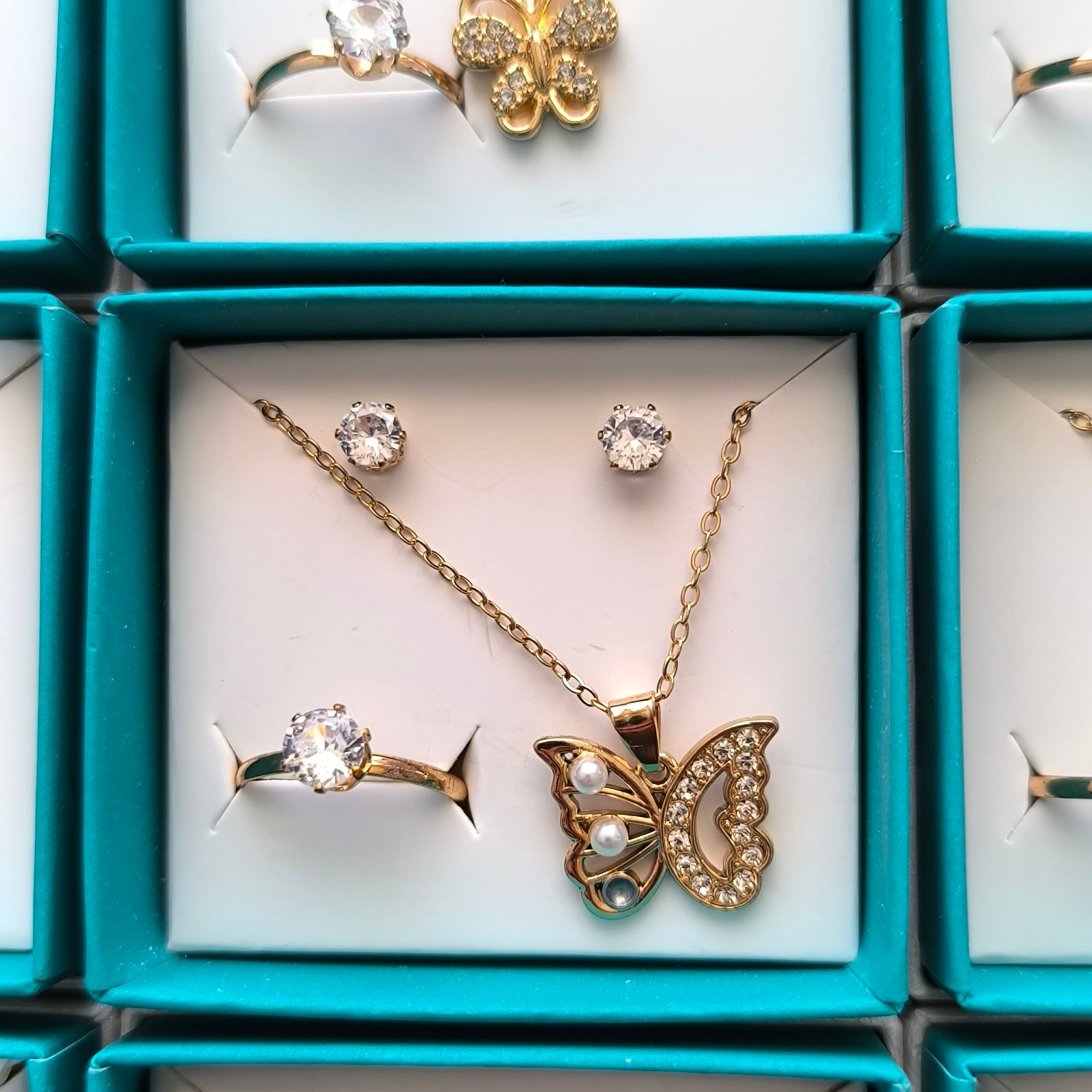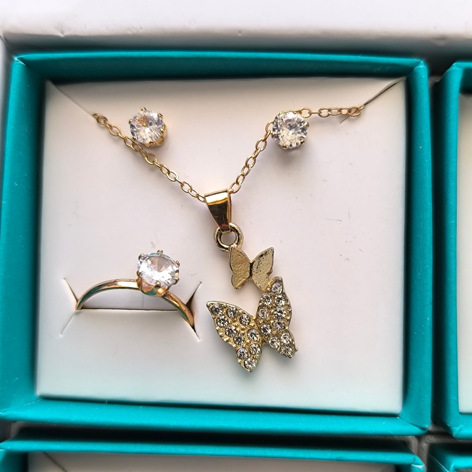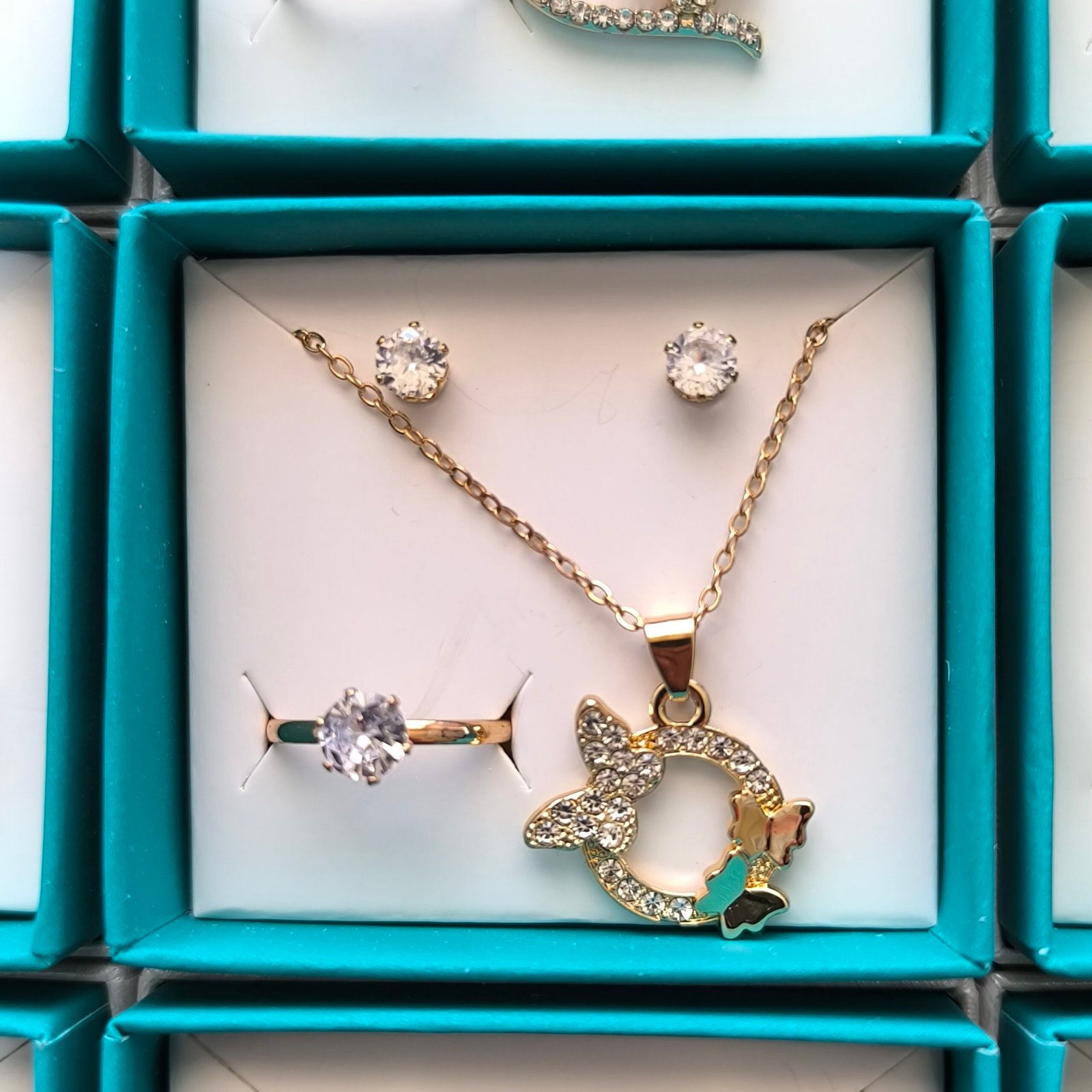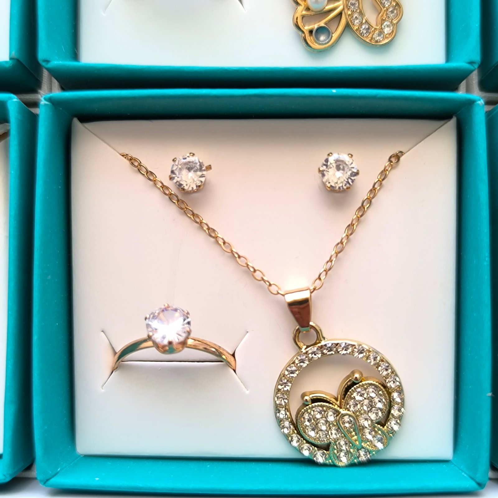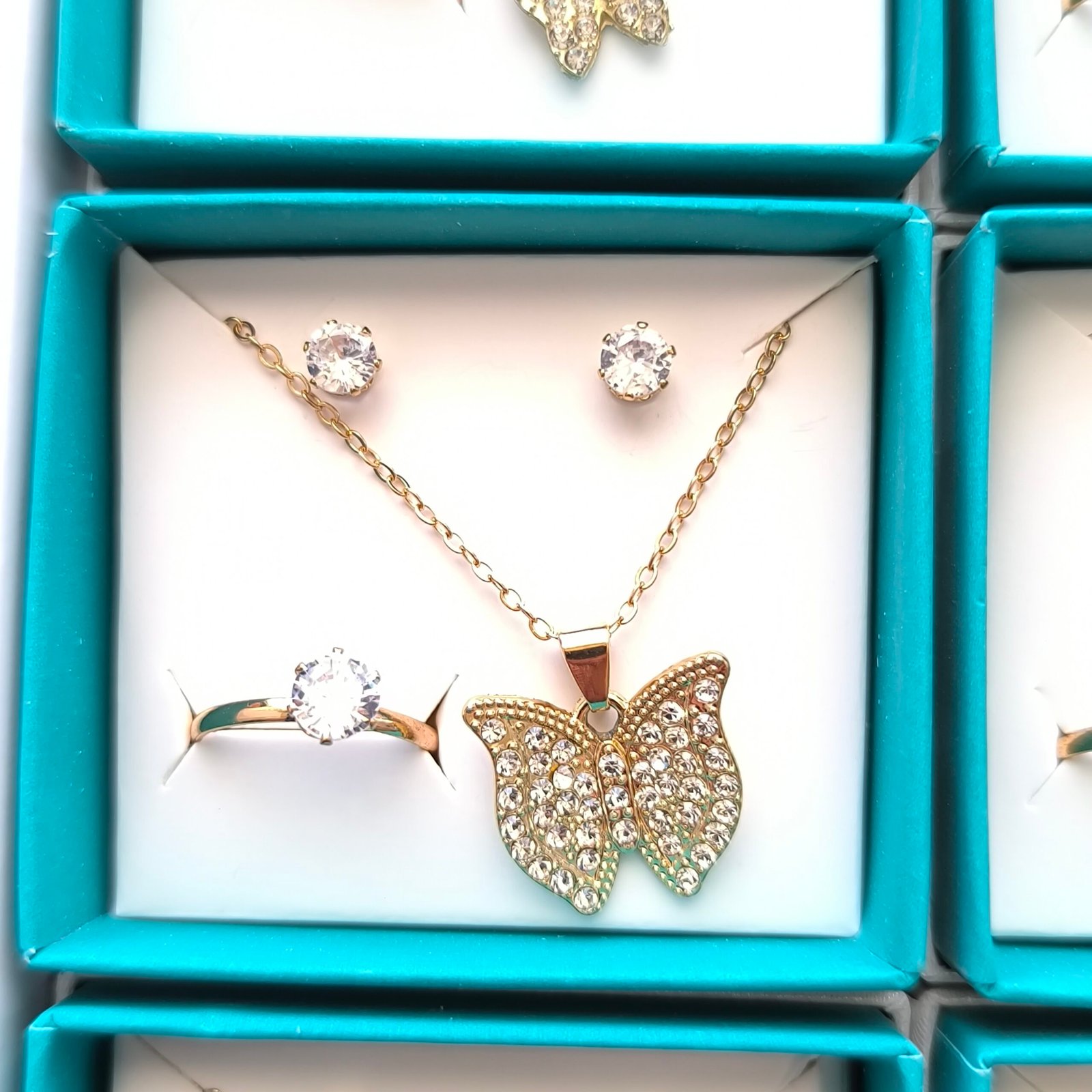 Set de joyeria femenina con collar, aretes tipo topo y anillo con piedra brillante, en diseños modernos como mariposas, corazones y figuras elegantes. Presentacion en cajita individual lista para regalo.