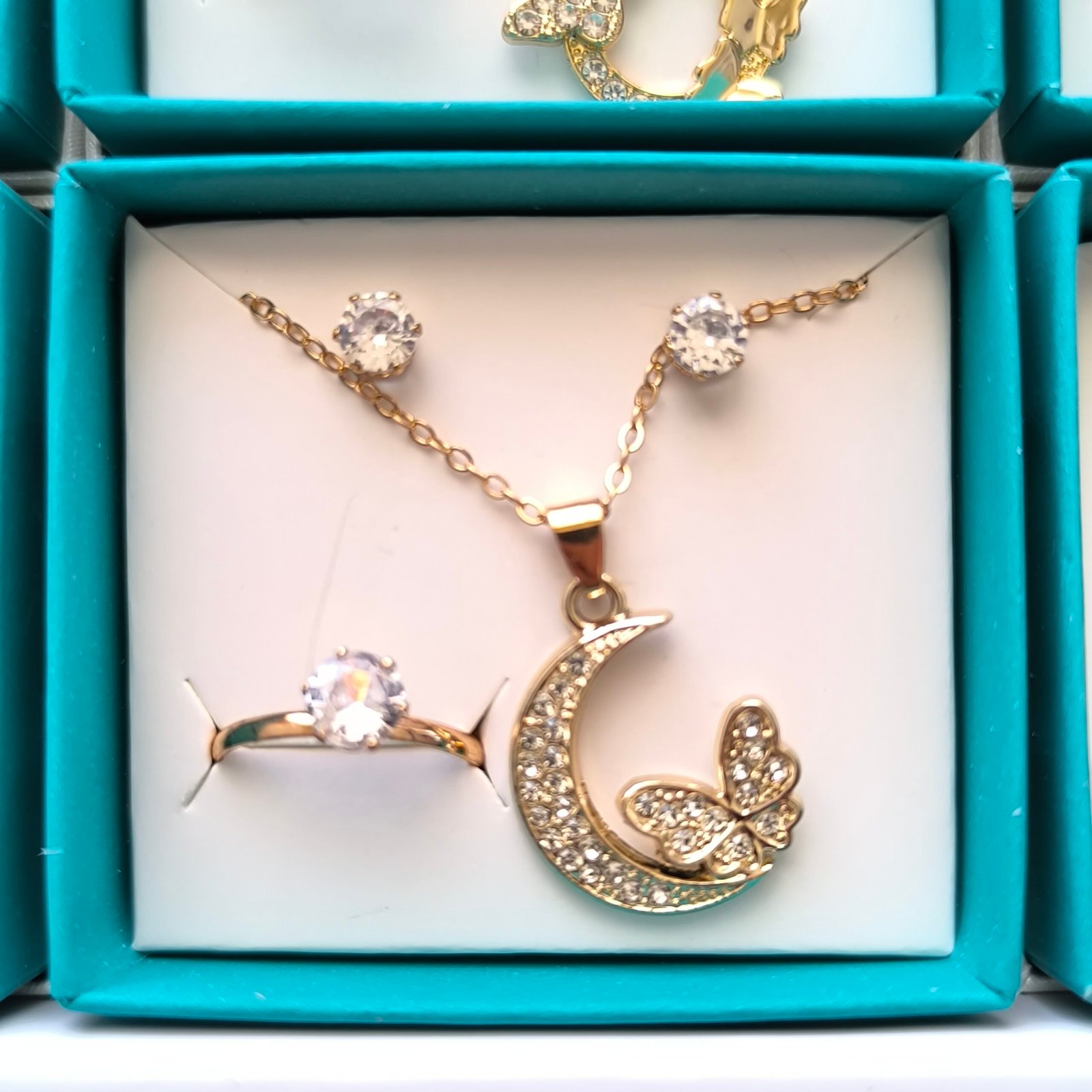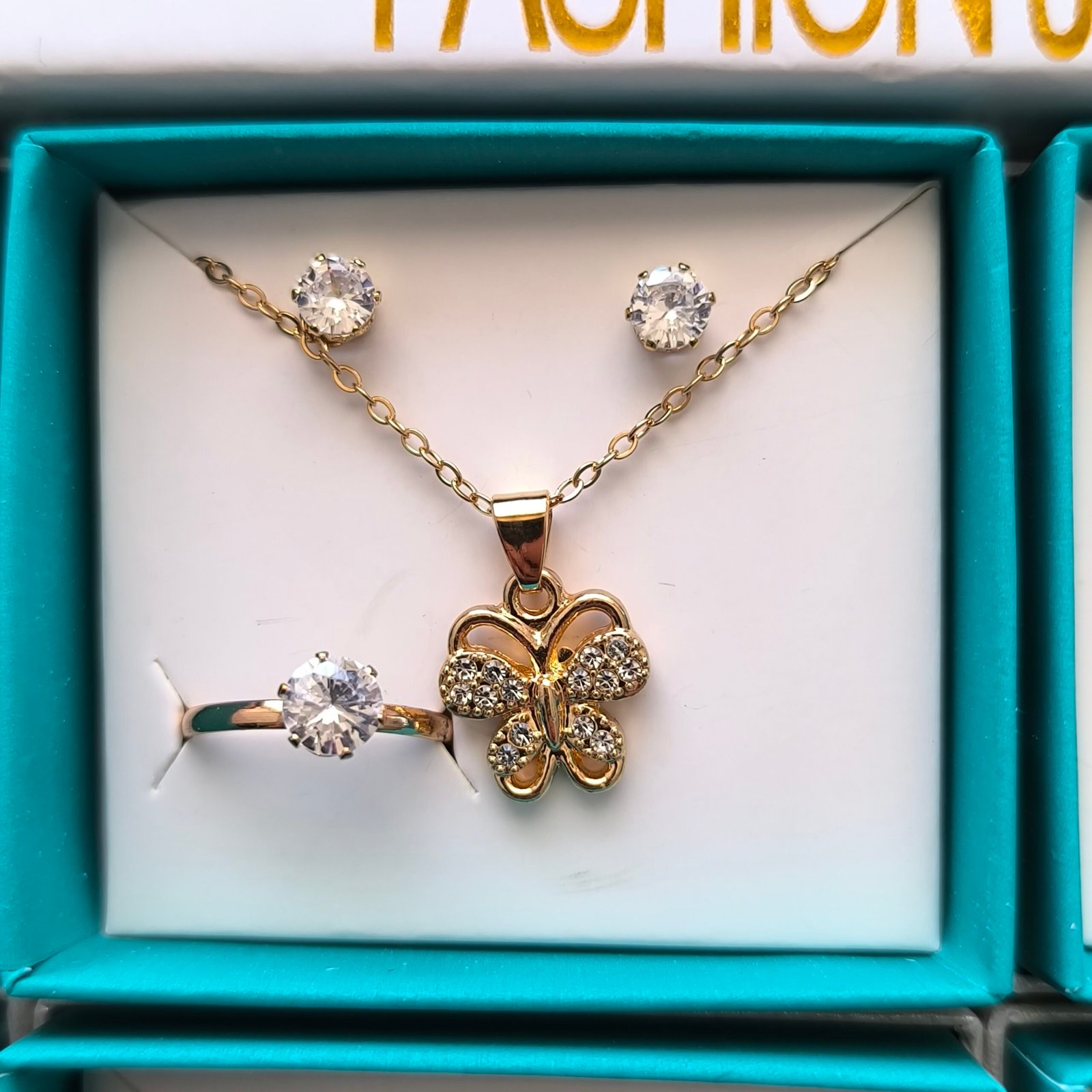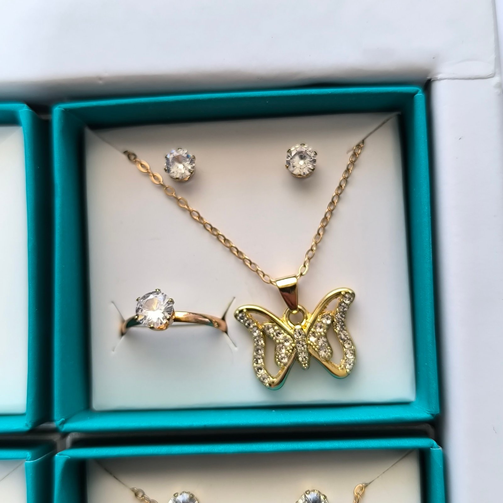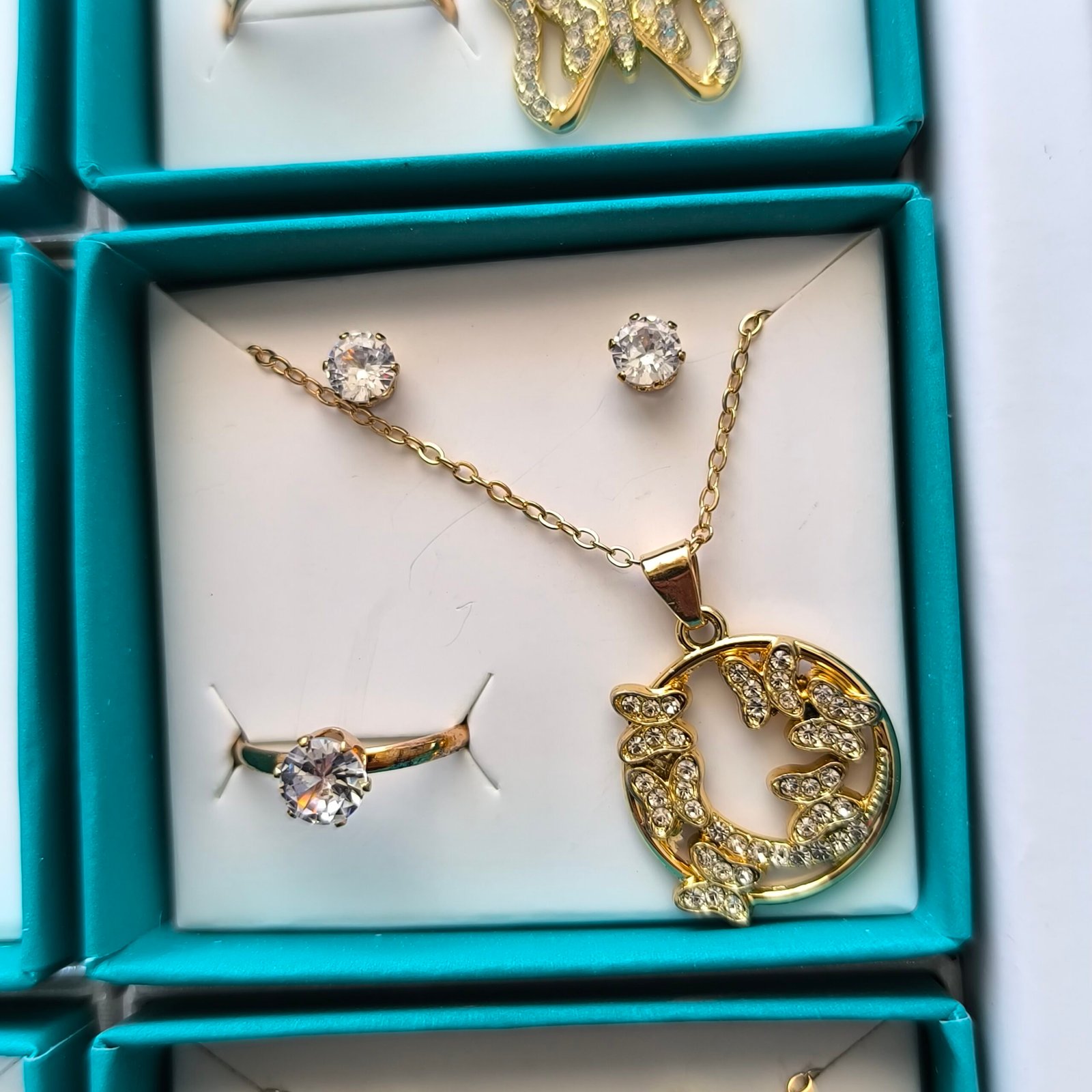 Set de joyeria femenina con collar, aretes tipo topo y anillo con piedra brillante, en diseños modernos como mariposas, corazones y figuras elegantes. Presentacion en cajita individual lista para regalo.