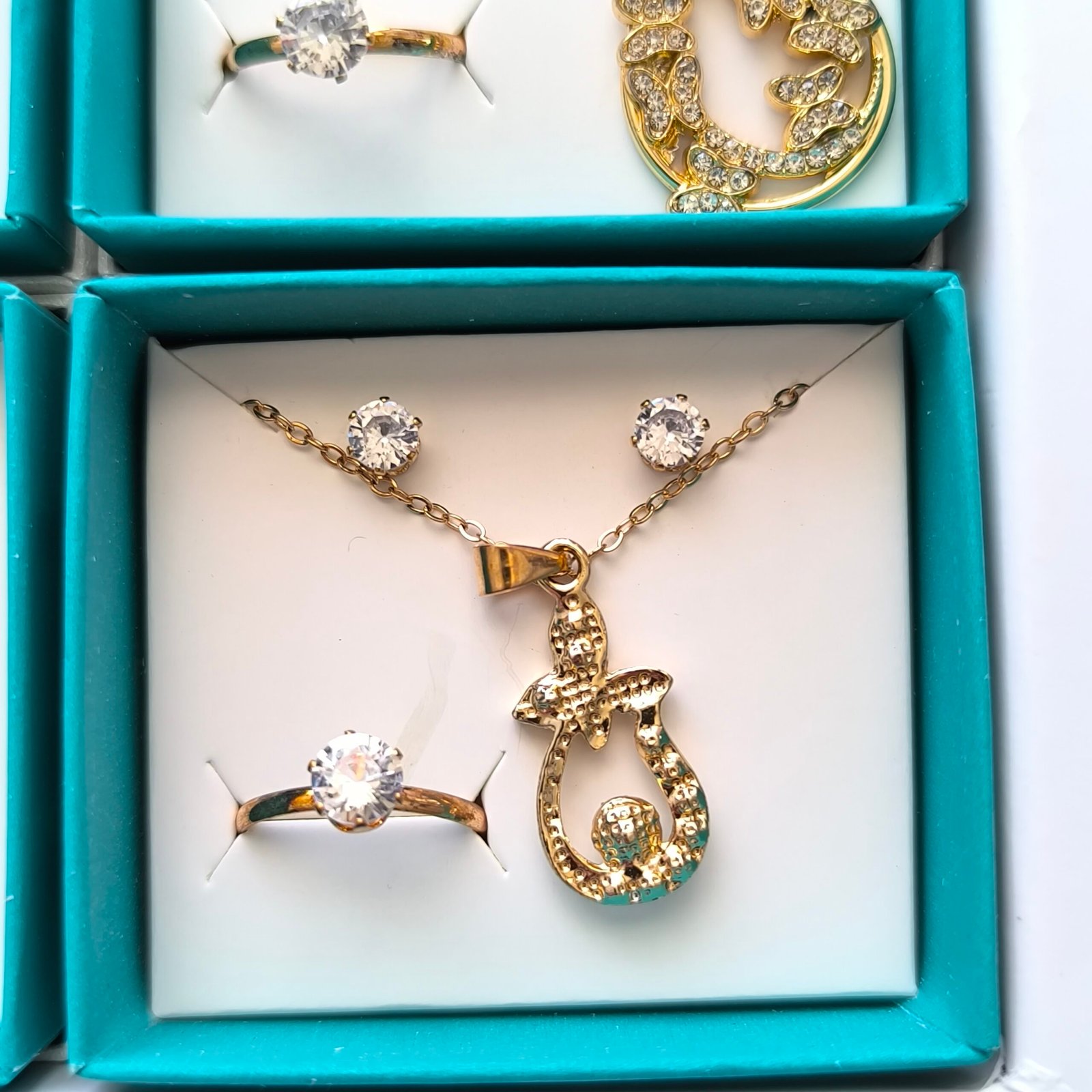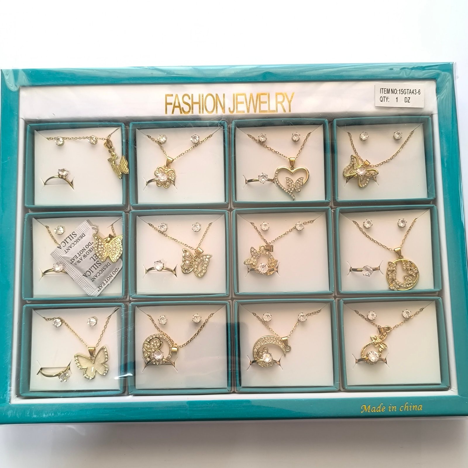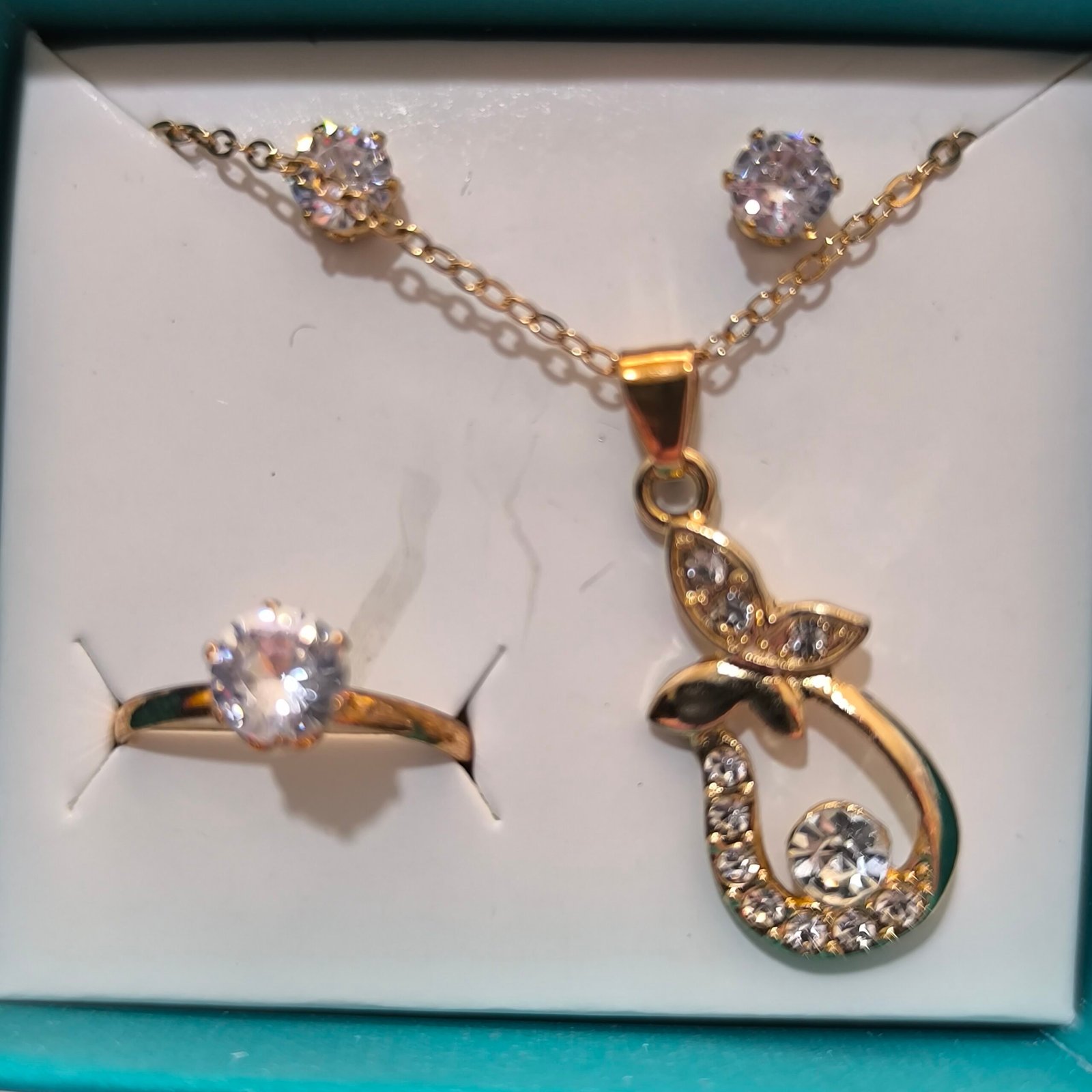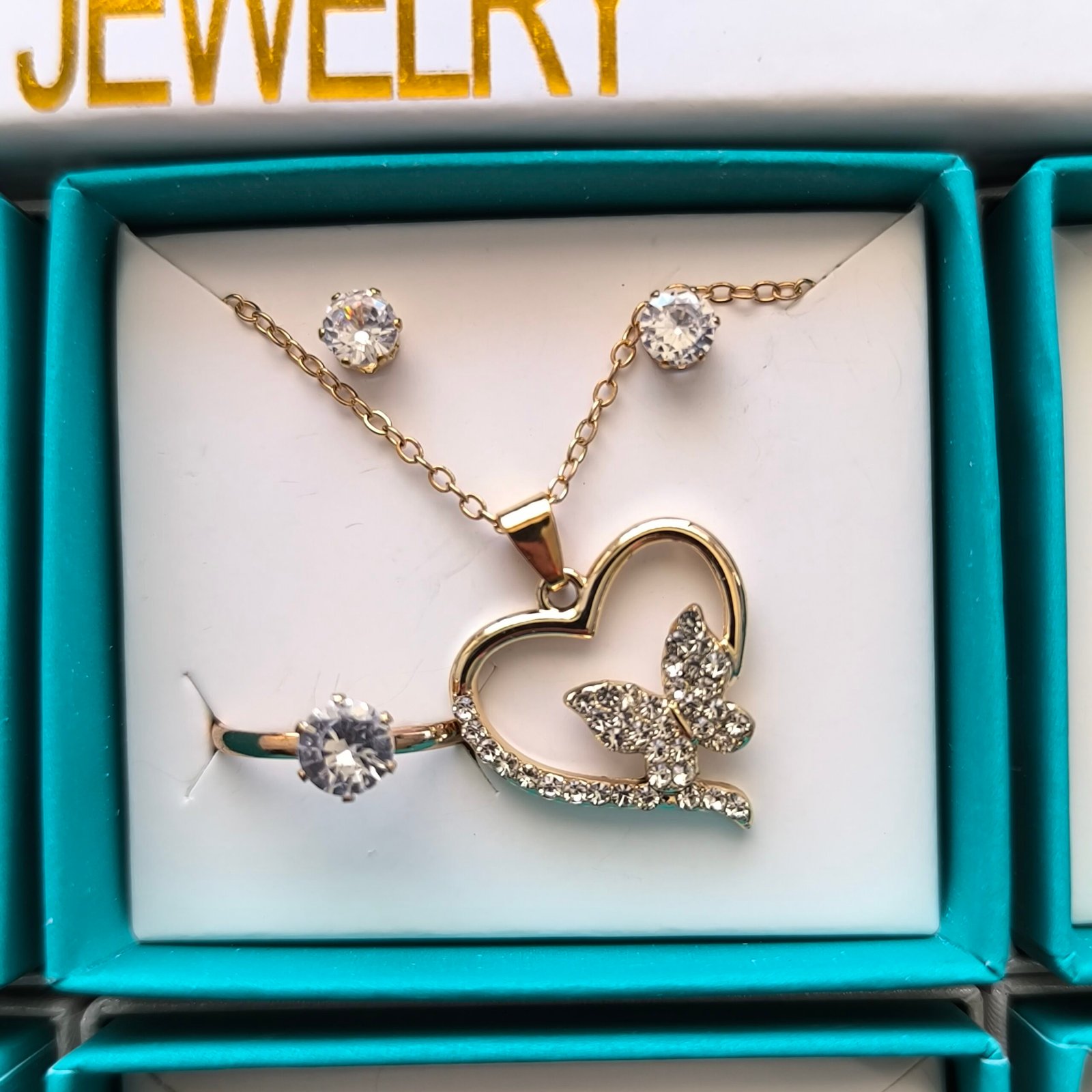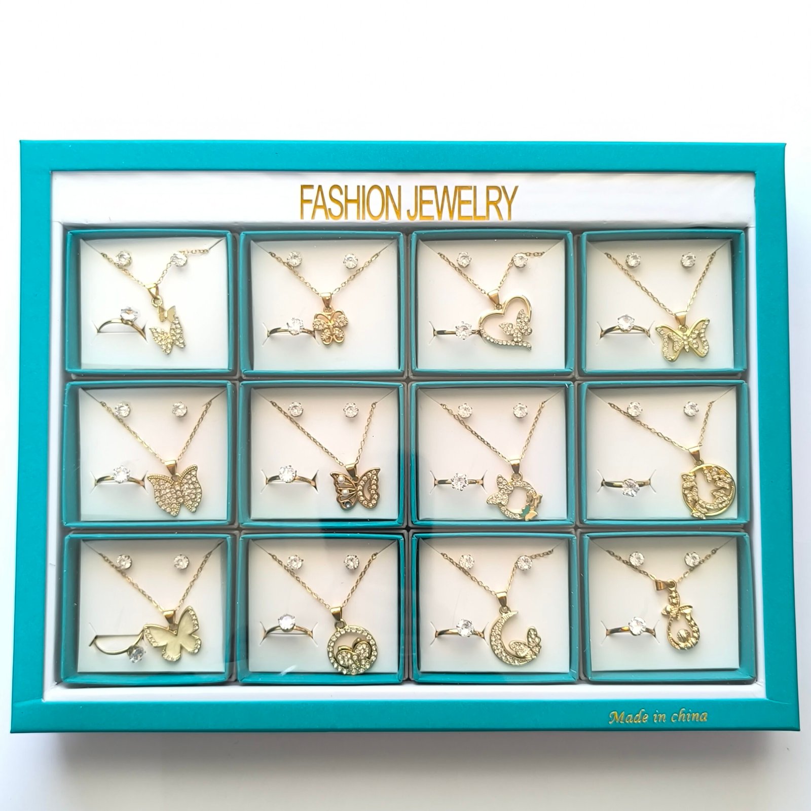 Set de joyeria femenina con collar, aretes tipo topo y anillo con piedra brillante, en diseños modernos como mariposas, corazones y figuras elegantes. Presentacion en cajita individual lista para regalo.