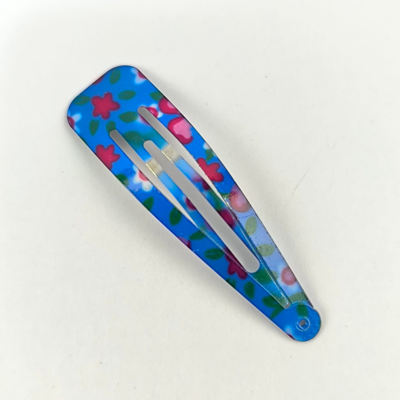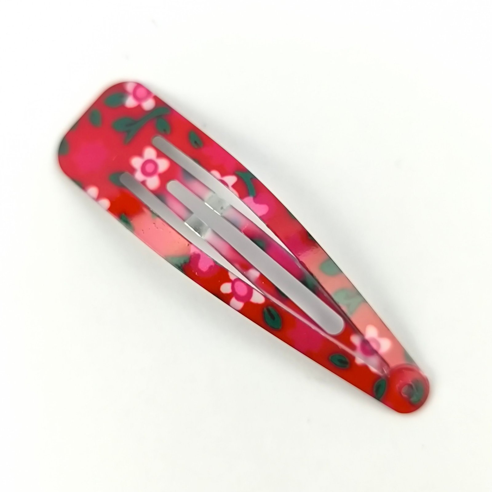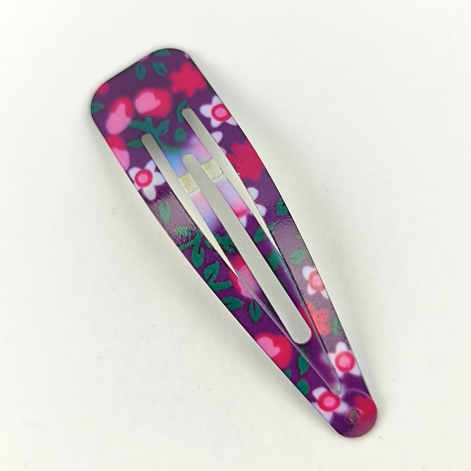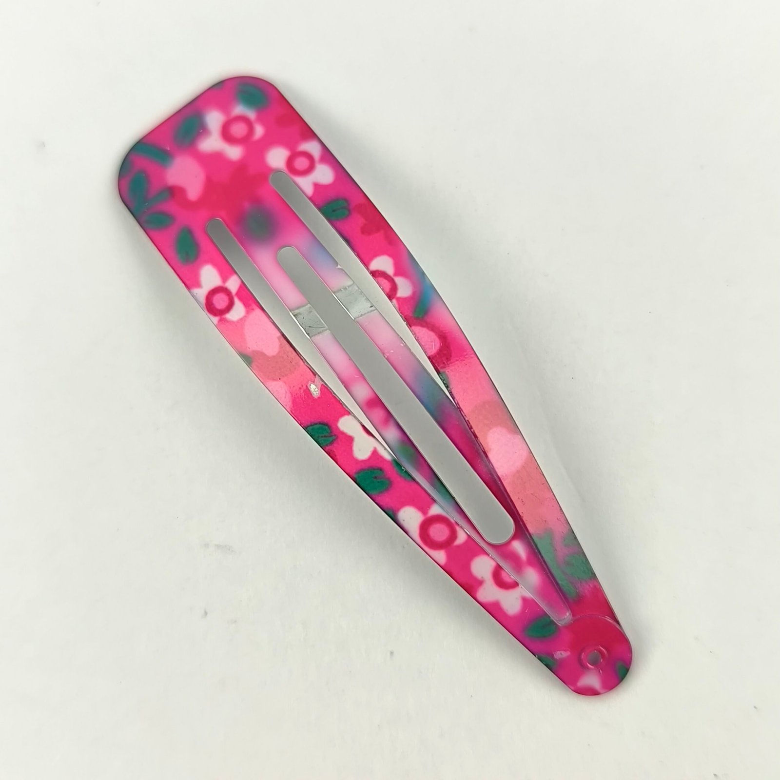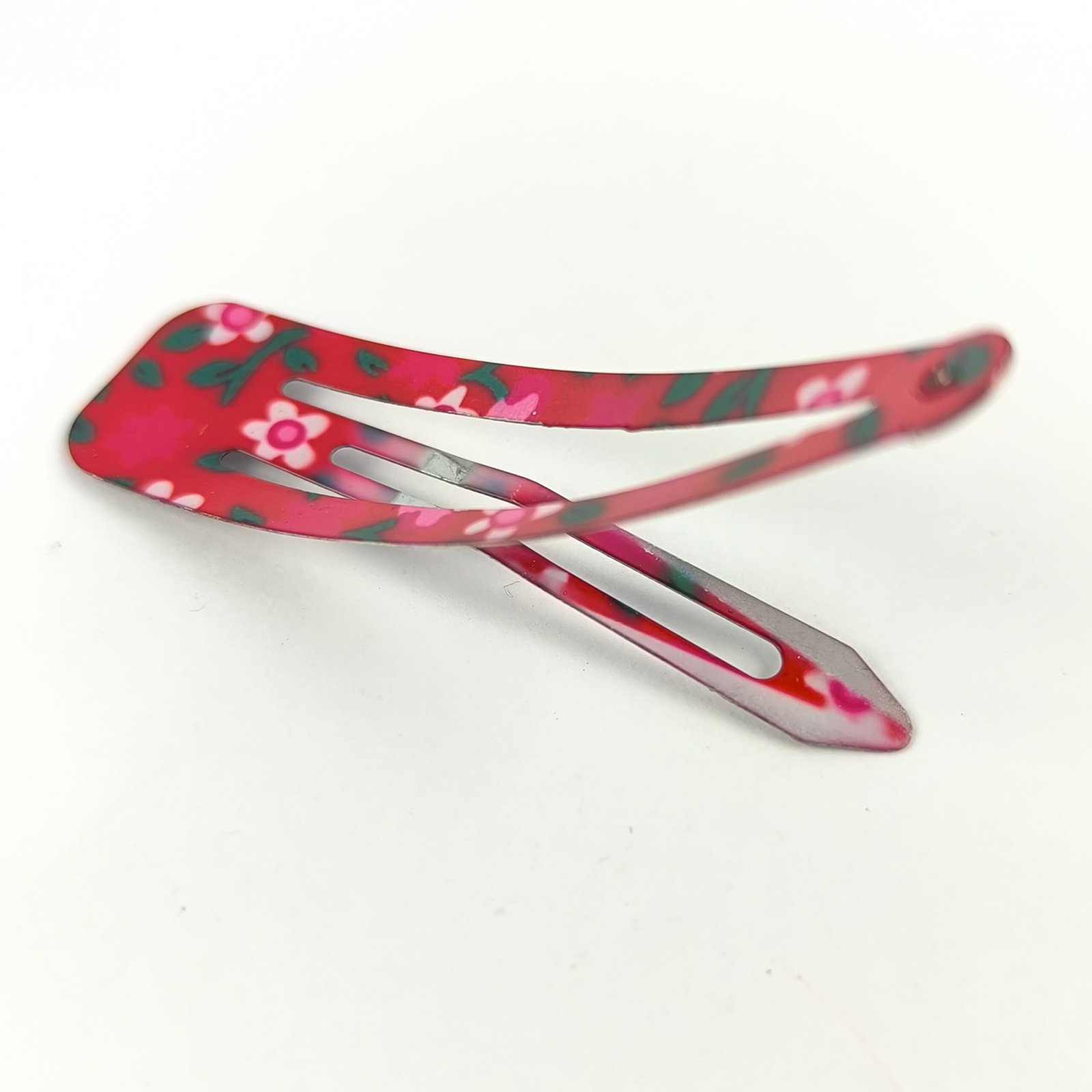 Están fabricadas en metal resistente con recubrimiento decorativo estampado. Su sistema de presión permite abrir y cerrar fácilmente la traba, asegurando el cabello sin dañarlo ni deslizarse.